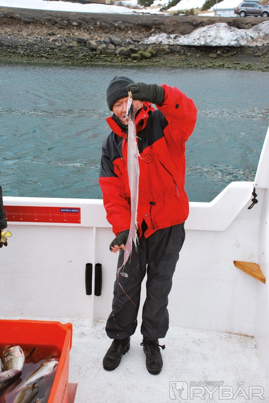 Sme asi 10 km od pobrežia. Stojíme nad hranou zvlneného plató (hĺbka 35-60 m), ktoré na západe klesá do hlbín Atlantiku, na severovýchod sa tiahnu viac ako stometrové hlbiny Isafjordu. Radek s Petrom spúšťajú ku dnu osvedčené 750 g pilkre Solvkrokken, mne ani Sašovi sa predstava vzpierania takej veľkej záťaže nepáči, a tak volíme radšej 300-gramové jigy.
