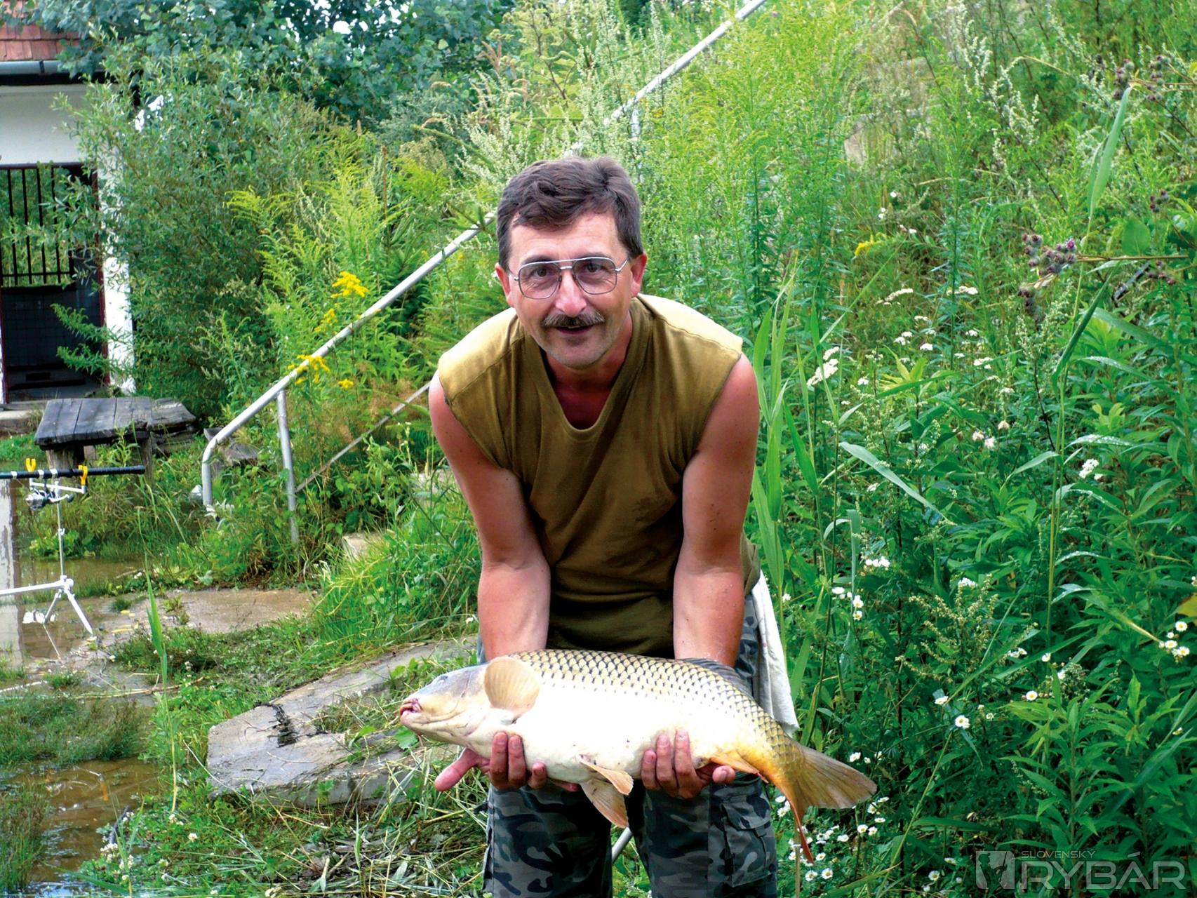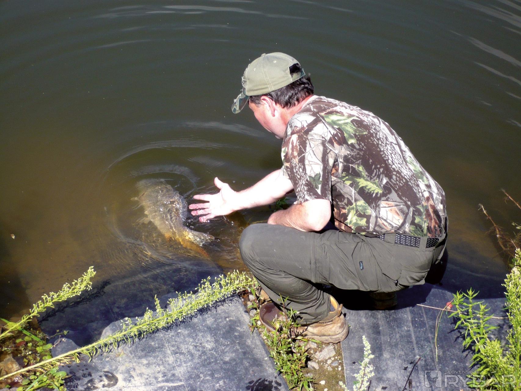 Po ďalších asi 10 minútach sa krásny kapor prvýkrát objavil na hladine, rybár v maďarčine zrejme chválil jeho bojovnosť a veľkosť. Začal ustupovať dozadu (prišiel na to, že aj takto sa to dá, bez navíjania), skúšal ako dostať tohto velikána z vody von. Na pokraji šialenstva sa mi podarilo rybu podobrať. Súkromákom zarezo-noval obrovský výkrik a výbuch radosti. Maďar ma objímal od radosti (chýbala už iba „jazýčková“) ako svoju manželku, potľapkával po pleci, za dobre odvedenú prácu. Kapor mal tuším viac ako 9 kíl, bol to jeho najväčší. Vysvetlil mi, že zabral na „kukoricu“ vo vanilkovom náleve a ešte dlho mi ukazoval iné druhy a snažil sa vysvetliť, ktoré sú kedy účinné. Poblahoželal som mu a odišiel späť na svoje miesto.