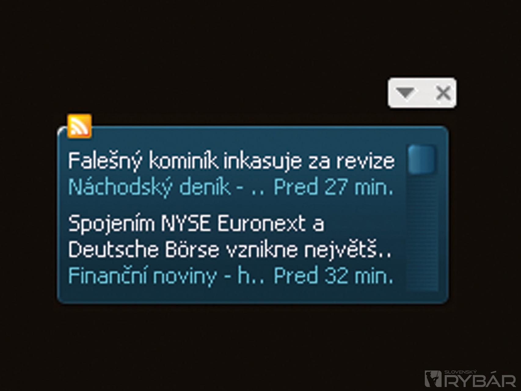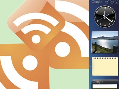 Kliknutím na nainštalovaný Google Desktop sa v pravej časti pracovnej plochy zobrazí panel, kde sa, okrem iného, nachádzajú aj 2 okná s aktuálnymi správami, pričom na jednom z nich je oranžová ikona RSS.