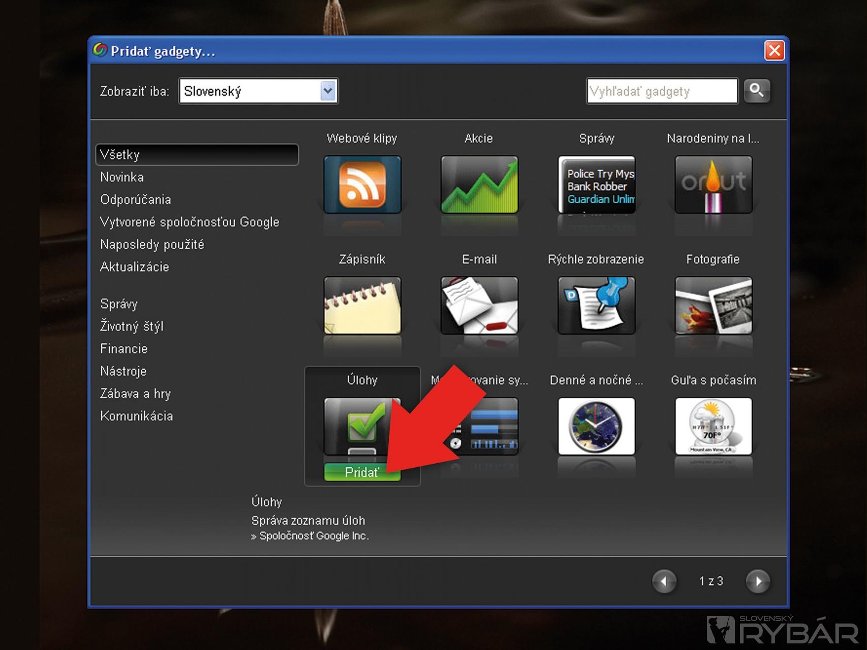 Ak chcete nájsť aj ďalšie gadgety (moduly, ktoré rozšíria vašu pracovnú plochu napríklad o kalendár či o počasie), kliknite na tlačidlo „ “ v hornej časti bočného panela, alebo z ponuky vyberte možnosť „Pridať gadgety“. Keď nájdete požadovaný gadget, presuňte naň kurzor myši a kliknite na tlačidlo „Pridať“.