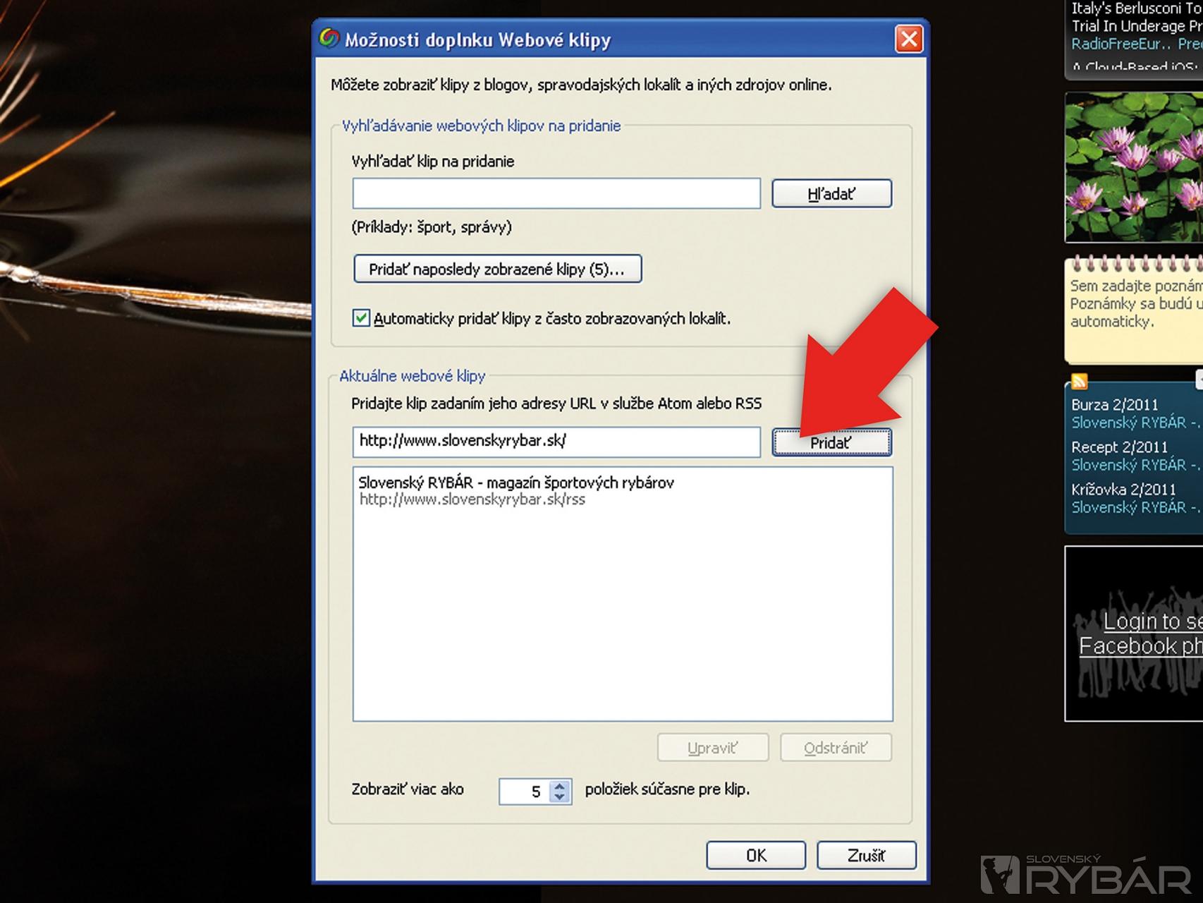 Do dialógového okna “aktuálny webový klip” zadajte našu URL adresu www.slovenskyrybar.sk, stlačte “pridať” a následne “ok”