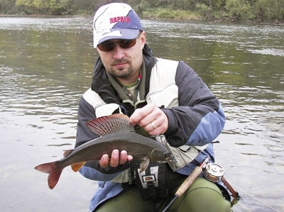 S roztrasenými rukami som vymenil svoje mušky na udici za jeho. Podišiel ku mne a začal ma smerovať, kde mám nahodiť a čo mám robiť. Zrazu: bác! Záber! Krásny lipeň bojoval, kým som ho nepodobral. O chvíľku ďalší! V tej chvíli som sa ocitol na prahu neba.