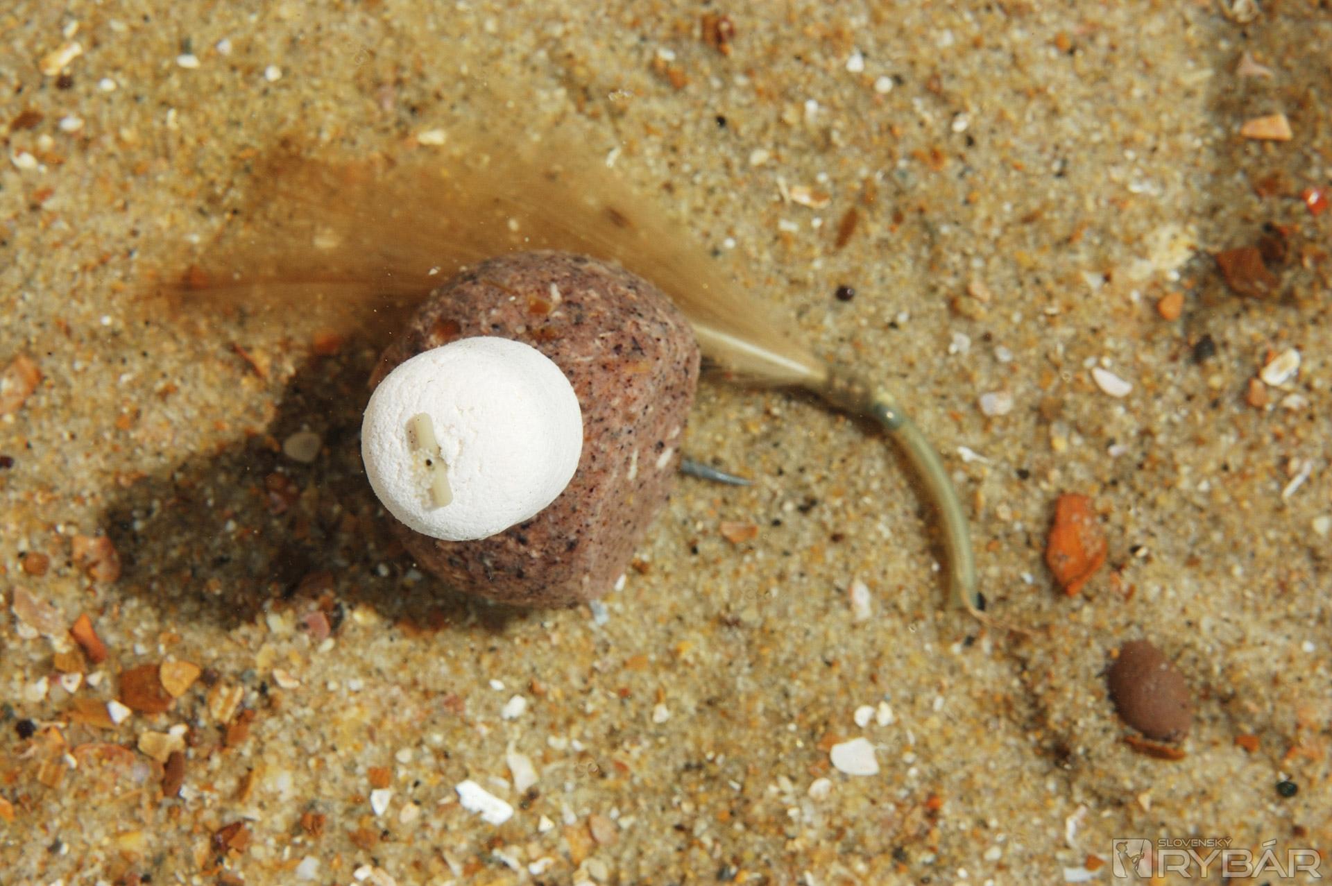 Následne mi ukázal veľmi šikovný trik. Vzal si kŕmnu raketu a nahodil k vyhadzujúcim sa kaprom hrsť partiklu. Zaklipoval silón a prehodil na rovnaké miesto ešte zo dva razy. Následne na koniec asi metrového kusa tenkého silónu uviazal háčik na povrchové nástrahy Choddy, veľkosť 8, a napichol naň dve zrnká umelej kukurice. Celú montáž uviazal o obratlík klasickej kŕmnej rakety a opatrne ju do nej napchal. Potom prehovoril: „Bruno, si pripravený?“