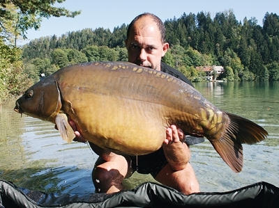 Celé publikum reve: „Big, gigant“... atď. Mne práve do smiechu však nie je. Lapám po dychu, hádžem prút na baitrunner a plávam späť ku kaprovi, aby som mal pevnú zem pod nohami. Využívam pauzu v boji, aby som sa priblížil k podberáku, ktorý trochu odplával. Potom zase pokračujem v boji. Kapor to už má za sebou, necháva sa priviesť do podberáka a ja za veľkého potlesku zatváram pascu.