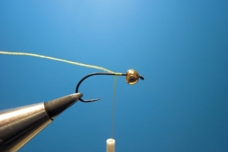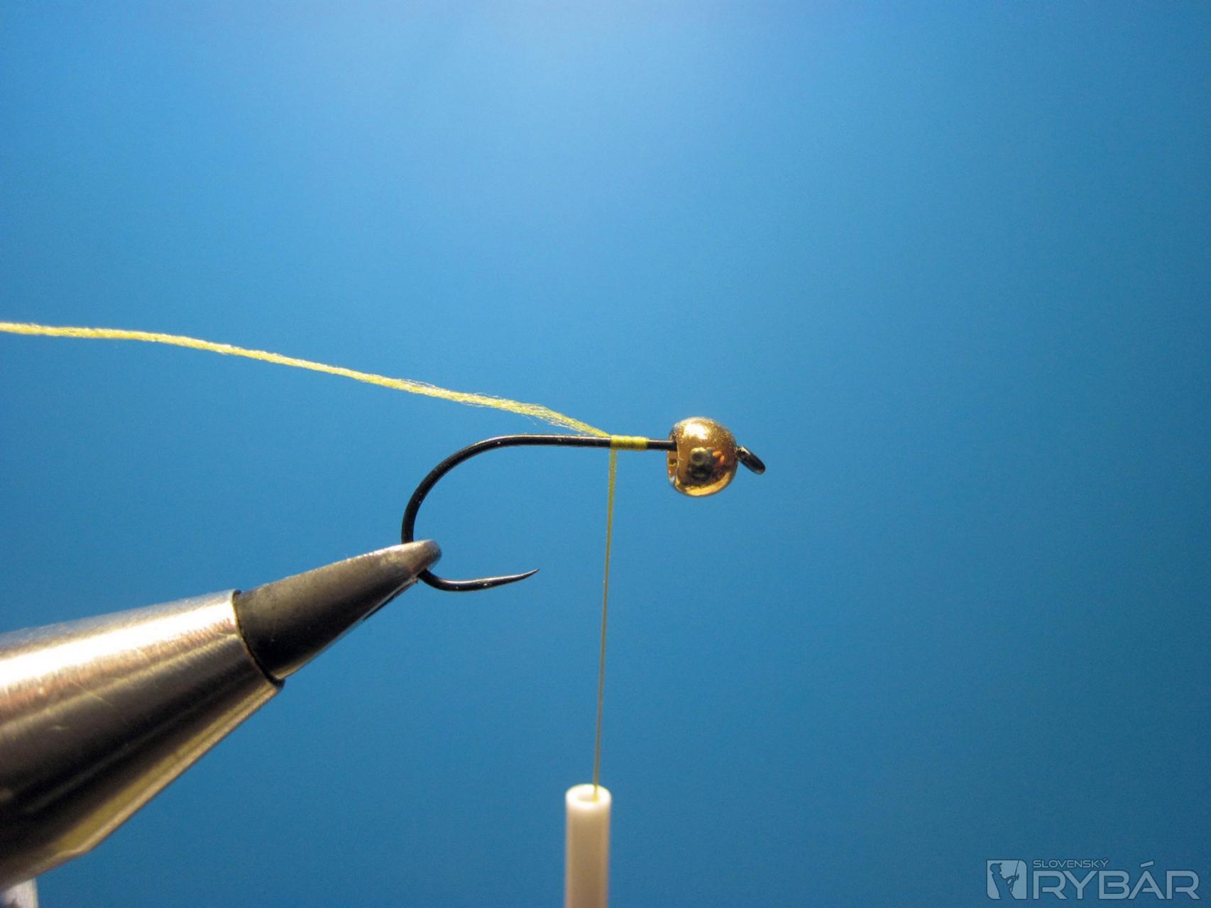 Na háčik navlečieme zlatú guľôčku, háčik upneme do zveráčika a naviažeme viazaciu niť.