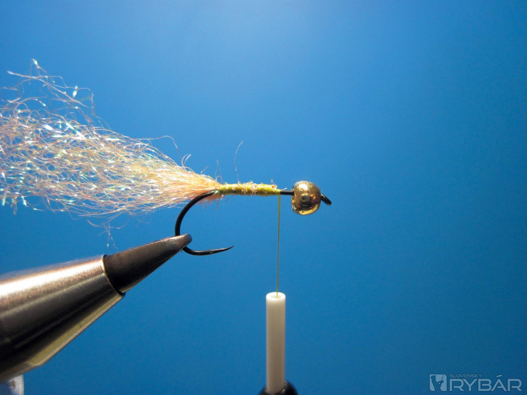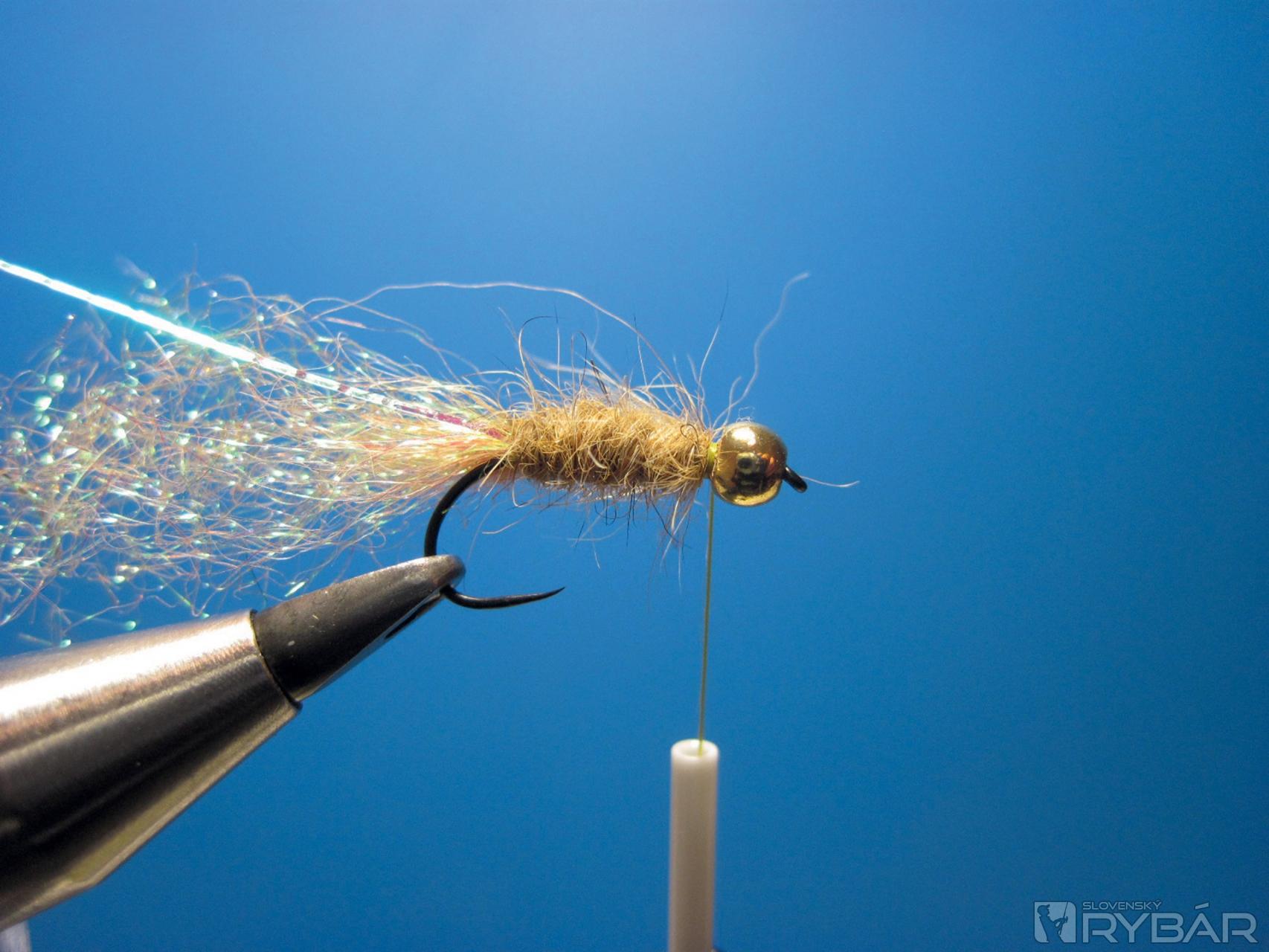 Druhá viazacia technika na telíčko je klasický dabing do slučky. Pri tejto muške je väčšinou výhodnejšia, pretože potrebujeme mať telíčko objemné a dabovaním do slučky to docielime lepšie. Vždy záleží na dabingu, ktorý si na telíčko zvolíte. Zladenie farby tipu a telíčka je veľmi významné. Do čistej vody používam tmavšie odtiene, naopak z jari, keď je voda mierne zakalená, farby svetlých pastelových odtieňov.