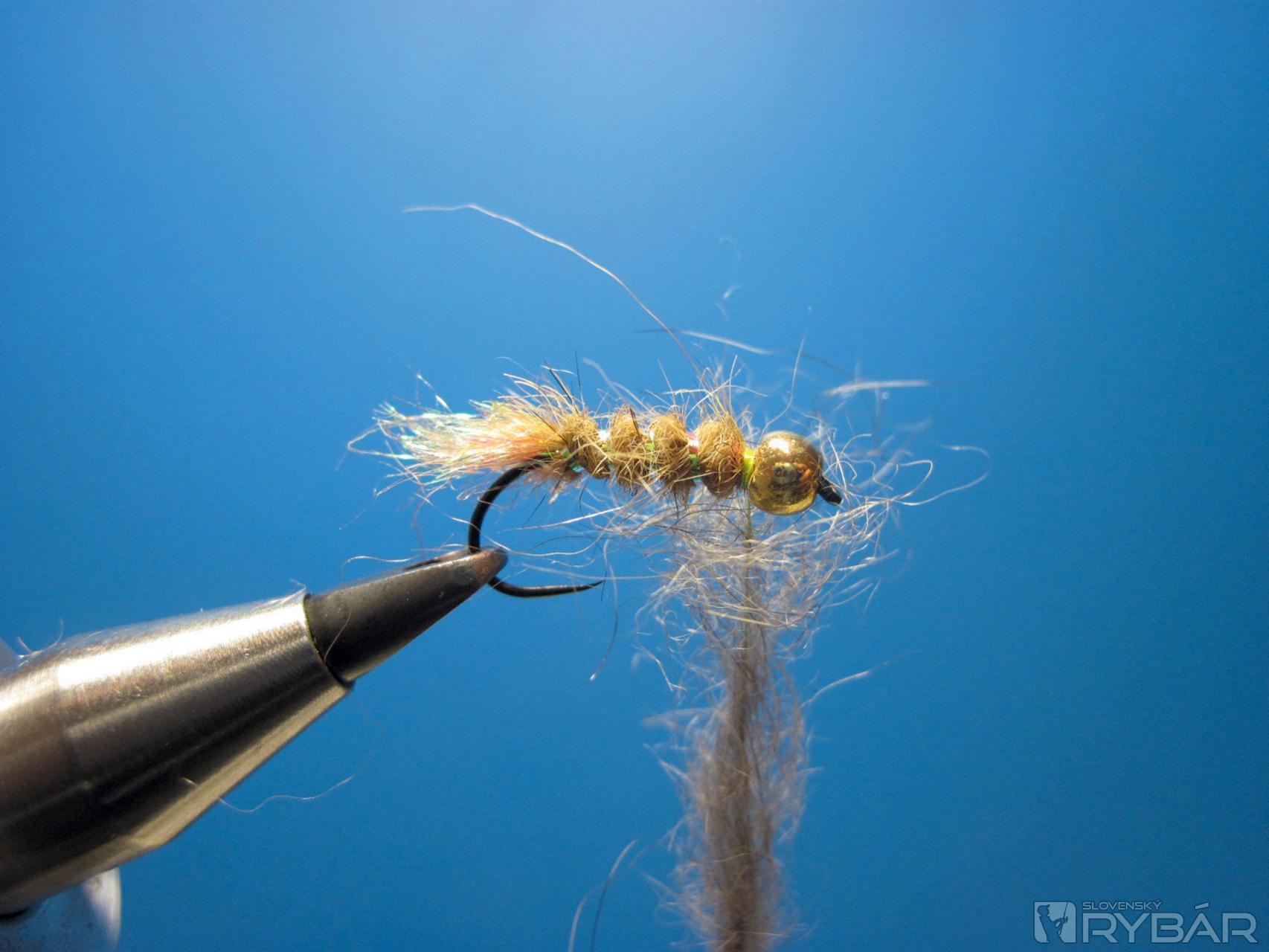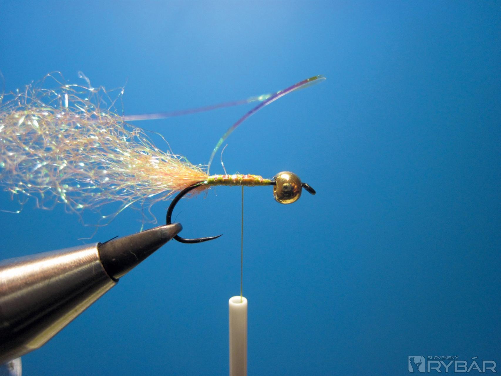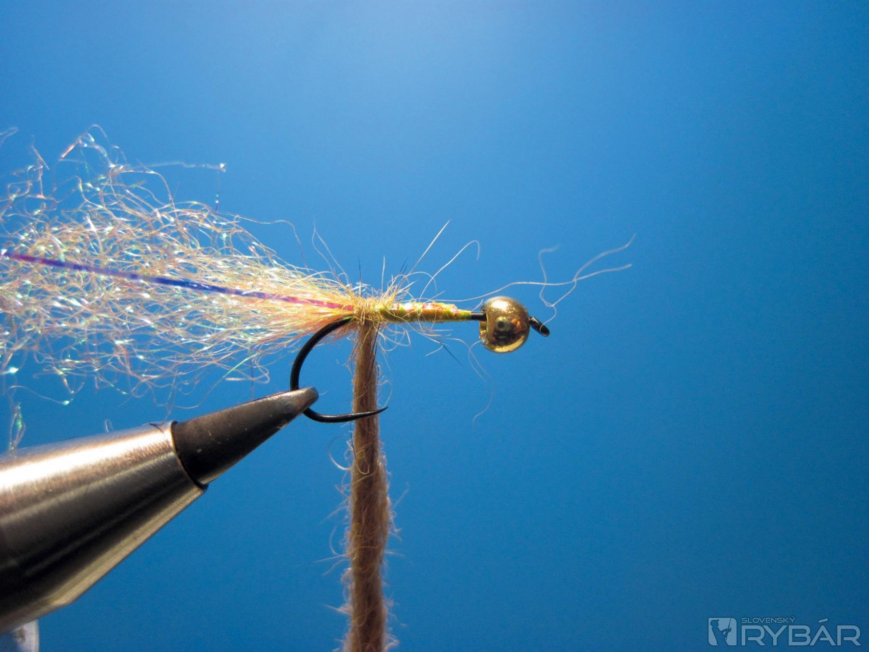Úplne univerzálne sú perleťové lametky, tie sú čiastočne priehľadné a ľahko sa nechajú po navinutí na ramienko háčika podfarbiť telíčkom. Pri tomto type nymfy sa, naopak, snažím, aby krúžkovanie iba zvýraznilo telíčko a podfarbilo ho. Určite odporúčam si tieto mušky vyskúšať vo verzii nymfa a tiež v lete na biele ryby ako suchého chrobáčika alebo potočníka.