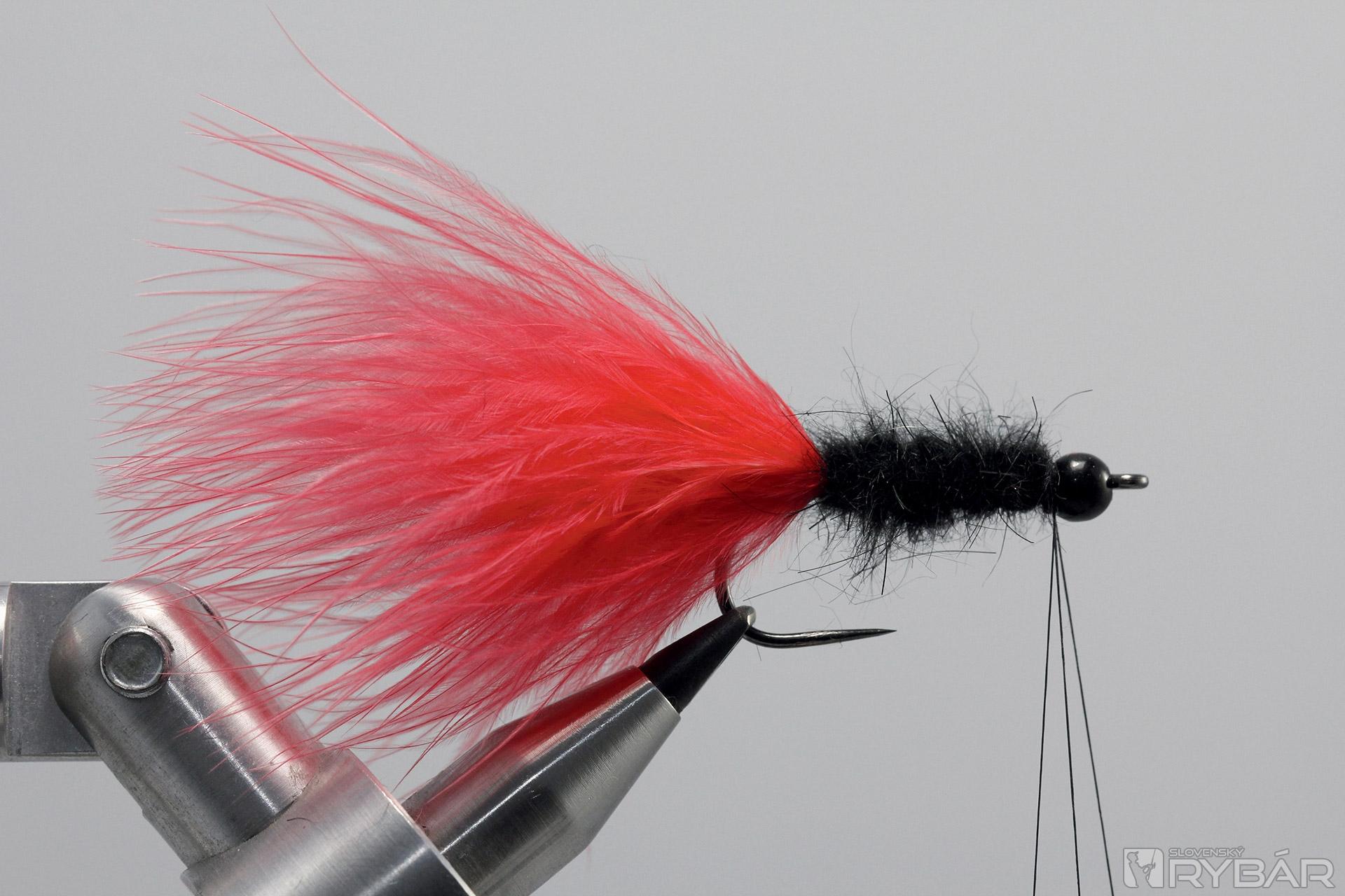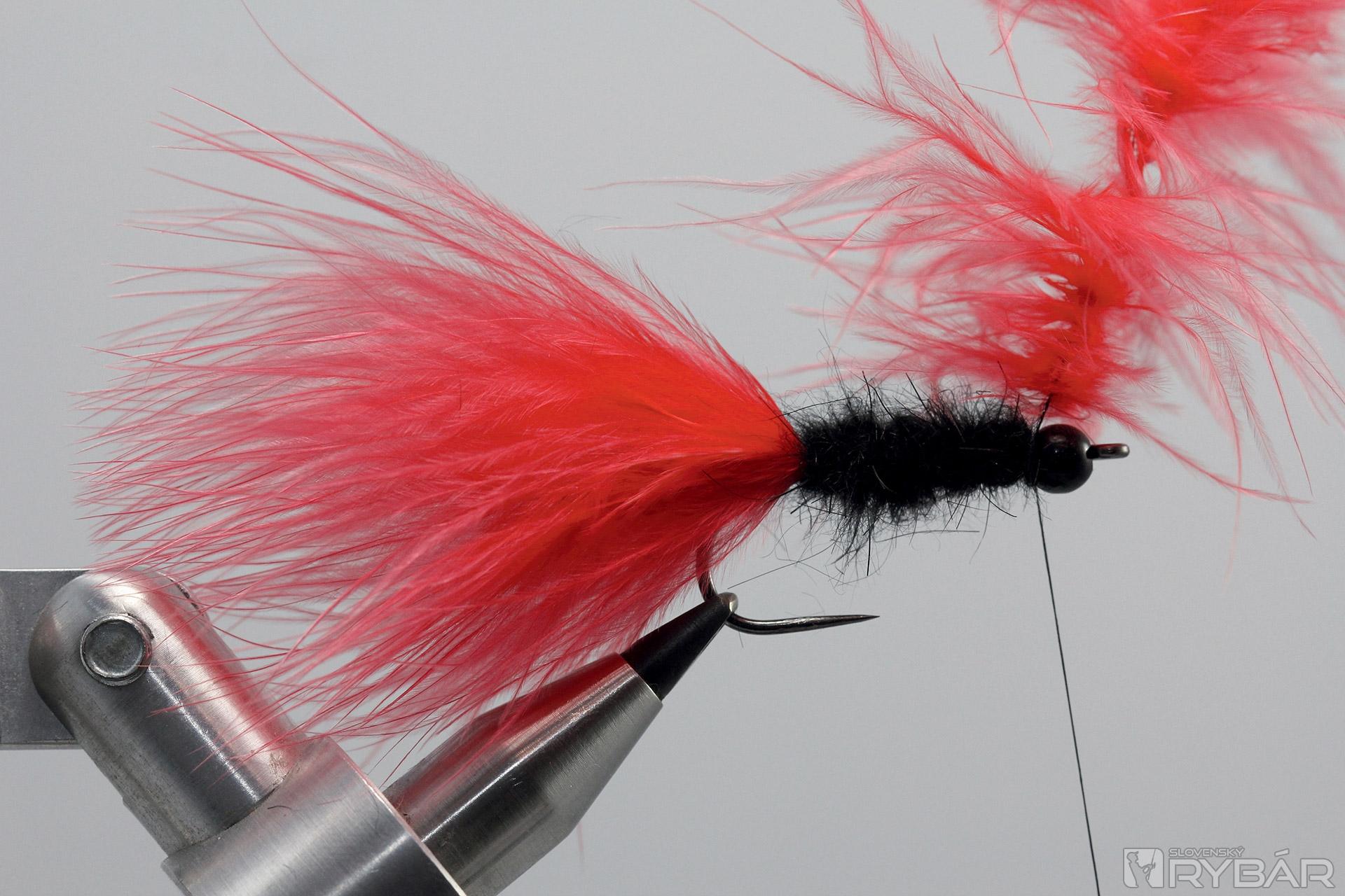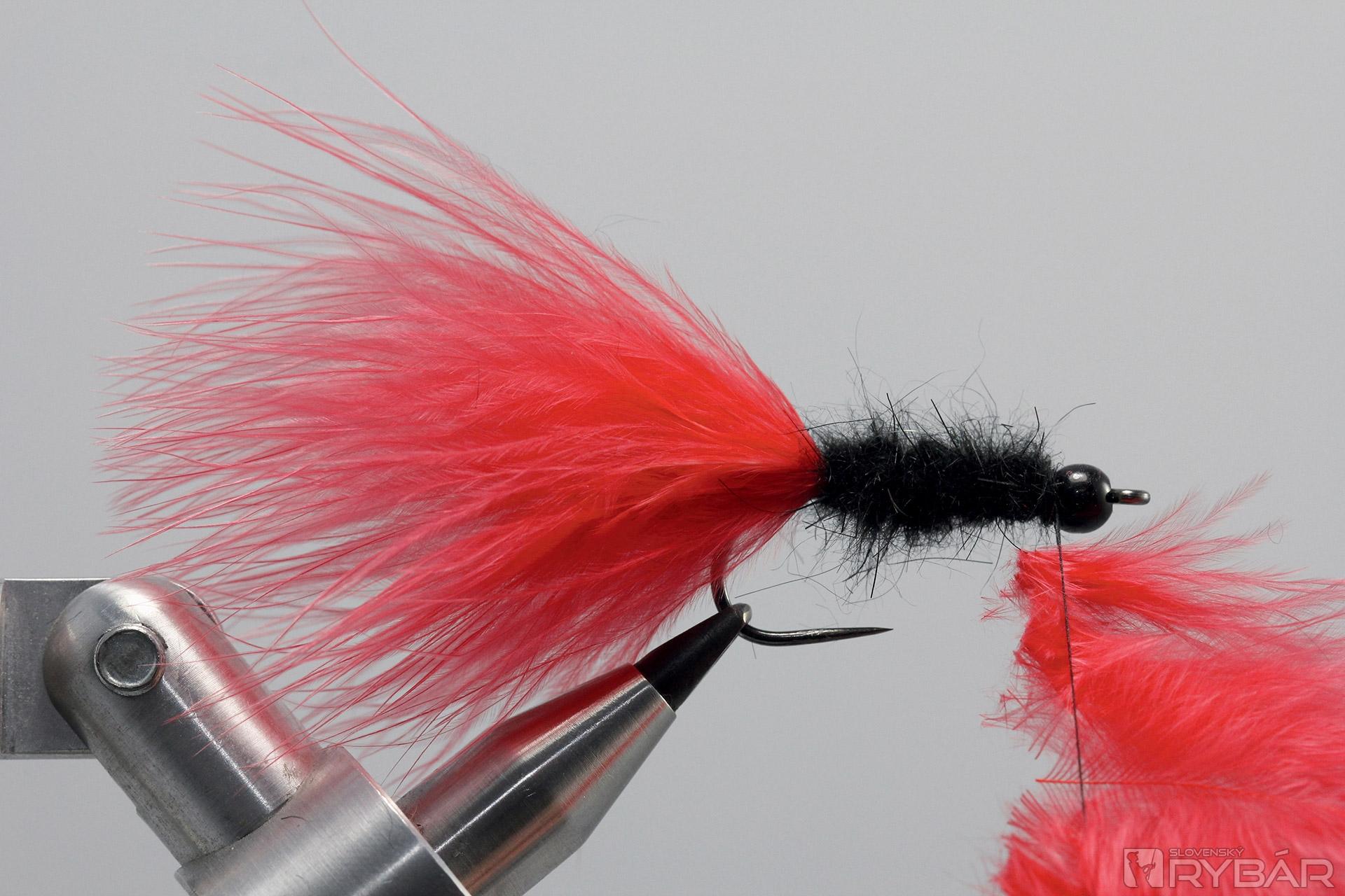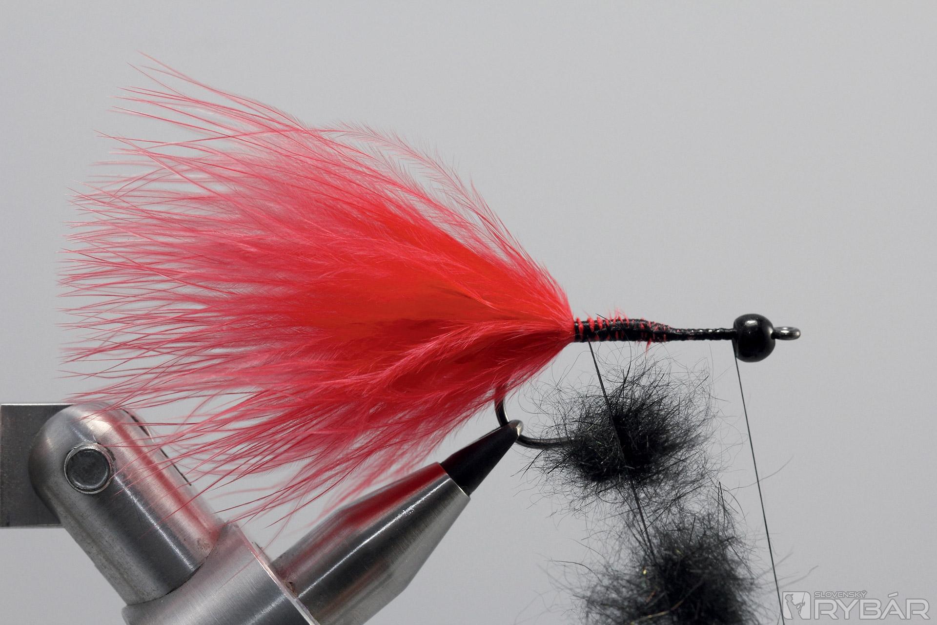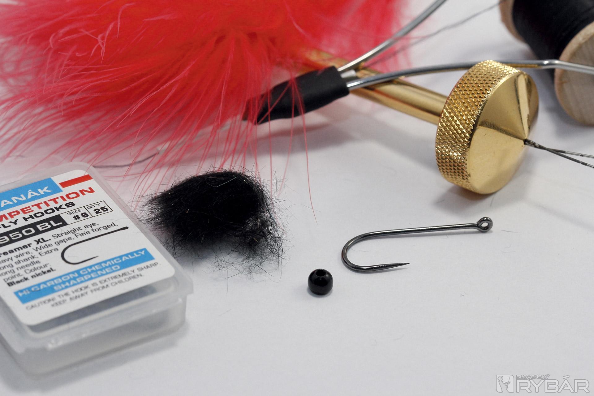 strímrový háčik (veľ. 6), volfrámová guľôčka (4,6 mm), červené perie marabou, čierny prírodný dabing, čierna viazacia niť, rotačný dabovač