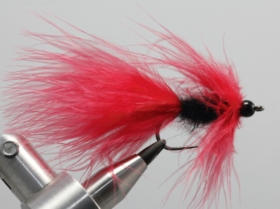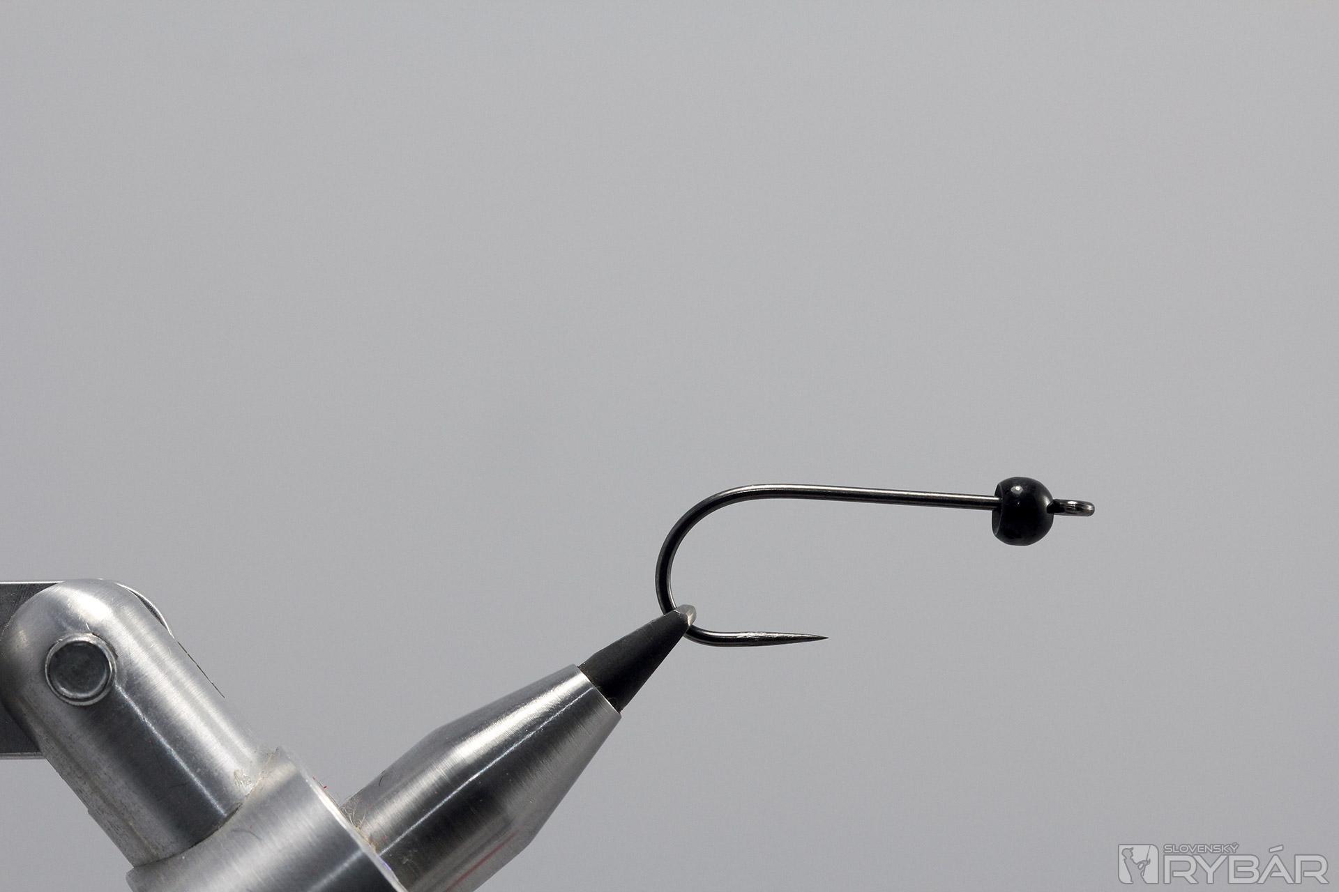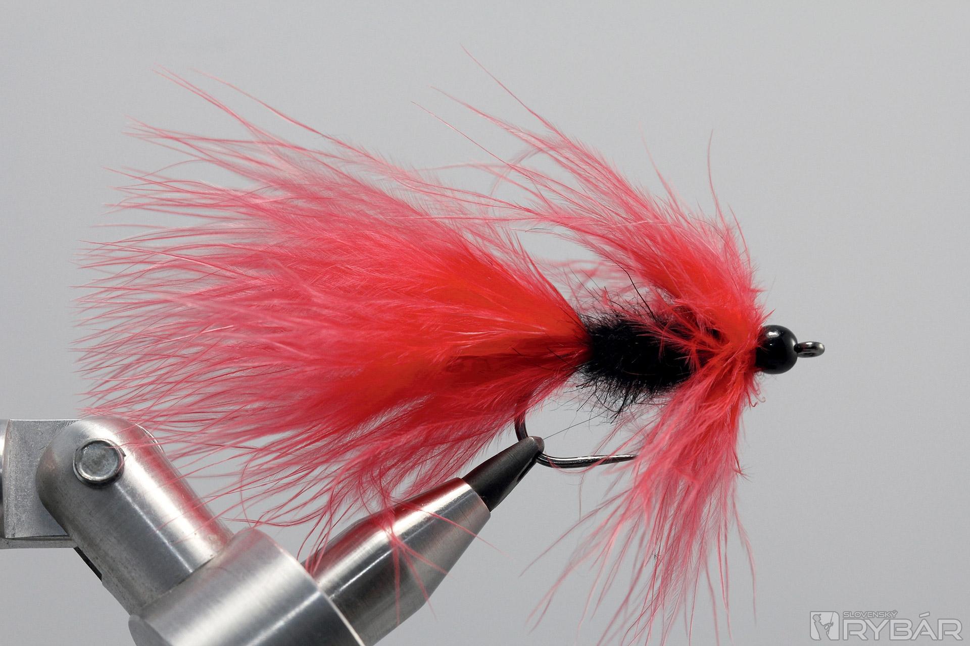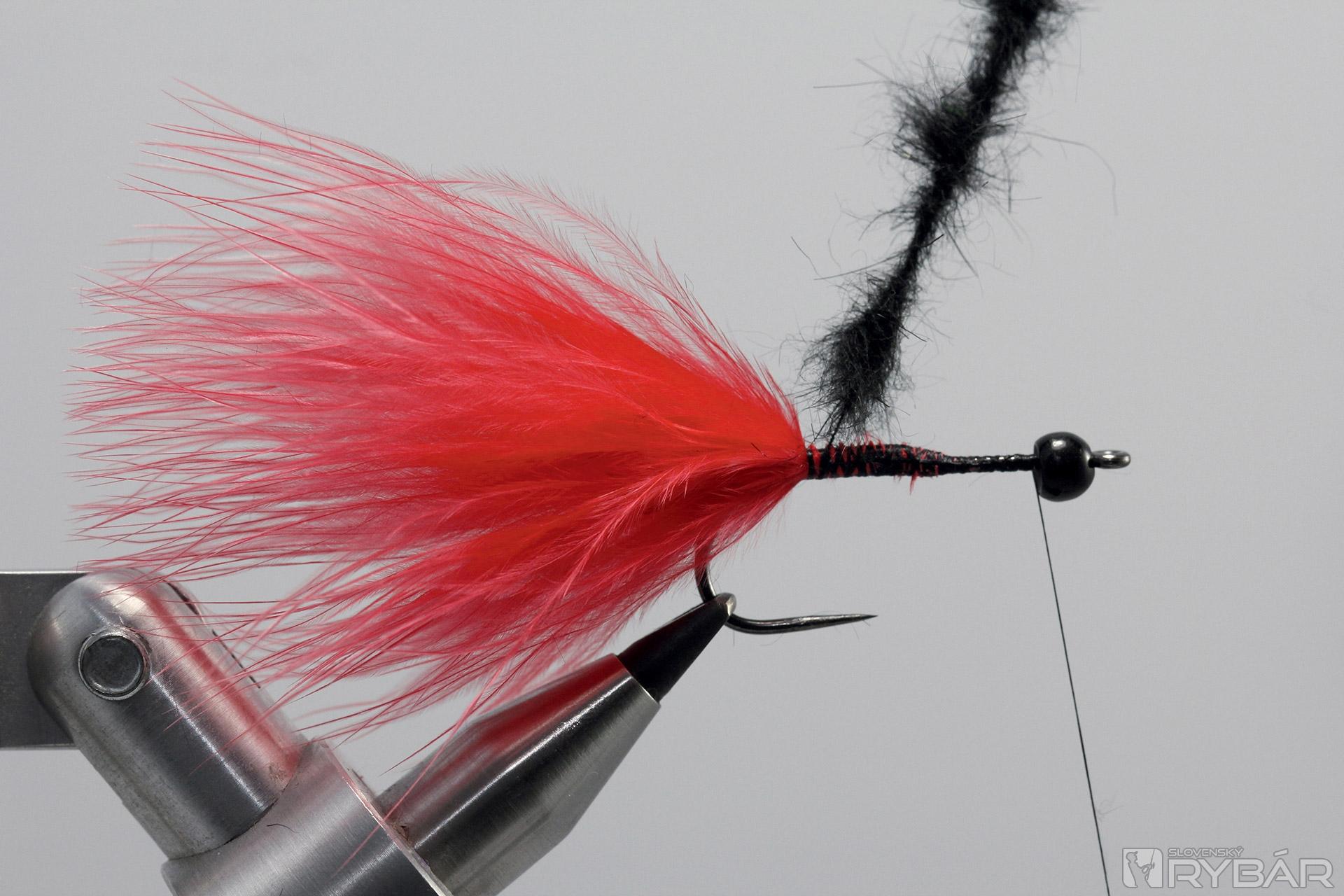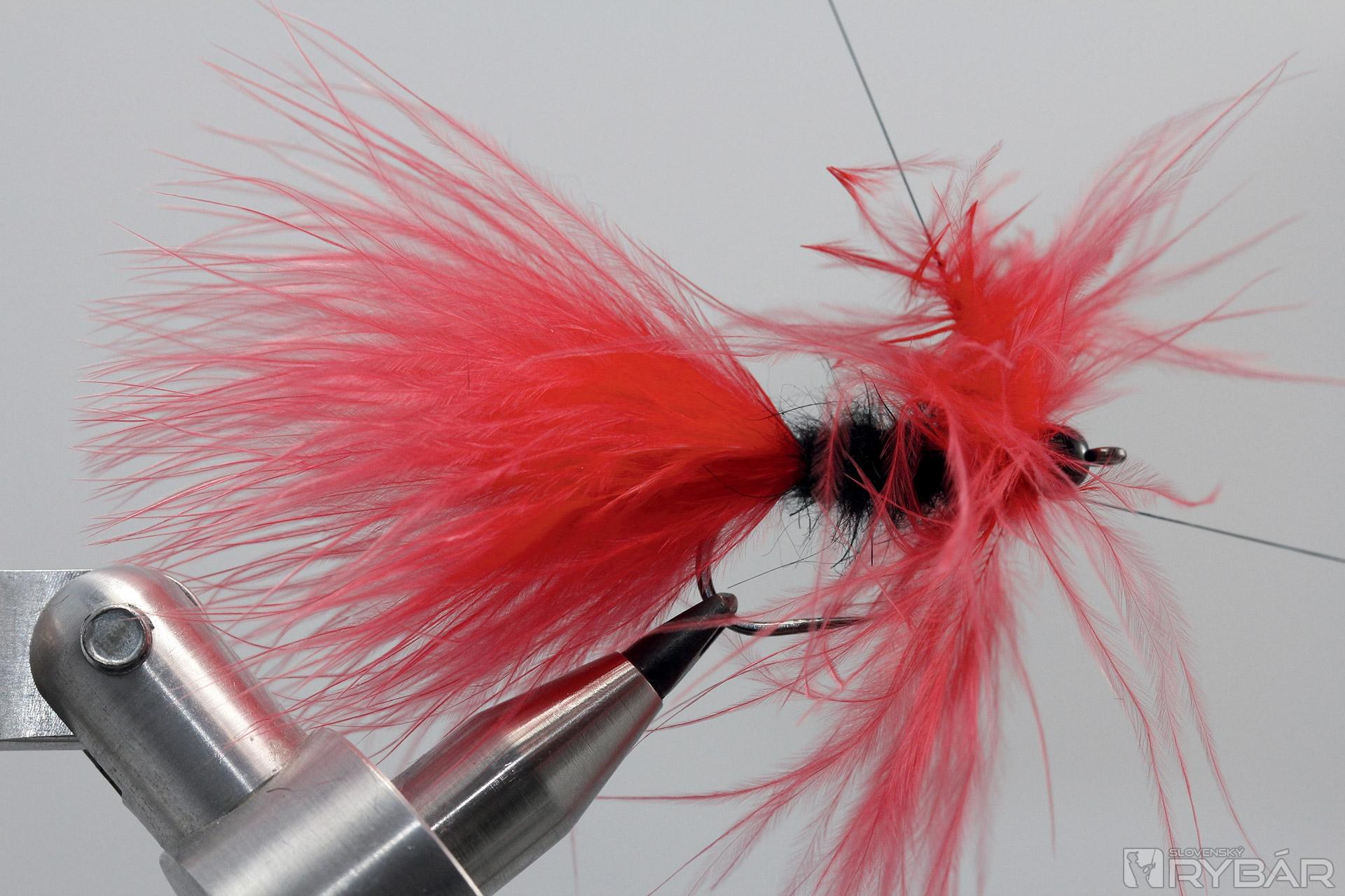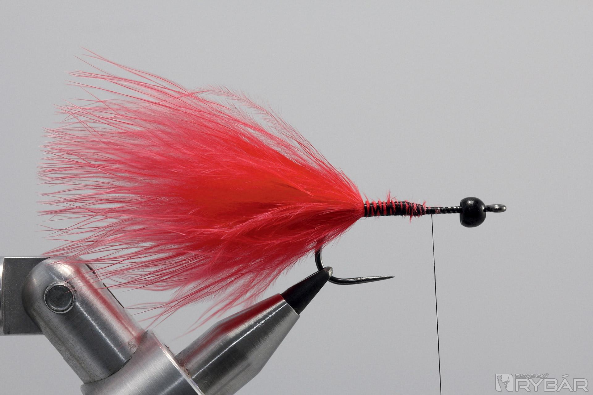 strímrový háčik (veľ. 6), volfrámová guľôčka (4,6 mm), červené perie marabou, čierny prírodný dabing, čierna viazacia niť, rotačný dabovač