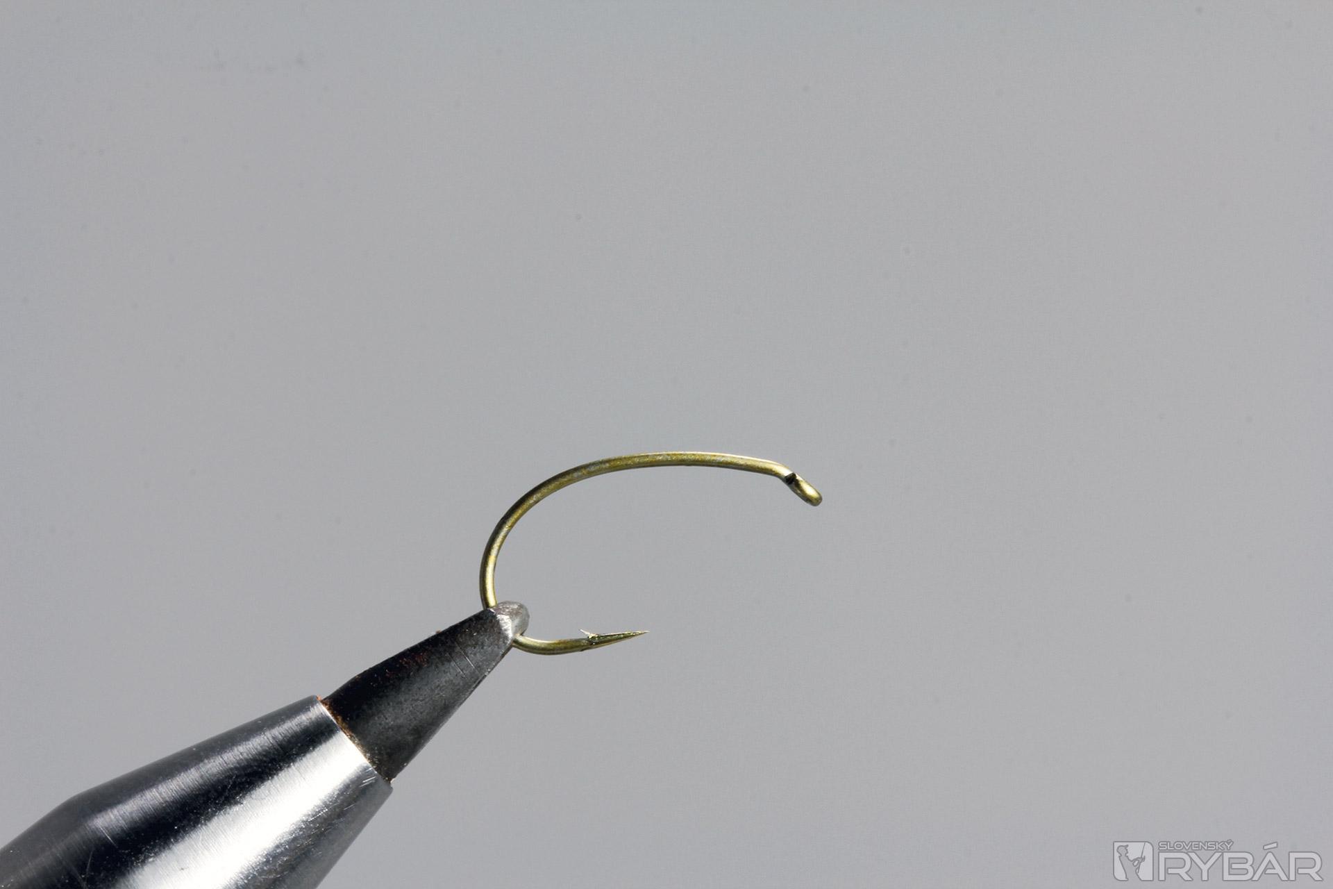krivákový háčik (ideálne z tenkého drôtu), čierna viazacia niť, polycelón, perie CDC, pierko z grizzly kohúta, microfibets (ja som na tento vzor použil olivové a nafarbil ich čiernou liehovou fixou).