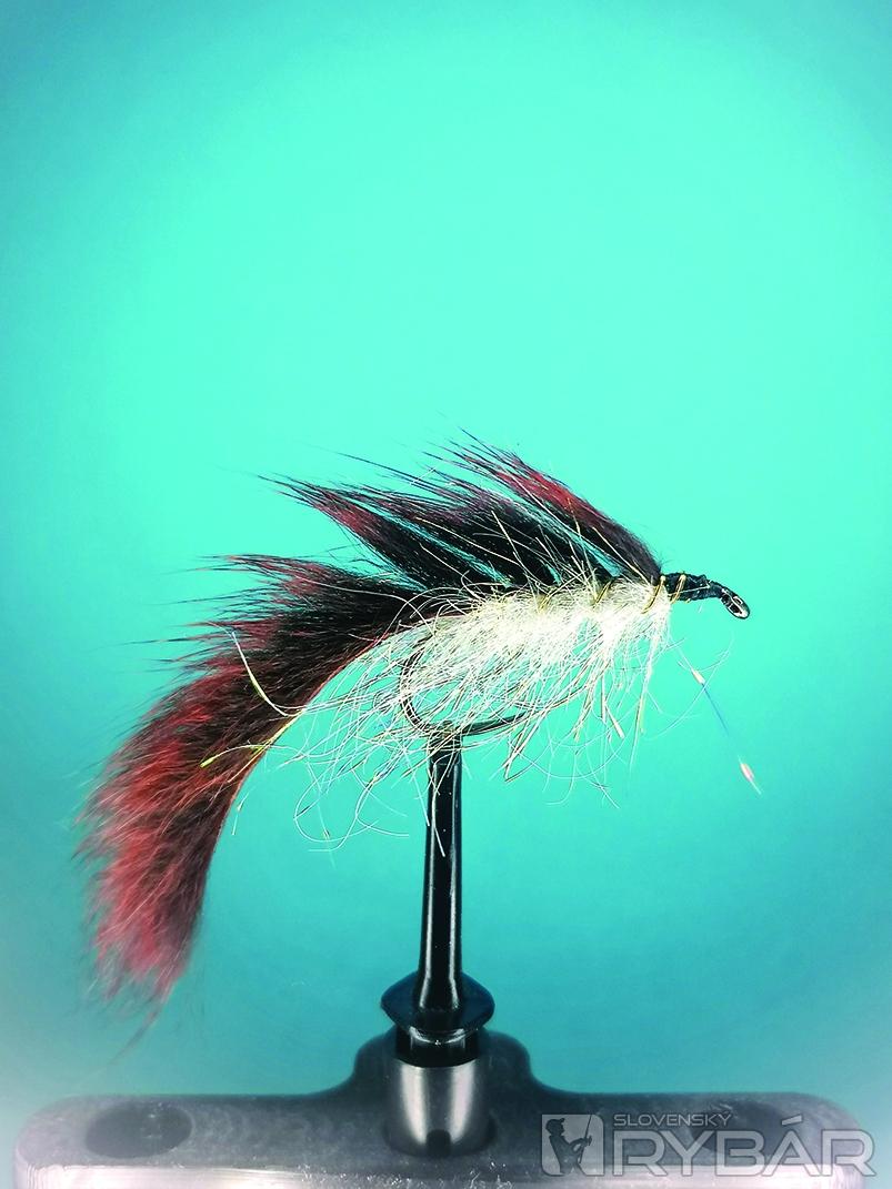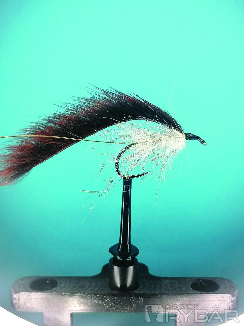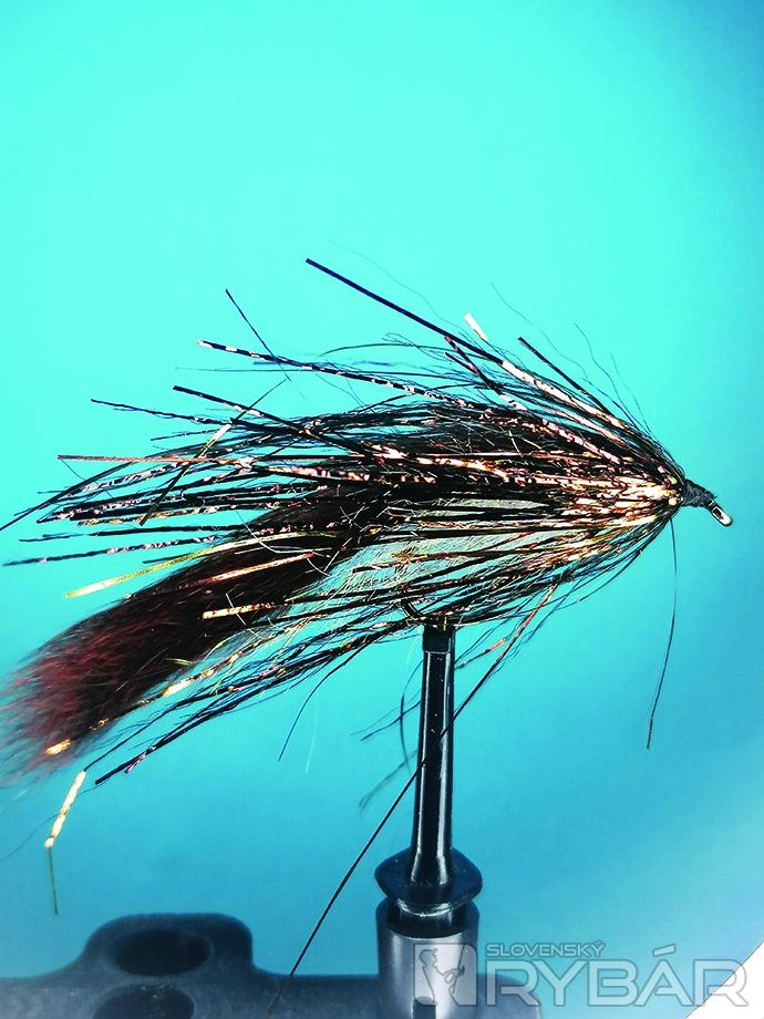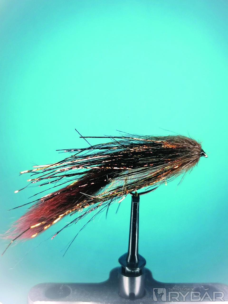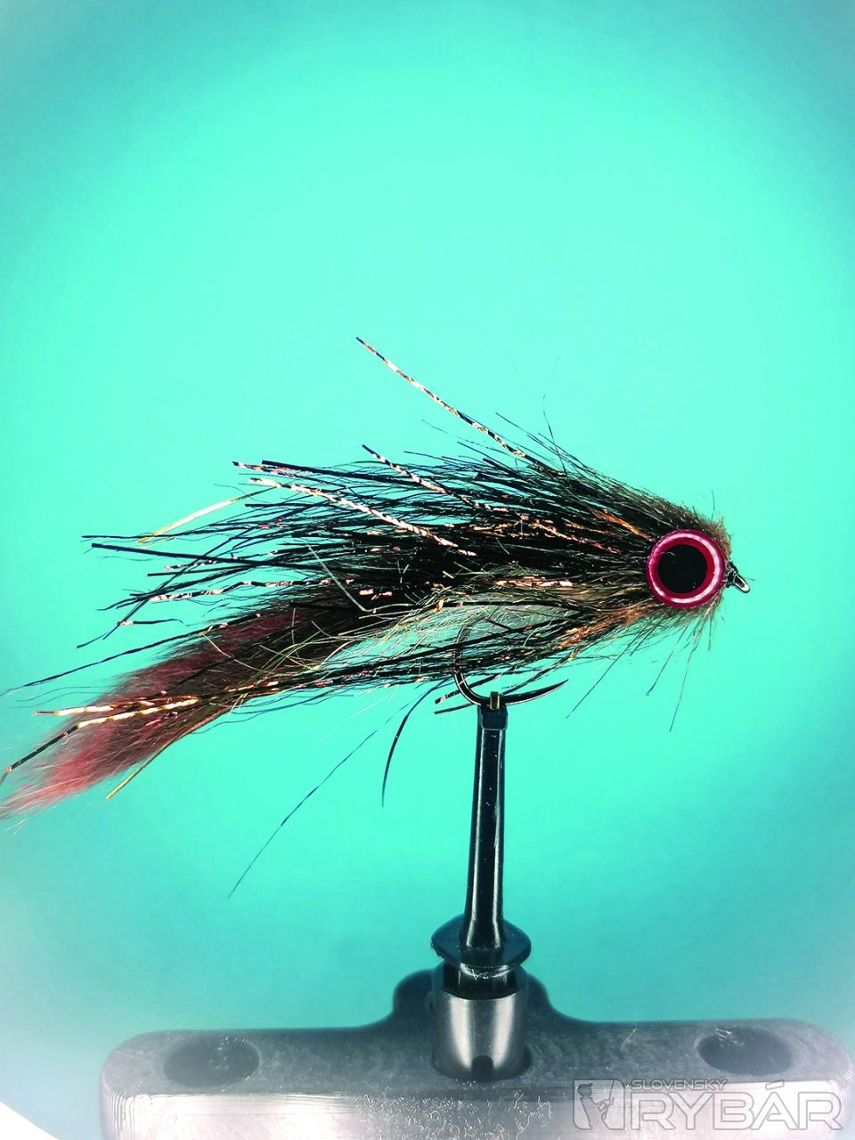 Použitý materiál: zonker pásiky, háčik S 6, tmavohnedé furabu, Ice Dubbing, tmavomedené flashabou, čierna nitka, oči, zlatý drôtik.