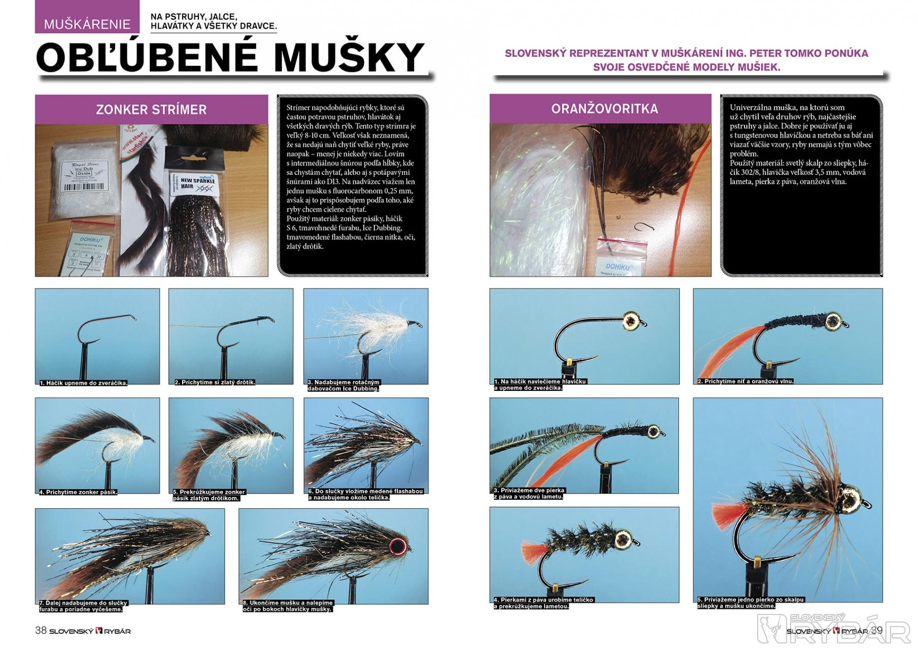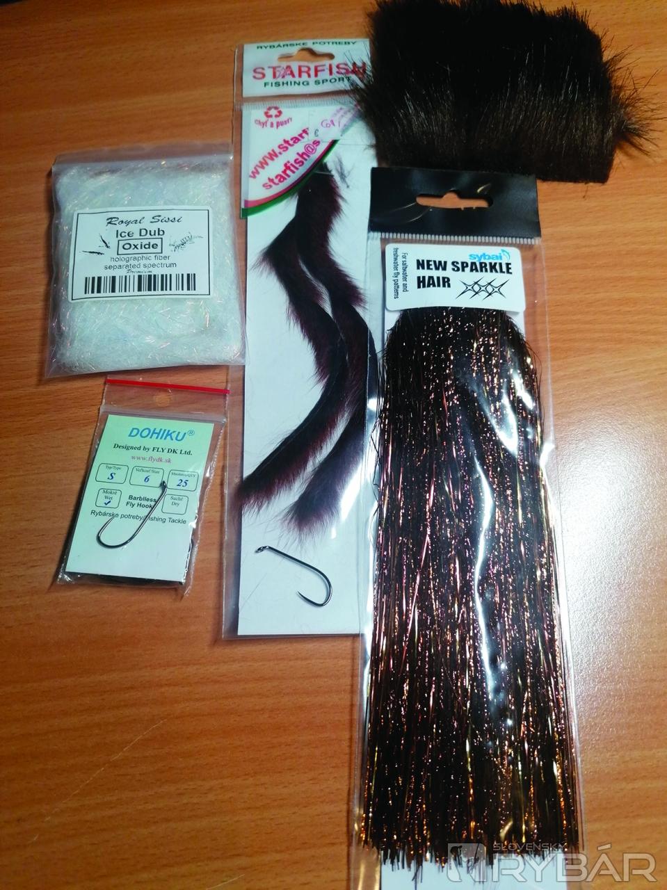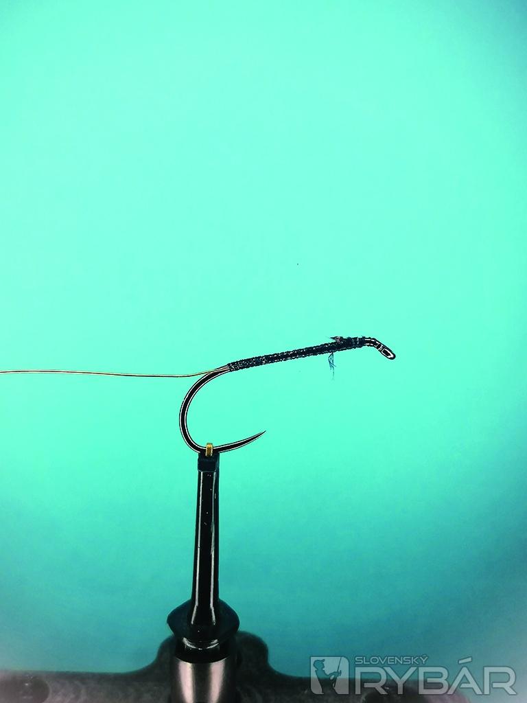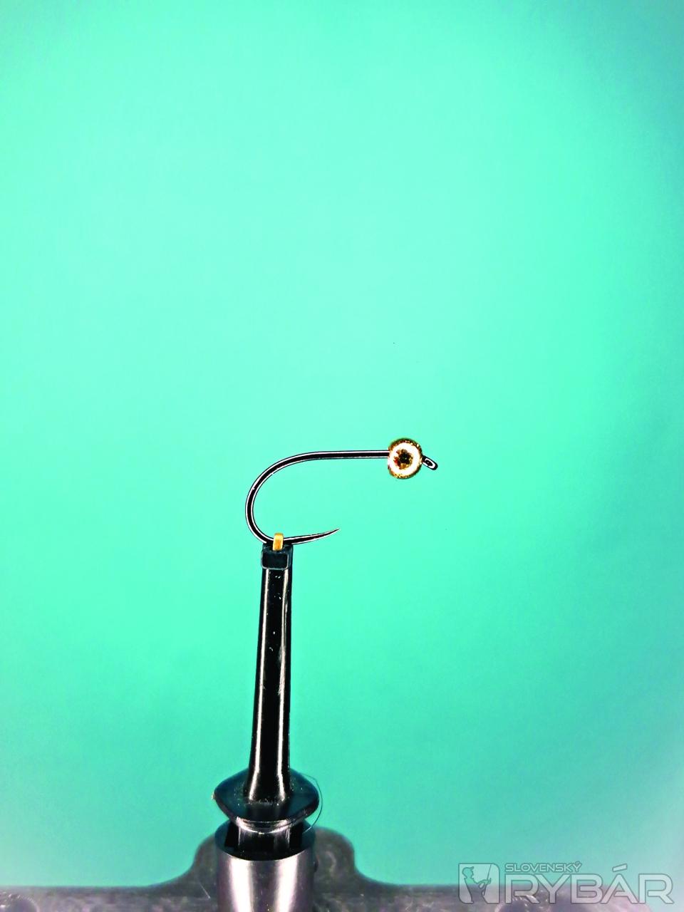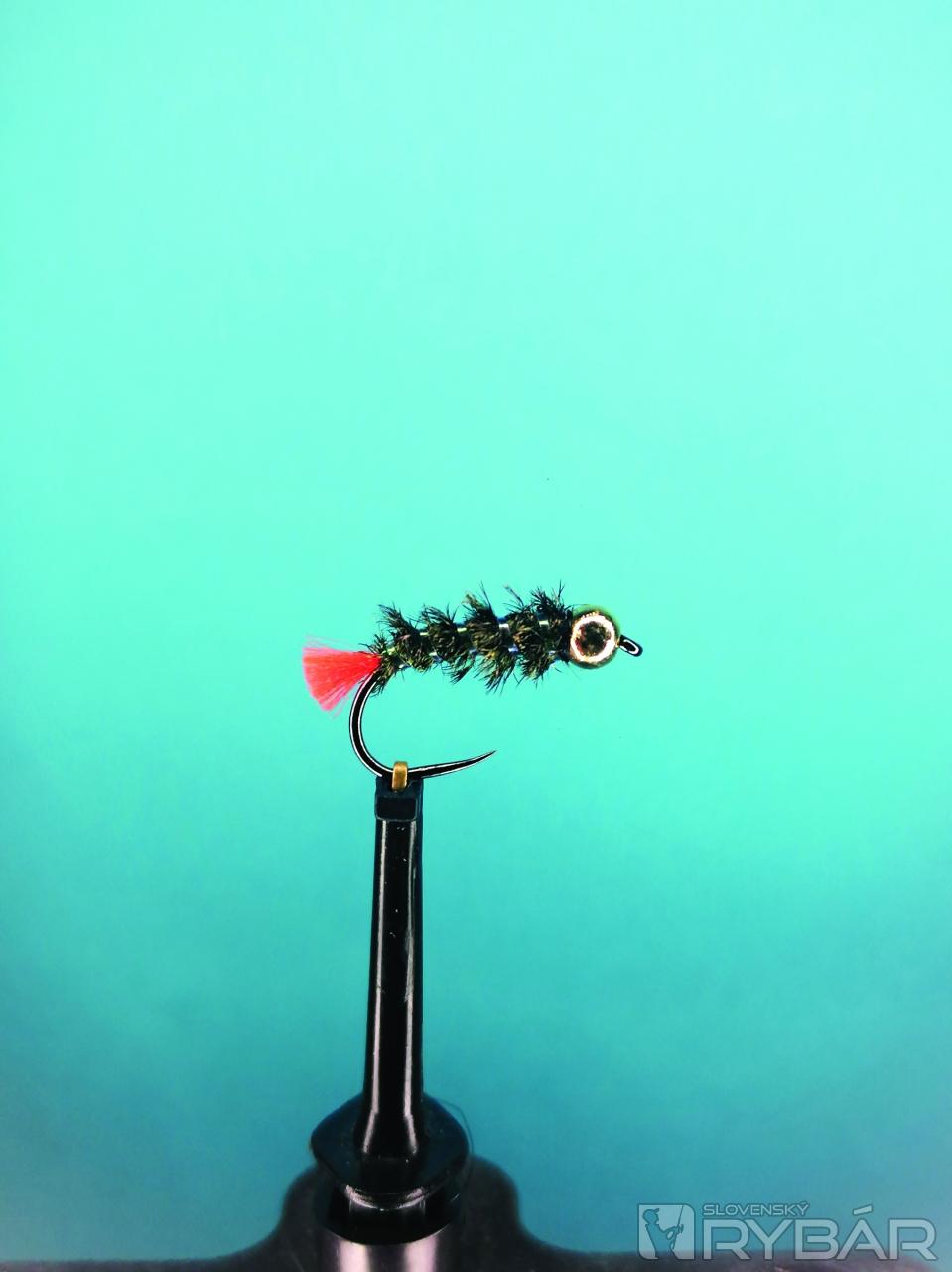 Použitý materiál: zonker pásiky, háčik S 6, tmavohnedé furabu, Ice Dubbing, tmavomedené flashabou, čierna nitka, oči, zlatý drôtik.