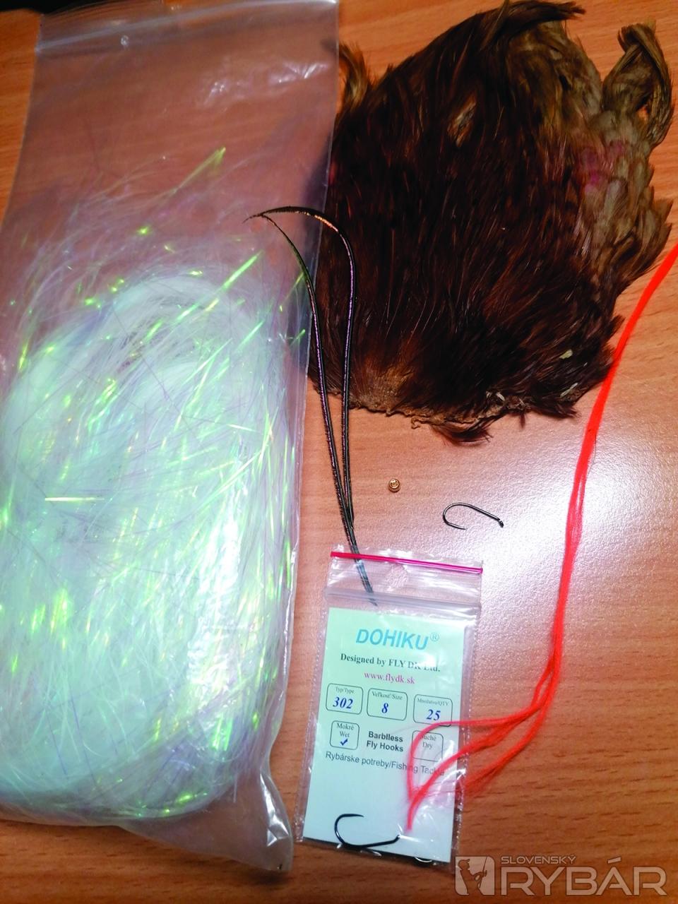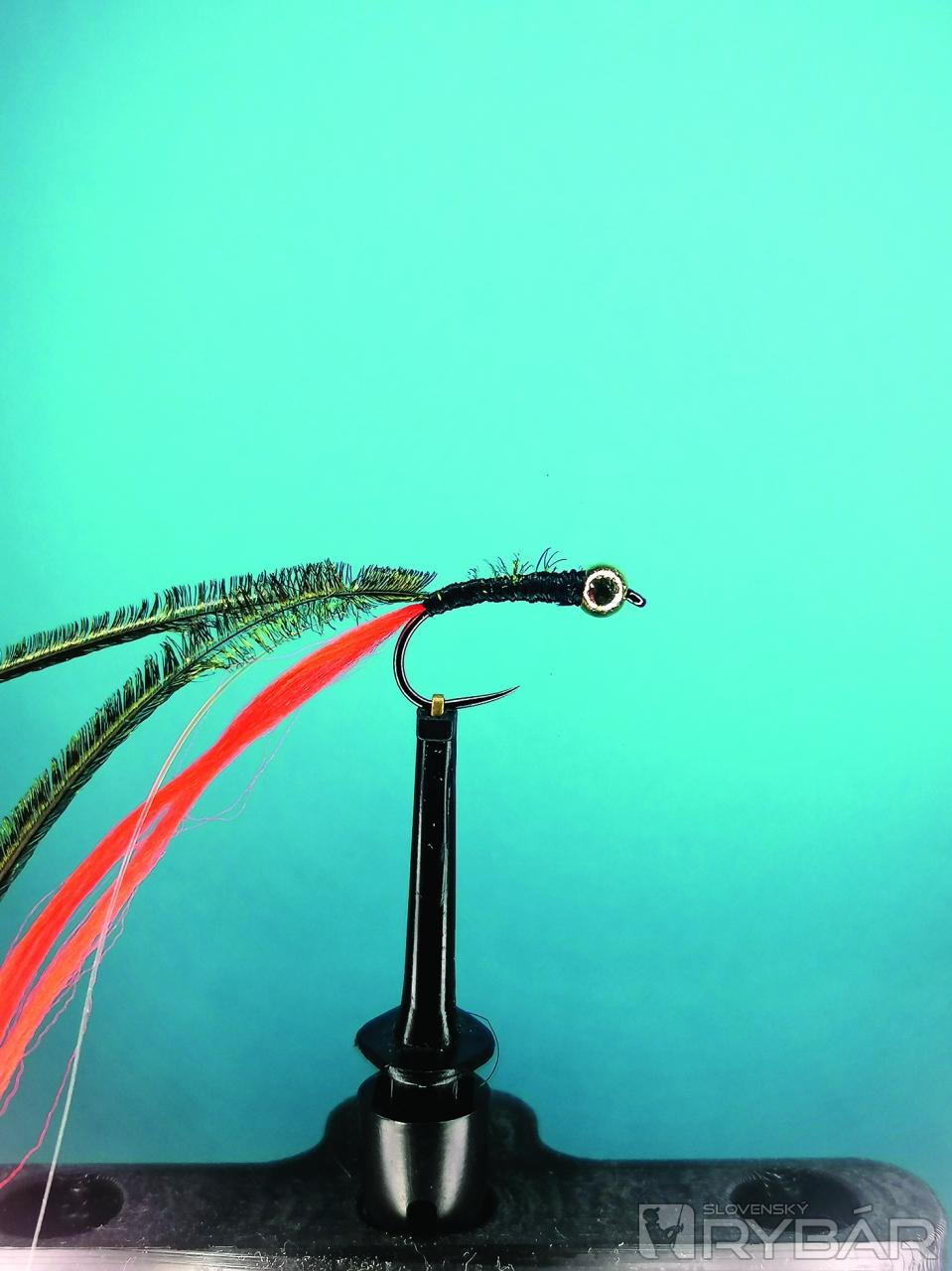 Použitý materiál: svetlý skalp zo sliepky, háčik 302/8, hlavička veľkosť 3,5 mm, vodová lameta, pierka z páva, oranžová vlna.