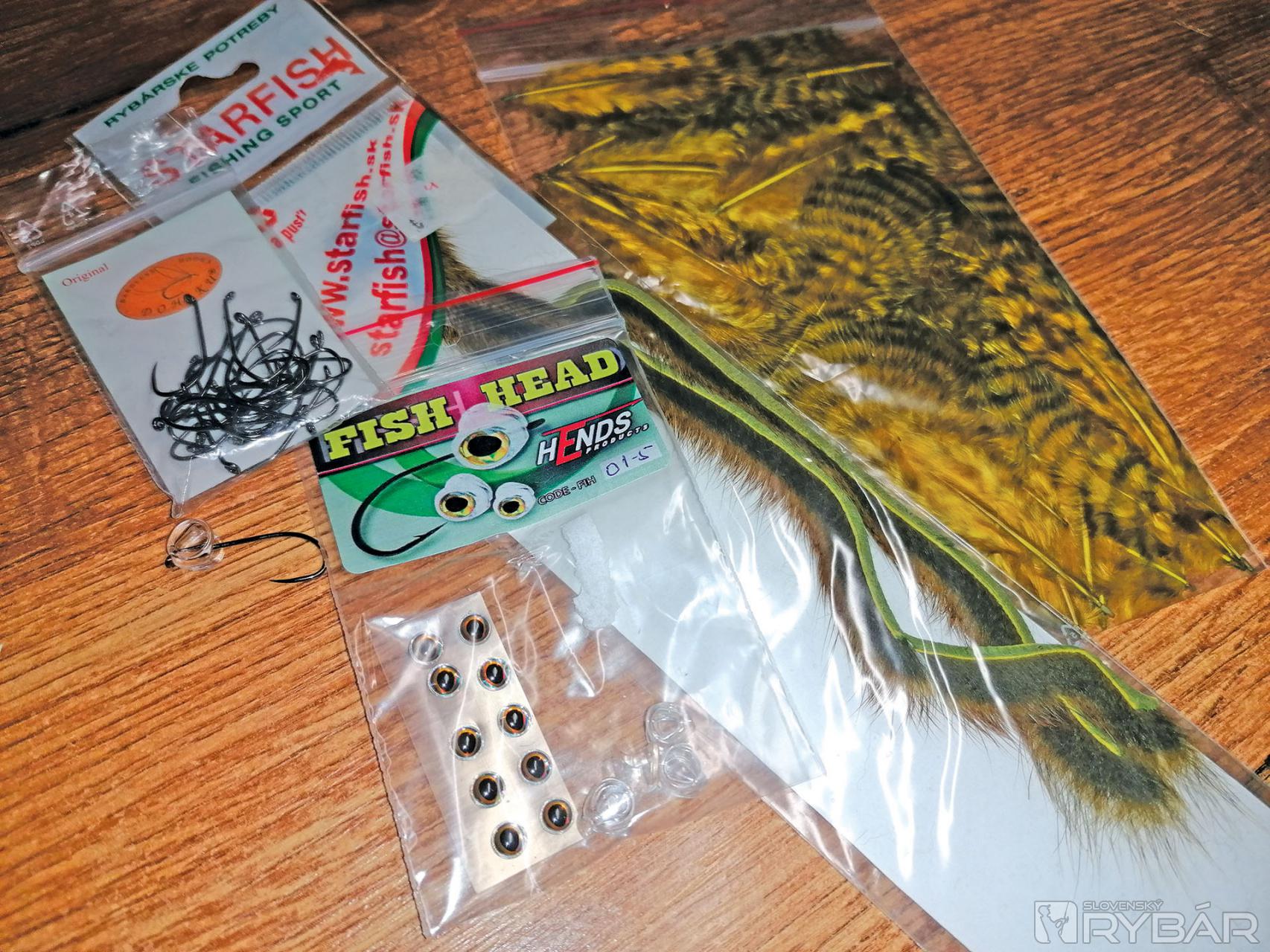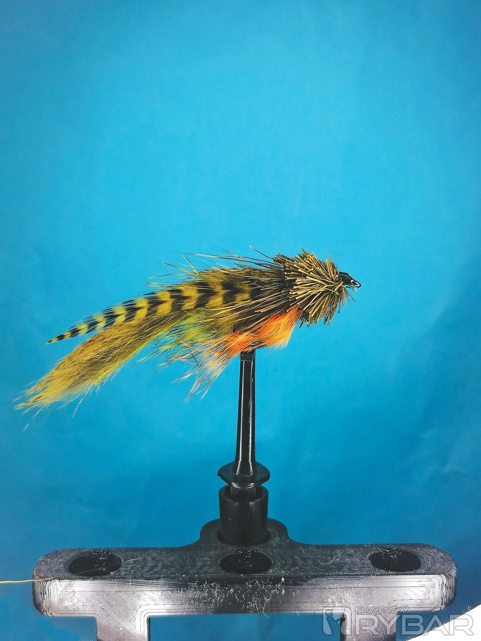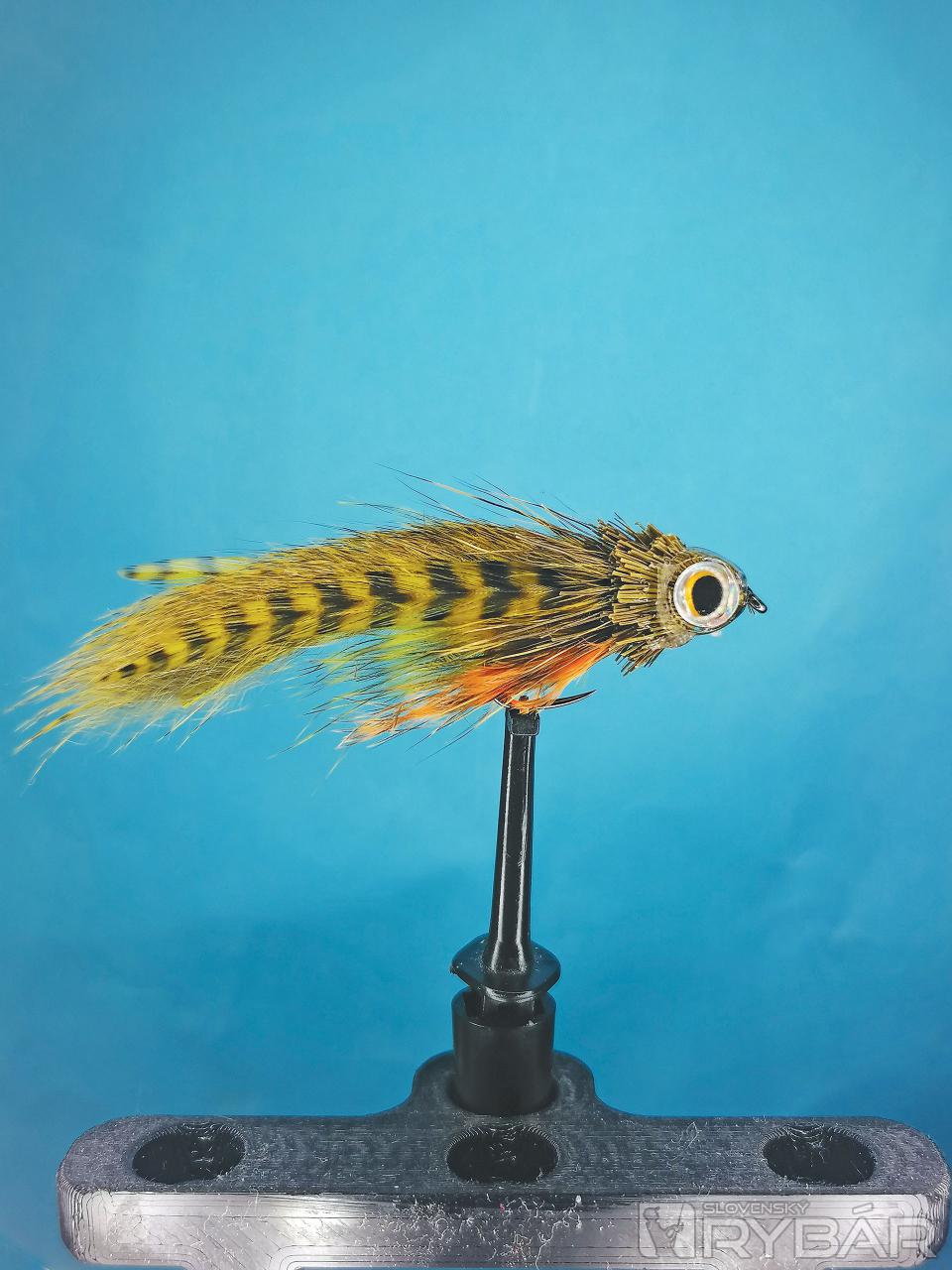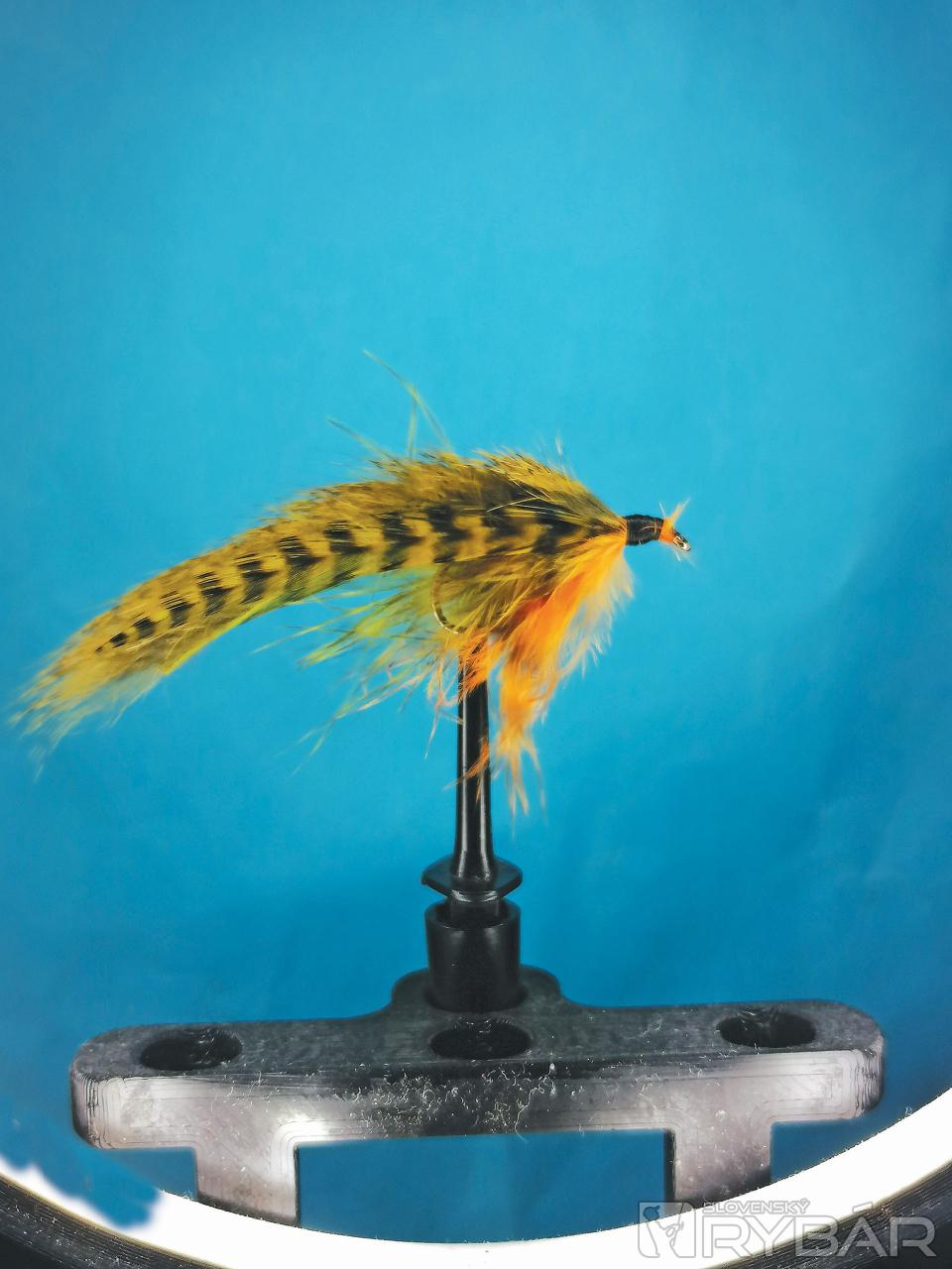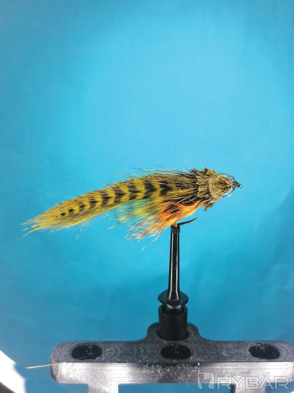 Materiál: čierna viazacia nitka, háčik veľkosti 6, olivový zonker, fish head, nalepovacie oči, olivové grizzly marabu, oranžové grizzly marabu, grizzly pierka, olivová srsť.