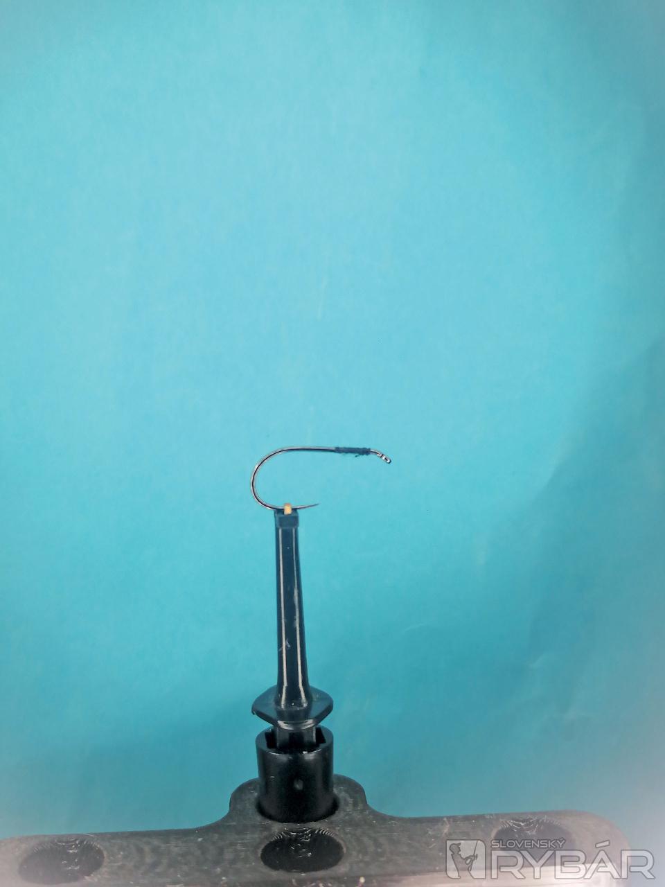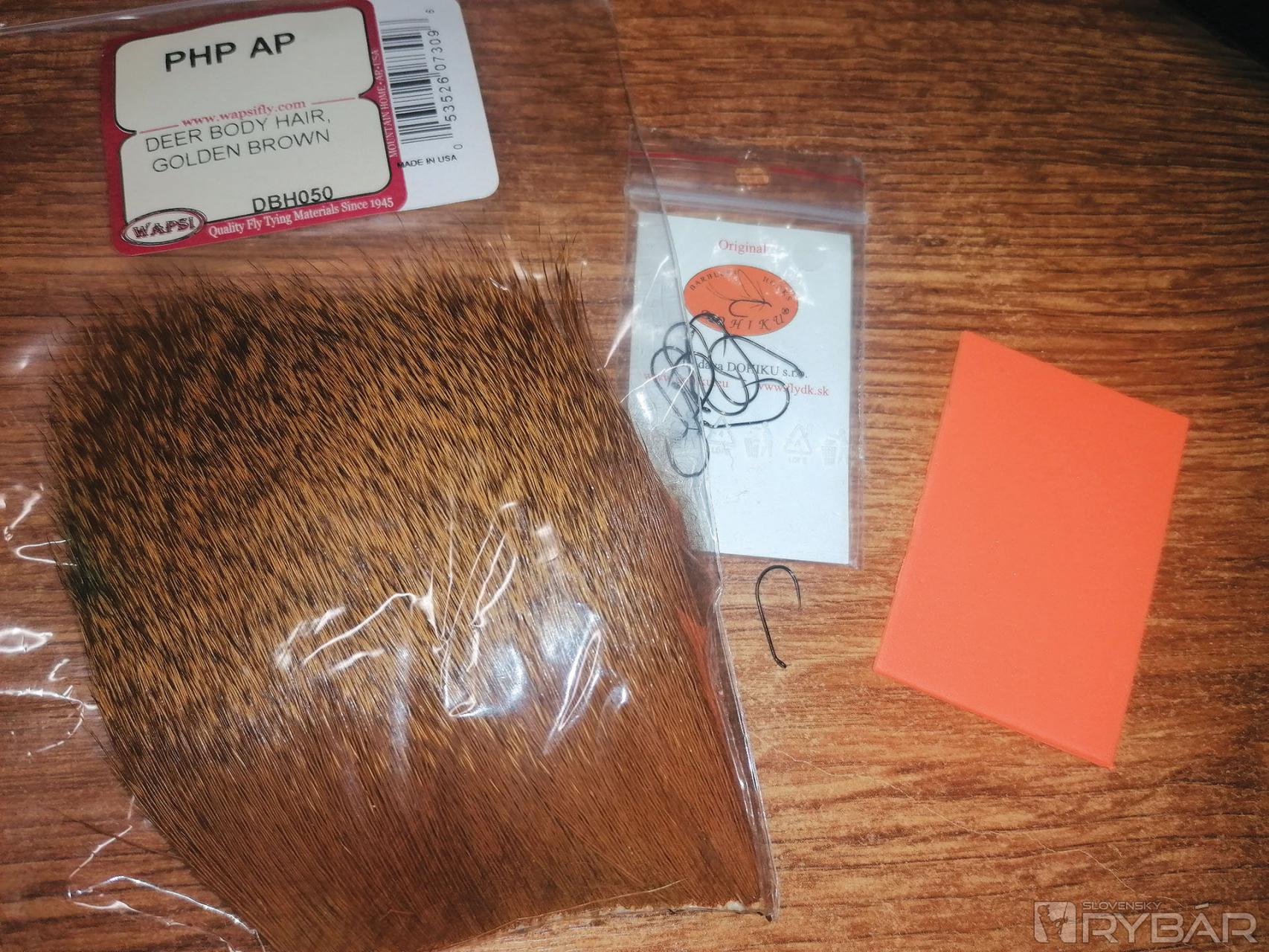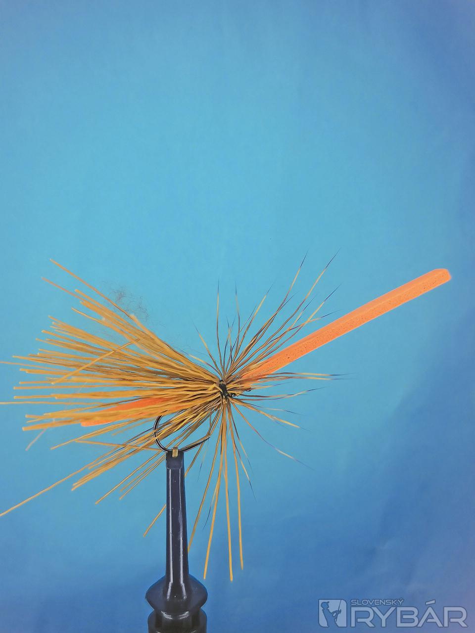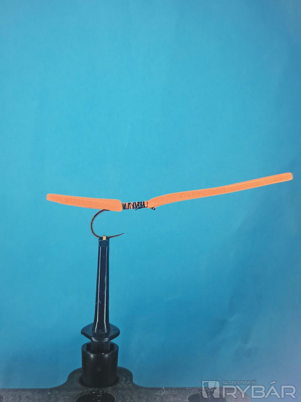 Materiál: čierna nitka, suchý háčik veľkosti 10, oranžová pena, hnedá srsť.