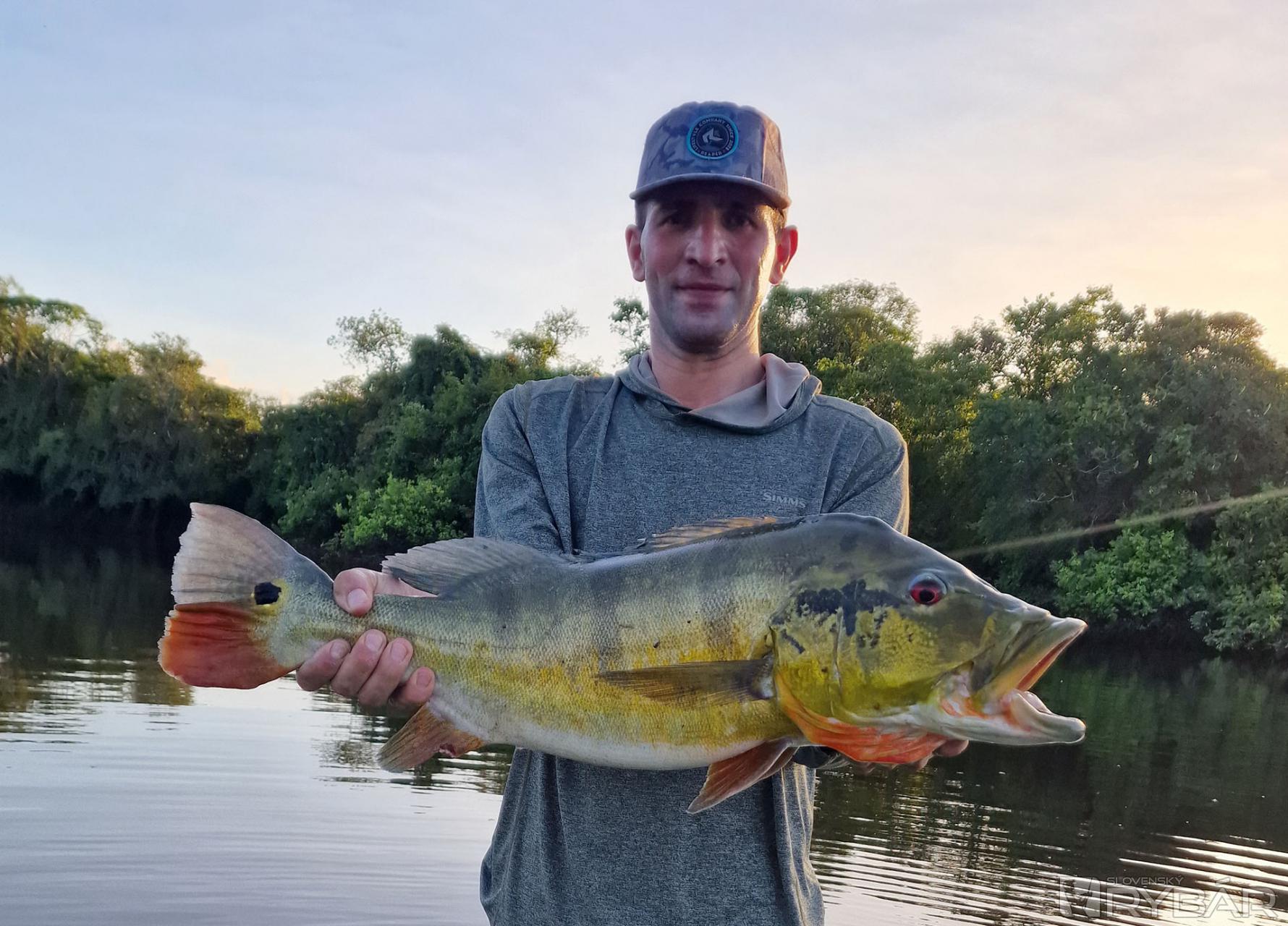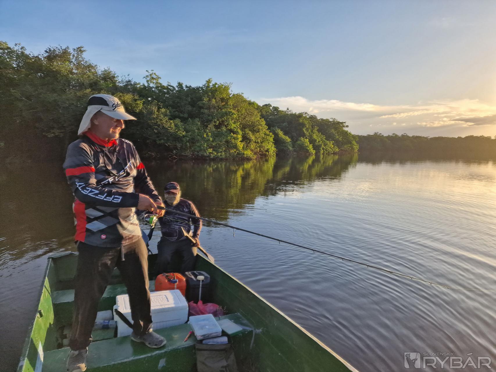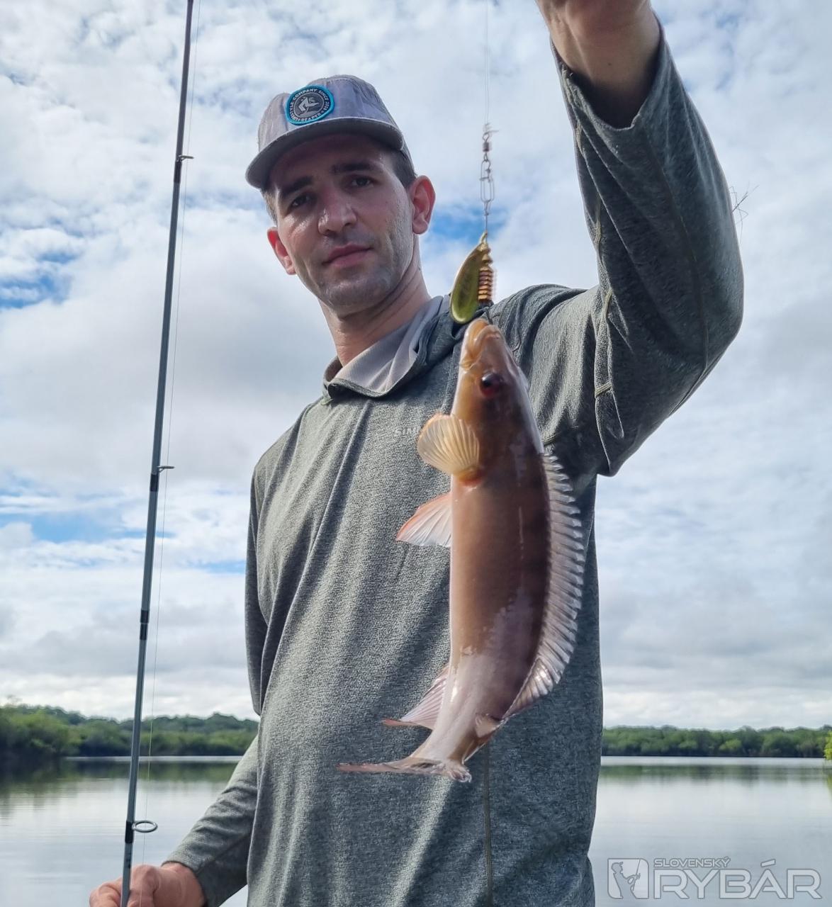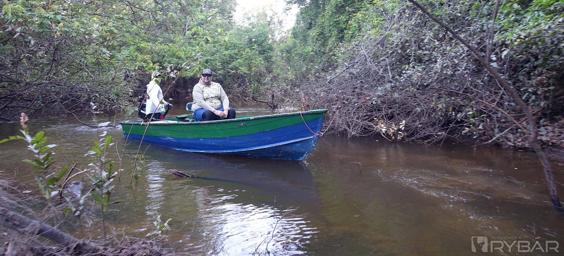 Po dvadsaťminútovom pretláčaní sa húštinou otvorí sa pred nami lagúna. Toto jazero napájané riekou je obrovské. Brehy sú pokryté zaplavenými stromami a kríkmi. Podvodný život sa odohráva práve v týchto úkrytoch. Počujeme útoky dravcov a špliechanie unikajúcej koristi. Vhodiť nástrahu pod prevísajúce vetvy stromov nie je práve najjednoduchšie. Prvý náš úlovok zaútočil na malú rotačku. Je to tridsaťcentimetrová piraňa červenobruchá. Nie je to akurát obor, ale jej zuby bez problémov prehrýzli vobler, s ktorým som začal chytať. Postupne pribúdajú ďalšie úlovky. Cichlida mataguarre, šťukovka gujeta a naša cieľová ryba cichlida chvostooká. Nie každý hod skončí vo vode. Niektoré stromy a kríky sa priam načahujú po našich nástrahách, tak sa pri vyslobodzovaní malého poppera z konárov stromu stavia Vít na špicu člna. My si ideme svojou cestou. Pád do vody bol neodvratný. Prežil. Vytiahli sme ho na zlosť piraňám a kajmanom.