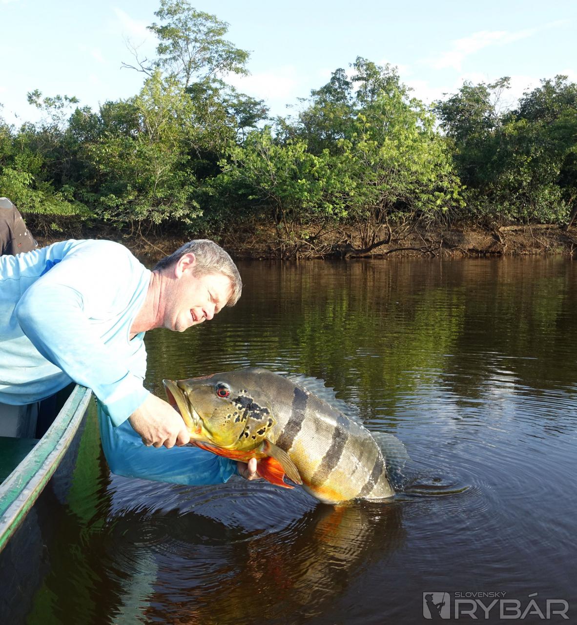 Po obedňajšej sieste sa s Vítom vraciame do jednej z lagún a zapadajúce slnko v predátoroch prebúdza hlad. Aktivita rýb sa zvýšila a nastal čas pre hladinové nástrahy. Na špliechajúci popper mi zaútočila cichlida takou silou, že úniku do húštiny konárov zabraňujem iba pridŕžaním cievky na udici ohnutej do oblúka. Nasledujú výskoky. Jeden, dva, tri a únik do hlbiny. Riverasovo „grande“ (veľká) dáva na vedomie dve veci: vie hovoriť a toto zdolávanie ho nenecháva chladným. Keď lodivod vytiahol zdolávacími kliešťami rybu do člna, Vít ma musel buchnúť po chrbte, aby som sa nadýchol. Meriam a opäť strácam dych. Rovných 80 cm! Túto veľkosť sa až do konca zájazdu nepodarilo prekonať. Možno vás to prekvapí, ale veľkosť ryby cez 60 cm je vždy malým víťazstvom. Bojovnosť a množstvo prekážok sú dôvody, prečo večer pri sumarizovaní úlovkov každý hlási rybu nad 70 cm s hrdosťou v hlase.
