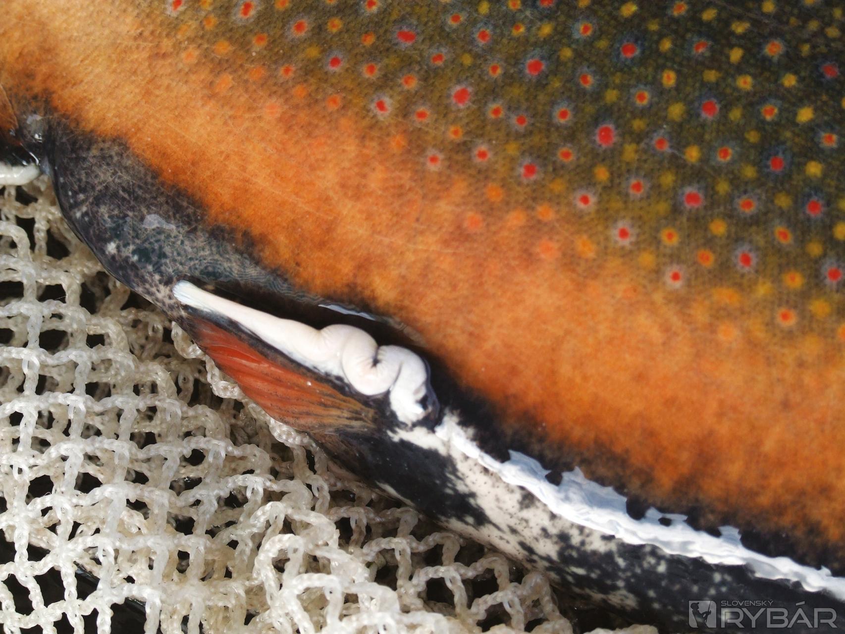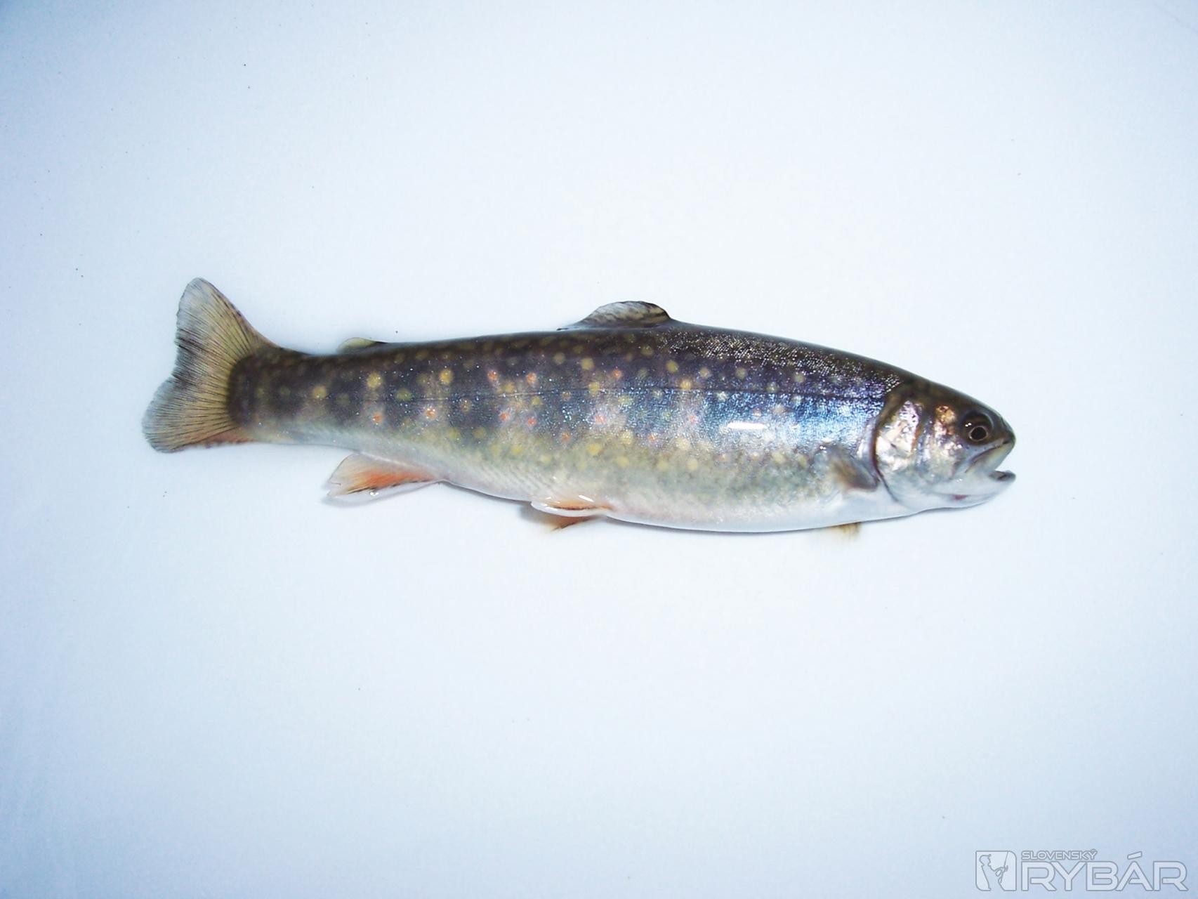 Pstruh jazerný – striebristé sfarbenie tela s čiernymi bodkami v tvare písmena x.