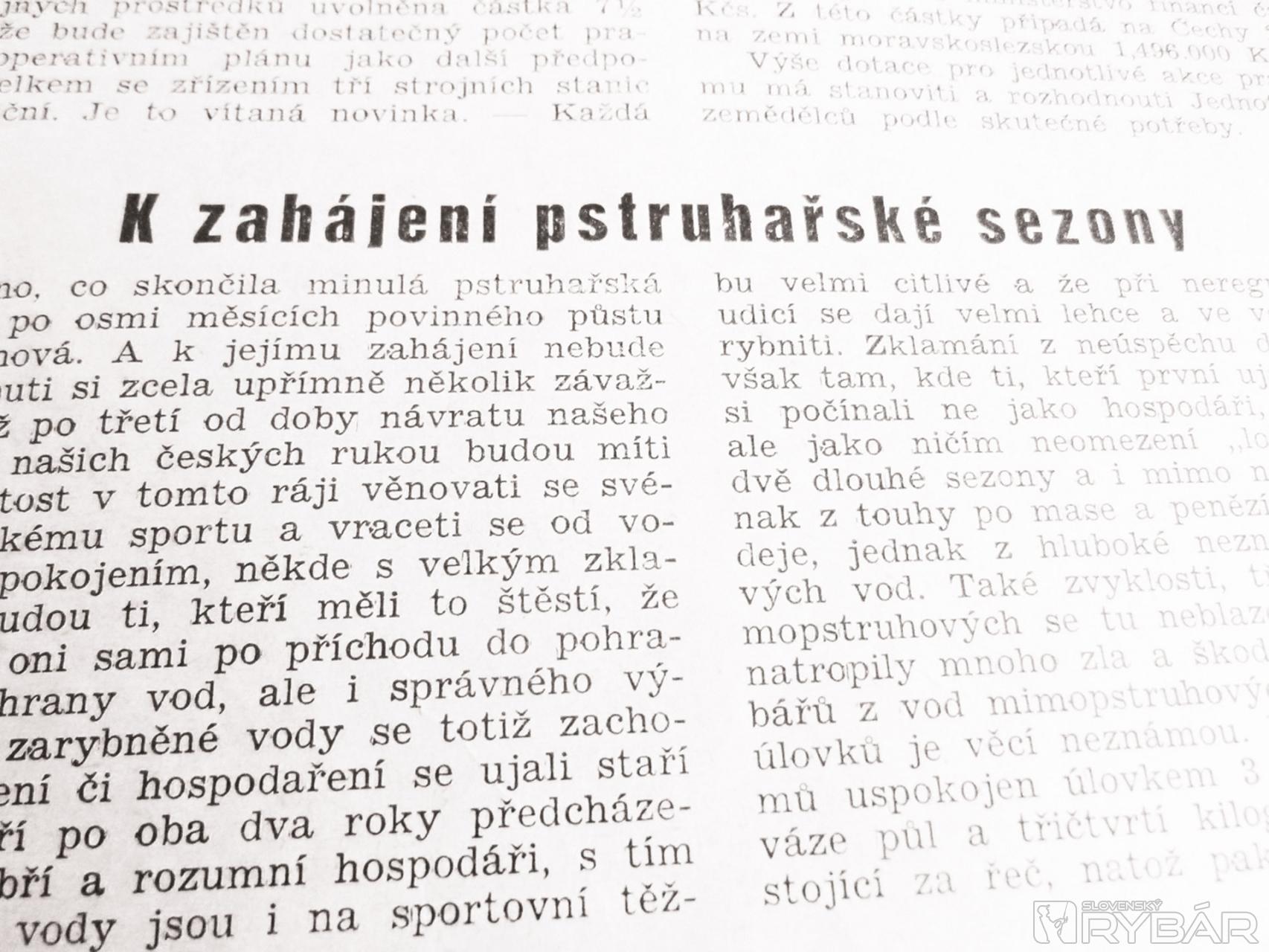 Není tomu tak dávno, co skončila minulá pstruhařská sezona a již je tu po osmi měsících povinného půstu na obzoru sezona nová. A k jejímu zahájení nebude na škodu, připomenouti si zcela úpřimně několik závažných skutečností. Již po třetí od doby návratu našeho pstruhového ráje do našich českých rukou budou míti naši pstruhaři příležitost v tomto ráji věnovati se svému krásnému rybářskému sportu a vraceti se od vody někde s plným uspokojením, někde s velkým zklamáním. Uspokojeni budou ti, kteří měli to štěstí, že jejich předchůdci neb oni sami po příchodu do pohraničí ujali se nejen ochrany vod, ale i správného výkonu rybolovu. Dobře zarybněné vody se totiž zachovaly jen tam, kde vedení či hospodaření se ujali staří ostřílení pstruhaři, kteří po oba dva roky předcházející počínali si jako dobří a rozumní hospodáři, s tím vědomím, že pstruhové vody jsou i na sportovní těžbu velmi citlivé a že při neregulovaném lovu třeba udicí se dají velmi lehce a ve velmi krátké době vyrybniti. Zklamání z neúspěchu dostaví se zcela určitě však tam, kde ti, kteří první ujali se věcí rybářských, si počínali ne jako hospodáři, sportovci a ochránci, ale jako ničím neomezení „lovci pstruhů“, kteří po dvě dlouhé sezony a i mimo ně jen lovili a lovili, jednak z touhy po mase a penězích získaných z jeho prodeje, jednak z hluboké neznalosti únosnosti pstruhových vod. Také zvyklosti, třeba sportovní z vod mimopstruhových se tu neblaze uplatnily. Tyto zvyklosti natropily mnoho zla a škod, poněvadž pro většinu rybářů z vod mimopstruhových omezování počtu a váhy úlovků je věcí neznámou. Který pak rybář by šel domů uspokojen úlovkem 3 až 5 kousků bílých ryb ve váze půl a třičtvrti kilogramu? To je množství, nestojící za řeč, natož pak za přípravu. Teprve úlovek jednoho nebo více kusů, ale pořádné váhy, stojí již za to. A tento způsob nazíraní na velikost a množství úlovků se přenesl i na vody pstruhové, kde v dobře zarybněné vodě není uměním chytiti desítky pstruhů o váze mnoha kilogramů. A tak když pstruzi brali, brali i rybáři pstruhy v každém množství. První rok to šlo, vždyť většina našich pstruhových vod byla dobře zarybněna, tak proč si ten požitek nedovolit? Druhý rok to bylo slabší hned na počátku sezony a na jejím konci to bylo velmi slabé. A letos by dílo zkázy bylo dokončeno. Snad letos již tito rybáři zmoudří a uvědomí si, že musí něco učiniti, při nejmenším omeziti dobu lovu a počet úlovků pstruhů, nechtějí-li v příštích létech postávat u vyrybněných potoků a řek. A vyskytnou-li se kde případy hospodářů neb rybařících, myslících „po nás ať přijde potopa“, musí takoví býti radikálně zneškodněni, poněvadž nemáme vod, násad a peněz na jejich zvýšený nákup tolik, abychom si mohli dovoliti čekat po doluhá léta na to, až desítky kilometrů vyrybněných nejkrásnějších našich vod pstruhových dosáhnou třeba jen normální rybnatosti. Velké úspěchy nepřinášejí pravodatnému rybáři ten pravý požitek a plné uspokojení. Snad v prvních chvílích vědomí dočasného vítězství, radost nad dobře zarybněnou vodou a samolibost nad vlastním rybářským uměním strhnou k přečinu. To je projev pudů člověka lovce. Když však po opadnutí vlny kořistné radosti se stane z člověka lovce opět člověk hospodář, milovník přírody a sportovec, dostaví se pak hluboká nespokojenost se sebou samým, rozčarování a výčitky svědomí nad zmařeným dílem přírody, i když úlovek množstvím i vahou stojí za podívaní. Výčitky a nespokojenost jsou tím větší, čím větší je počet těch krásných ušlechtilých pstružích těl v rybářském košíčku. A tato pozdní lítost se nezažene žádným uklidňováním a omlouváním rybářského i lidského svědomí, že sa vlastně nic nestalo, protože voda je přerybněna, pstruzi přerostlí a že jsi jen přírodě pomohl zregulovat obsádku. Jen důsledné pokání ať dobrovolné či nucené je s to odčiniti dokonané zlo. V letošním roce je nutno dbáti toho, aby lov pstruhů byl provozován v té míře, aby neutrpěla podstata našich pstruhových vod. Proto je třeba, aby byla dodržena asi tato pravidla: Budiž vydán jen výrobnosti odpovídajíci počet povolenek, počet úlovků omezen v jednom dnu na nejmenší míru a to nejen kusově, ale i váhově, zákonitá míra pak zvýšena dobrovolným, ale závazným rozhodnutím na 27 až 30cm. Vodám budiž věnována zvýšená pozornost a všechny nepřístojnosti buďtež odstraňovány. Časté kontroly nebude žádný sportovec dodržující zákon i sportovní řád pokládati za zbytečné obtěžování jeho osoby, ale jistě je jen ve svém vlastním zájmu uvítá. V každém případě nutno zakázati lov na červa (žížalu). Rovněž nutno působiti k tomu,aby statistika úlovků byla vedena přesně a při každé návštevě vody. U rybářských korporací těsně před zahájením pstruhařské sezony nutno svolati povinnou členskou schůzi a na této seznámiti všechny, kdo budou loviti v tomto roce, se zásadami správného hospodaření na pstruhových vodách a se sportovním řádem. U jednotlivců obhospodařujících pstruhové vody, takovéto poučení nutno uděliti při vystavování povolenky. V každém případě, aby se předešlo sporům, je dobře, zásadné omezení (počet úlovků, druh nástrah, délka lovných kusů atd.) vepsati do povolenky. Jen tak se nám podaří udržeti rybnatost našich pstruhových vod na stejné výši. Statistika úlovků na konci roku, po srovnání se statistikami z let předchozích nám ukáže, zda naše opatření bylo správné. Budou-li úlovky vyšší než 