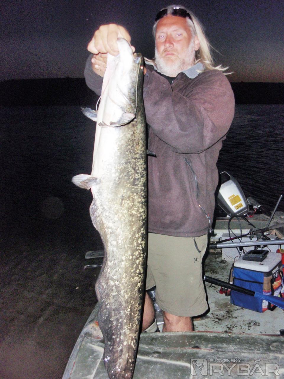 Na hladine si môžeme prezrieť prvého sumca z tohto jazera. Je to asi meter a pol dlhá ryba. Konštatujem, že je to celkom slušný začiatok. Asi po pol hodine vábenia registrujem ďalšie dvíhajúce sa echo. Záber prichádza takmer okamžite. Sumec si opäť vybral mňa. Ryba je o čosi väčšia ako tá prvá. Je rozhodnuté. Zajtra zbalíme tábor a prídeme sem.