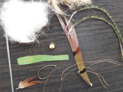 volfrámová guľôčka, krivákový háčik, spectra flash, medený drôtik, krémový dubbing, prírodný dubbing, páv, bažant, pierko zo sliepky, olovený pásik