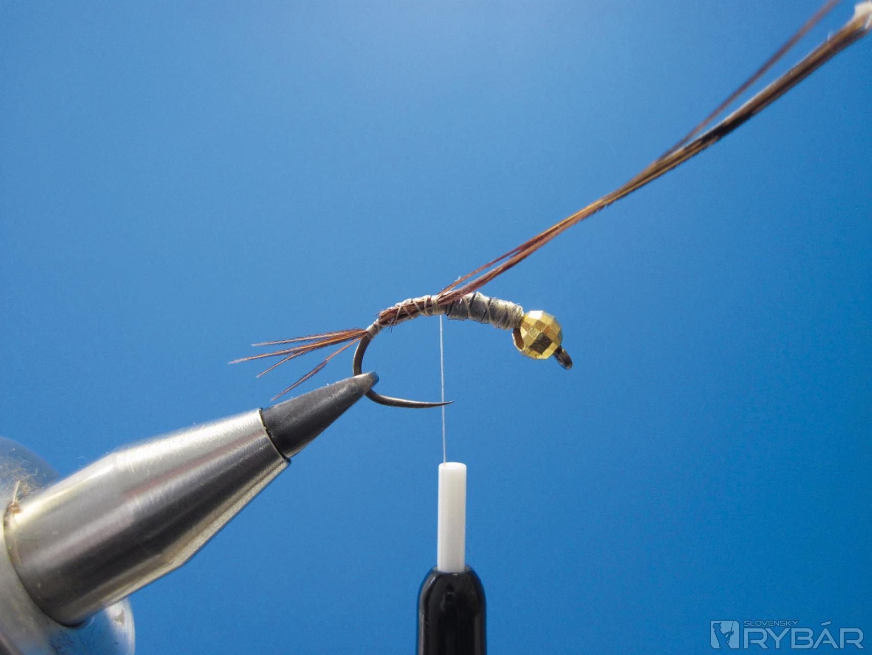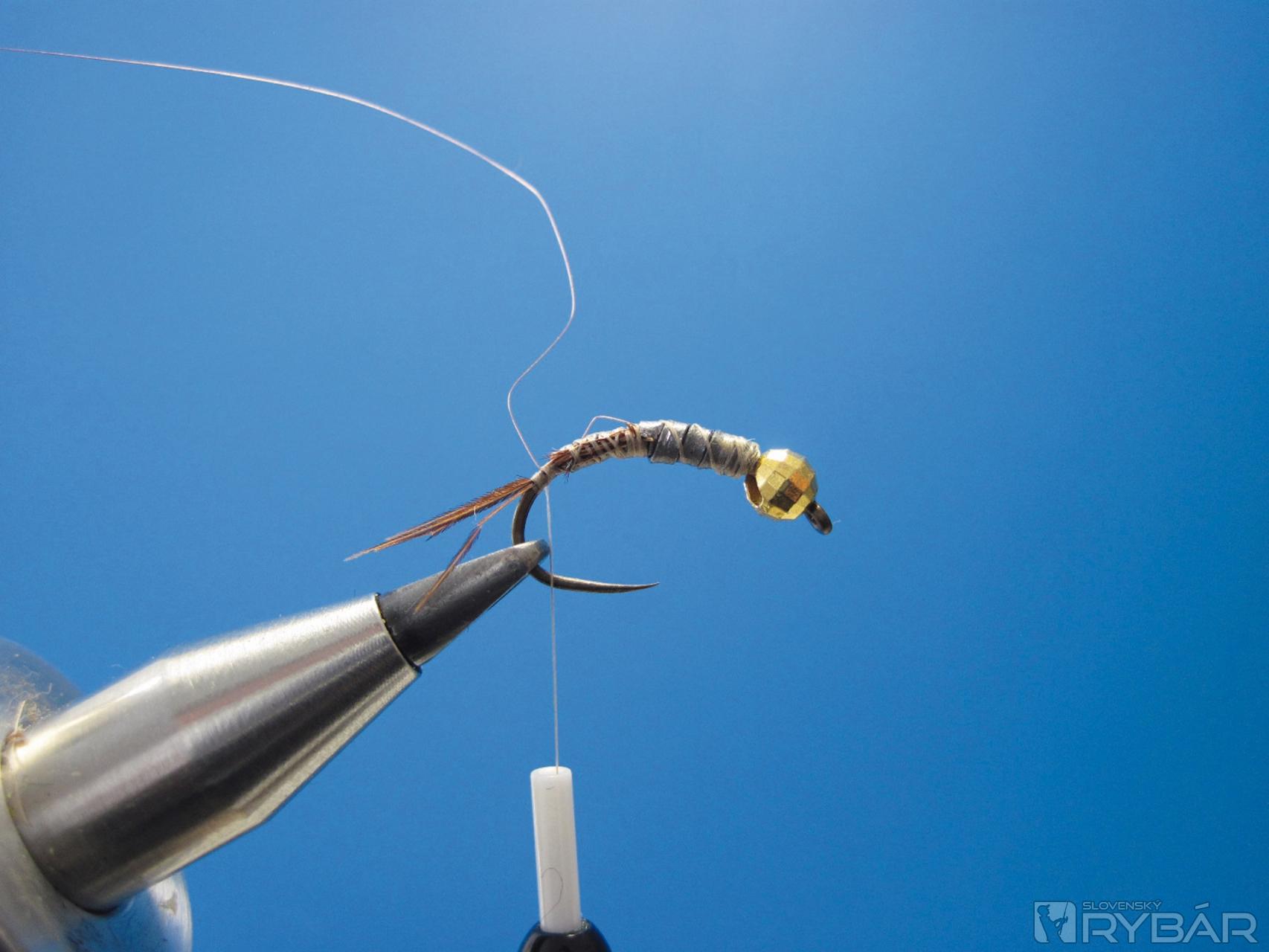 Ako prvý materiál naviažeme štety, na tie použijeme vetvičky z chvostového pera bažanta. Nasleduje tenký medený drôtik, ten musí byť čo možno najtenší, ak použijete príliš hrubý, tak bude telíčko farebne prehustené a drôtik bude príliš vidieť. Tu je drôtik dôležitý na vytvorenie siluety článkovania a tiež na spevnenie mušky. Odporúčam používať drôtik a vyhnúť sa nitiam alebo vlascom, ktoré po hladkom telíčku ľahko skĺznu.