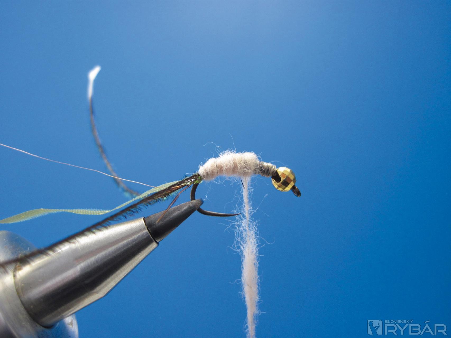 Ako jeden z posledných materiálov použijeme syntetický dubbing vo farbe broskyňovej zmrzliny. Dubbovanie telíčka je tu pomerne dôležité, je nutné, aby bolo telíčko pravidelne kónické a vo všetkých miestach musí byť dubbing rovnako utiahnutý, aby sa pri krúžkovaní drôtikom rovnomerne zarezal. Správne naviazané telíčko je základ tohto vzoru. Najčastejšie používam ešte nožičky zo sliepky alebo horšieho kohúta, keď s pierkom urobím jeden až dva závity a za nožičky ešte doviažem malú hlavohruď z lesklého dubbingu.