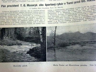 Nechcel som opisovať tieto dojmy z rybárčenia p. prezidenta v Turci, predpokladal som, že tieto napíše niektorý zo starších rybárov, ktorí s p. prezidentom chytával. Keďže minulého roku posledný z týchto rybárov zomrel a neuverejnil tieto zážitky, konám to teraz na pamiatku 60 ročného športového chytania rýb na mušky v Turci. Vďakou som zaviazaný Mpi. J. Markovickéj za poskytnutie informácií ako aj za vypožičanie palíc a mušiek p. prezidentových na vyhotovenie snímkov. Vyslovujem vďaku p. Ing. Šimkovi z Kolína, ktorý pri príležitosti vykonania prednášky o rybárstve v Turč. Sv. Martine, tieto snímky vyhotovil a ktoré tu uverejňujem.