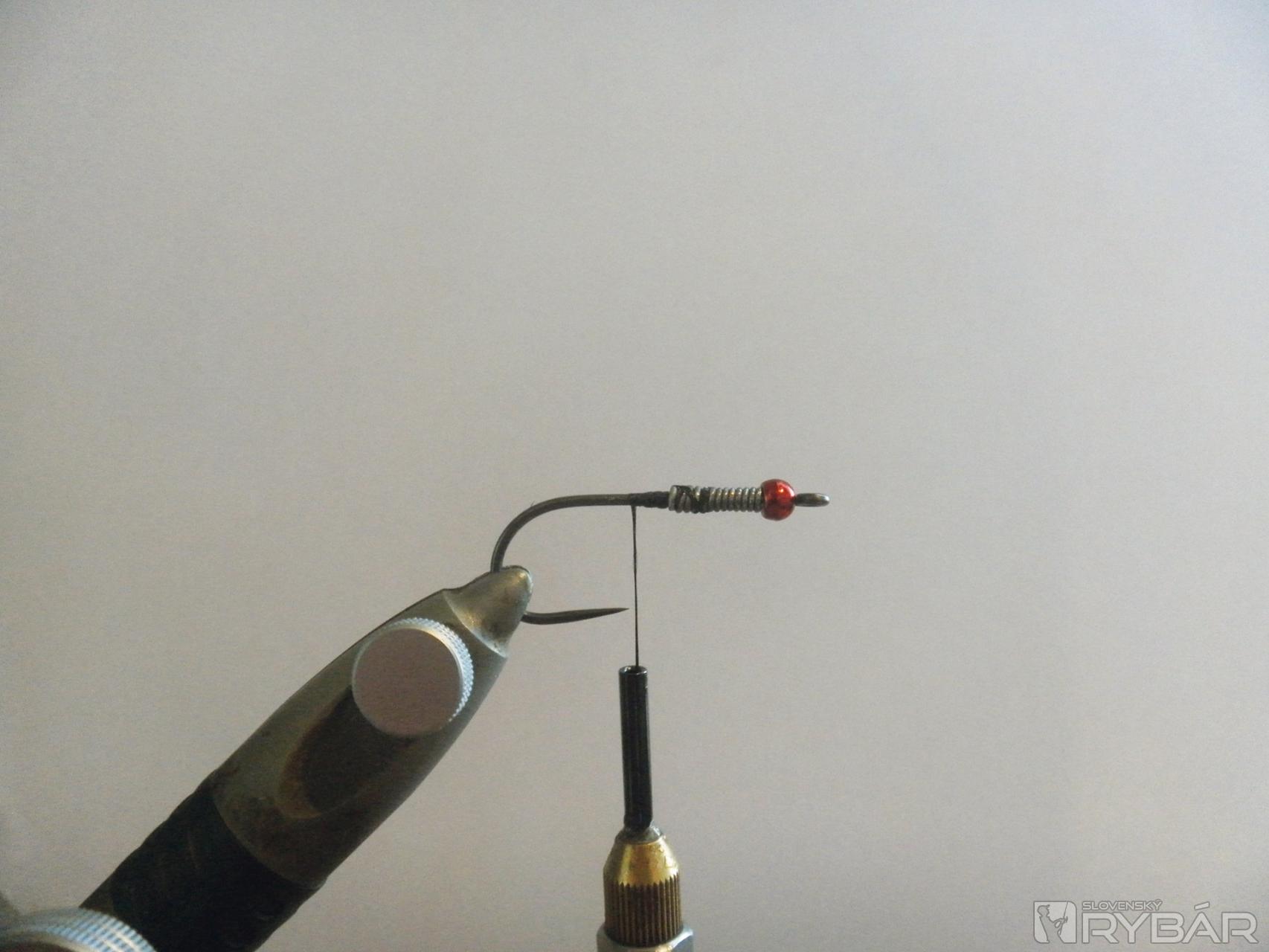 1 - Na ramienko háčika navlečieme tungstenovú hlavičku a následne háčik zaťažíme oloveným drôtom.