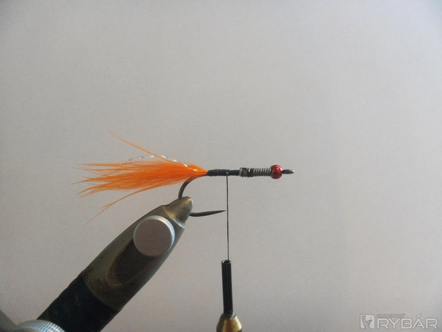2 - Základ chvostíka vytvoríme z oranžového marabou a krystal flash hair.