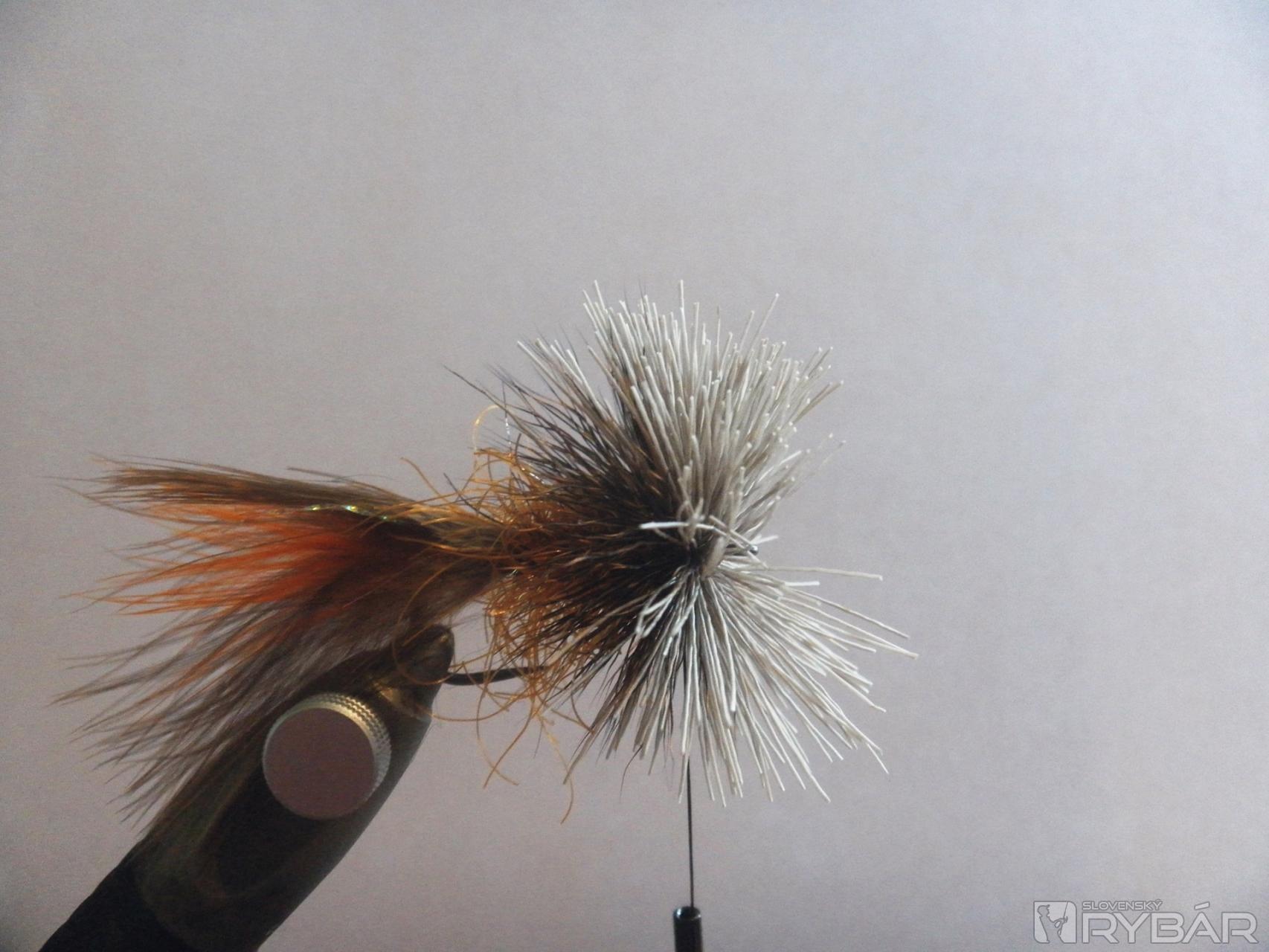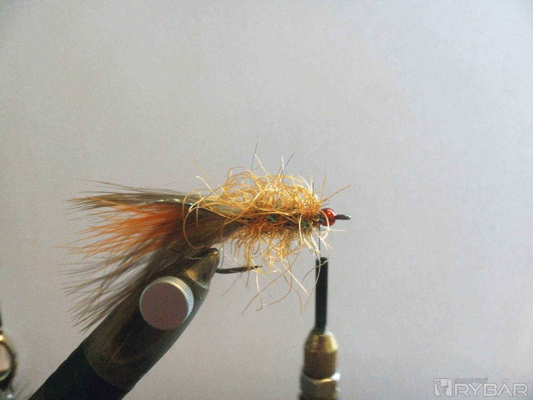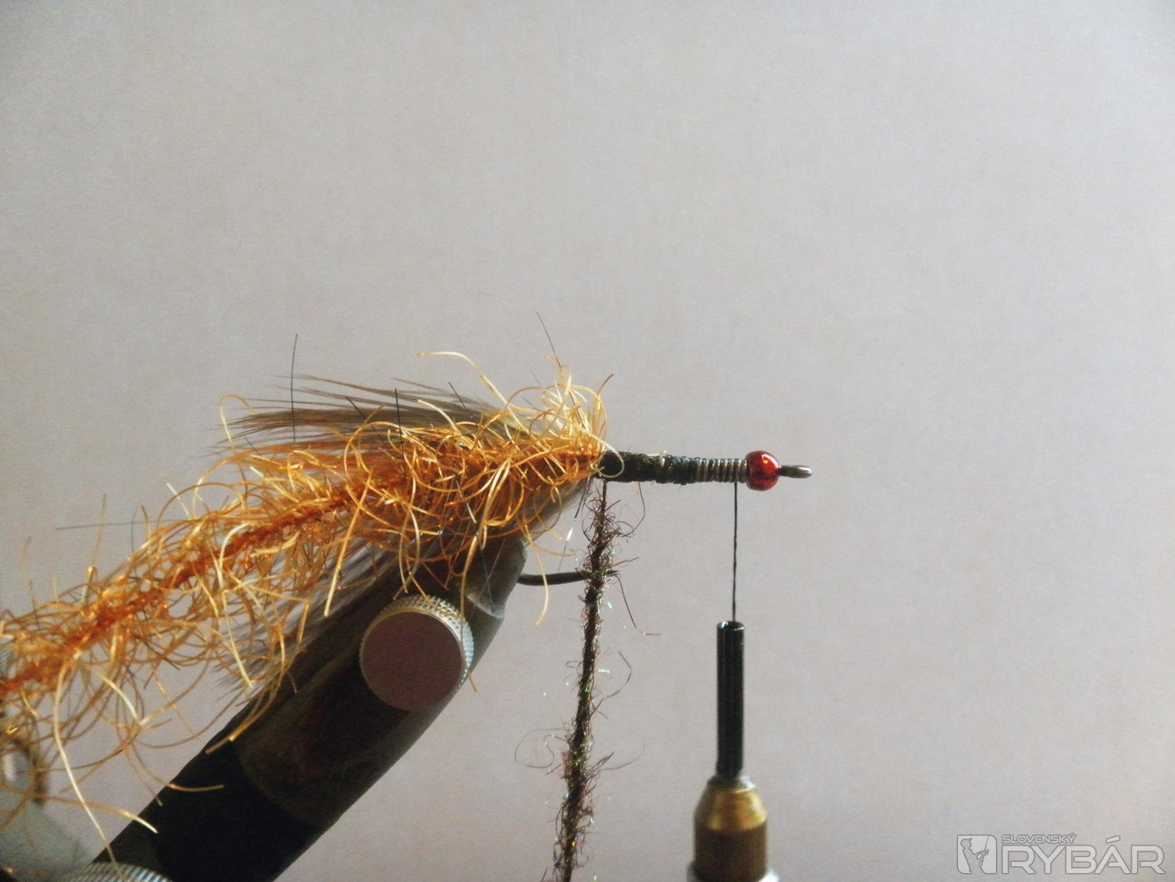 4 - Telíčko strímra tvorí: podklad - spectra dubing /farba páv/, palmerové vinutie /rishi brush/ svetlohnedá.