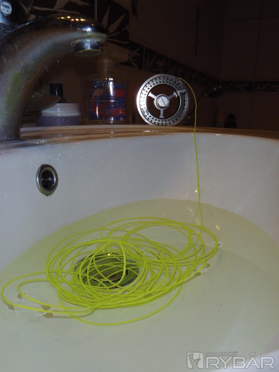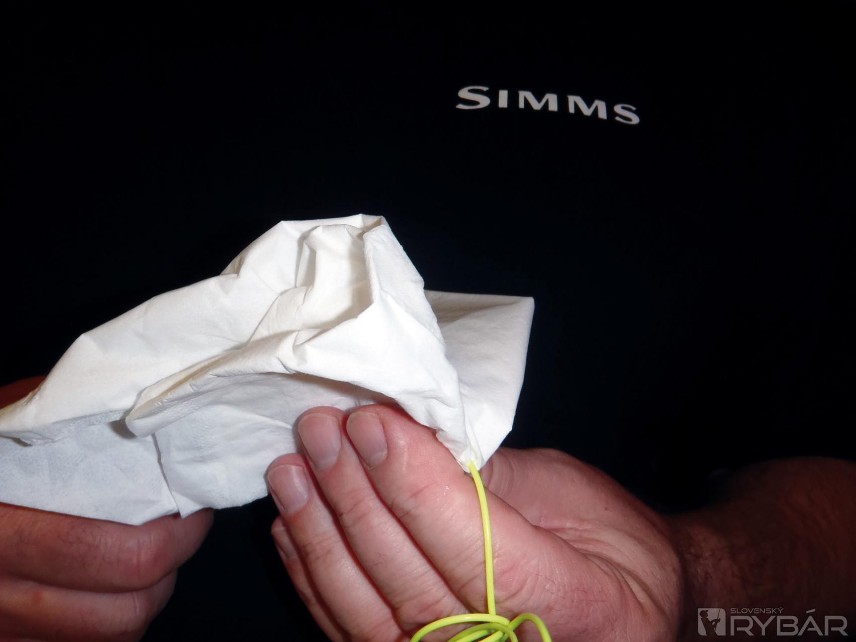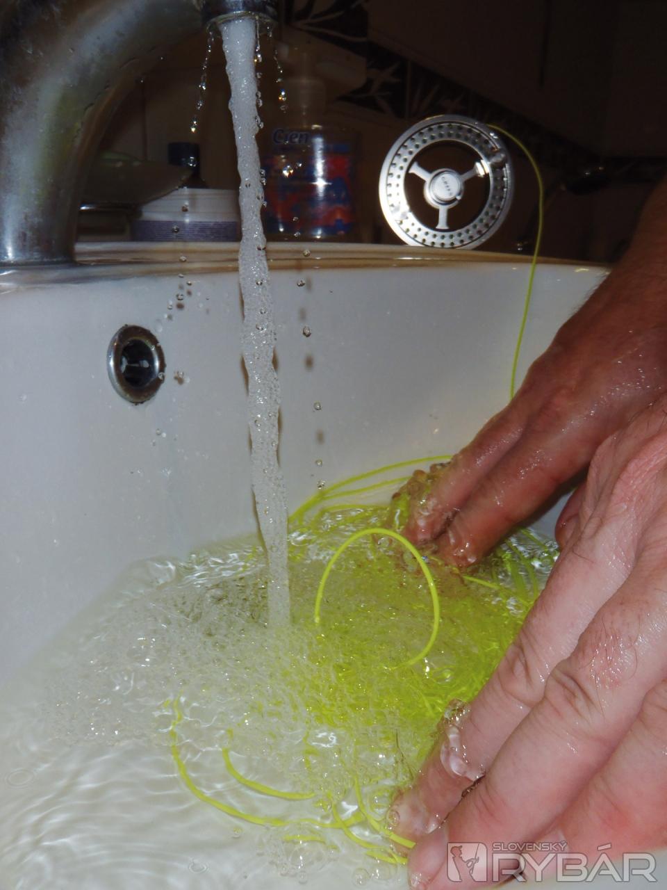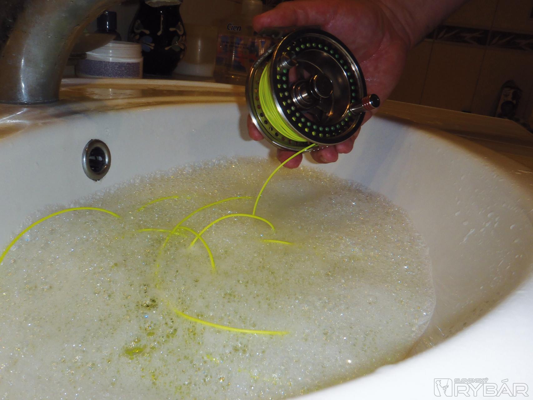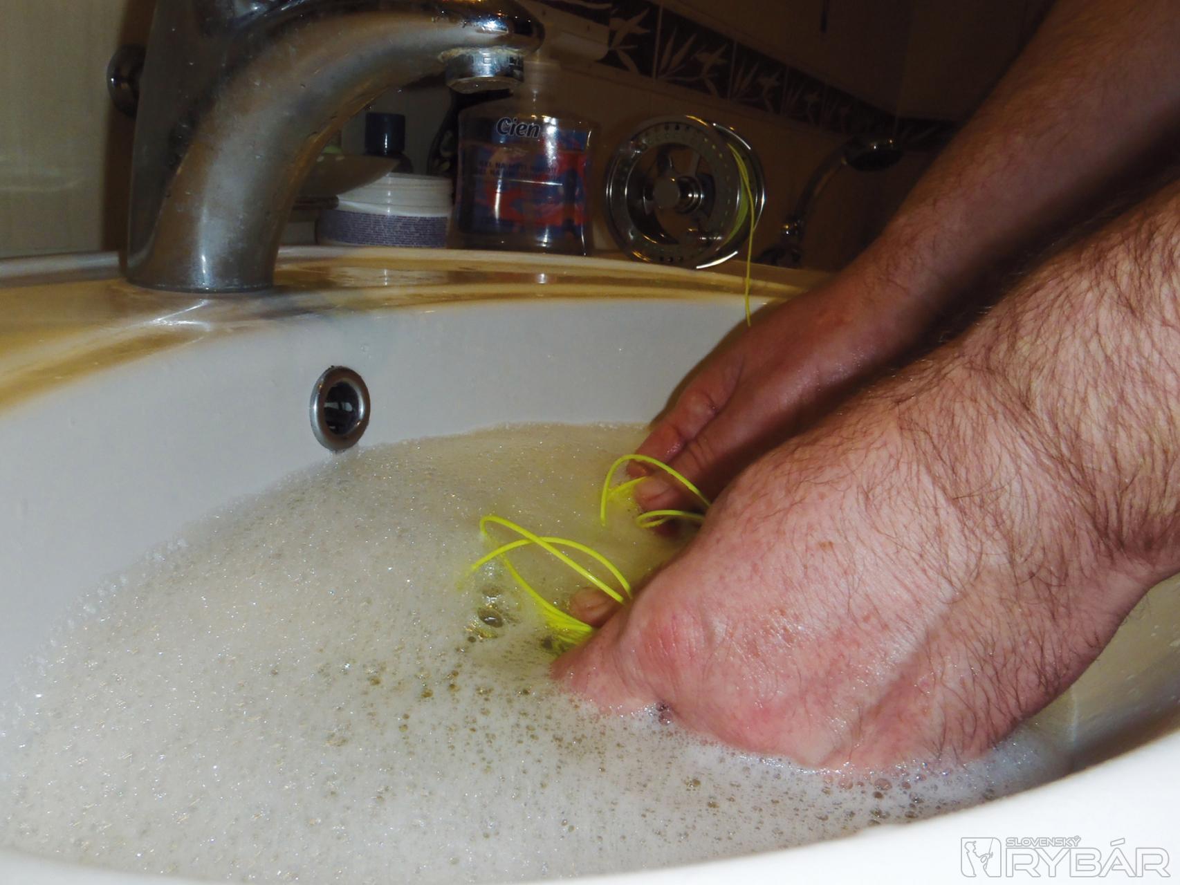 Šnúru je dobré po muškárskej sezóne poriadne vyčistiť. Napustite umývadlo teplou vodou a pridajte tekutý prostriedok na umývanie. My sme použili mydlo na ruky. Šnúru vytiahnite z navijaka a vložte ju do pripraveného roztoku. Rukou jemne napeňte roztok a šnúru v ňom pováľajte. Nechajte pôsobiť. Prípravok pôsobí na šnúru a zbavuje ju mastnoty, ktorú šnúra získala z prostredia, alebo z vašich vlastných rúk. Po pár minútach vypustite vodu z umývadla. Opätovne naplňte umývadlo, tentoraz už čistou vodou. Poriadne šnúru vypláchnite. Vezmite čistú handričku a pretiahnutím osušte šnúru od vody. Ak ste osušili celú šnúru, jemne ju naviňte do navijaka. Nemali by ste veľmi tlačiť na pílu, pretože pri tesnom navíjaní, alebo napínaní šnúry sa môže v navijaku otlačiť a poškodiť.