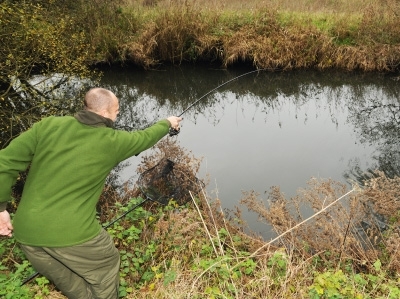 Potom, ako sme dorazili na nové lovisko, si Dean pripravil novú montáž s priebežným olovom, nadväzcom a háčikom veľkosti osem. Nástrahou bol Mainline New Grange Dumbbell. Nahodil spodným hodom na hranu prekážky tvorenú z rôznych konárov a tráv. Prekŕmil ho ešte trochou pasty. Toto miesto bolo nesmierne úzke a pokiaľ chcel Dean chytiť aspoň jednu poriadnu rybu, bude sa musieť pohybovať po špičkách.