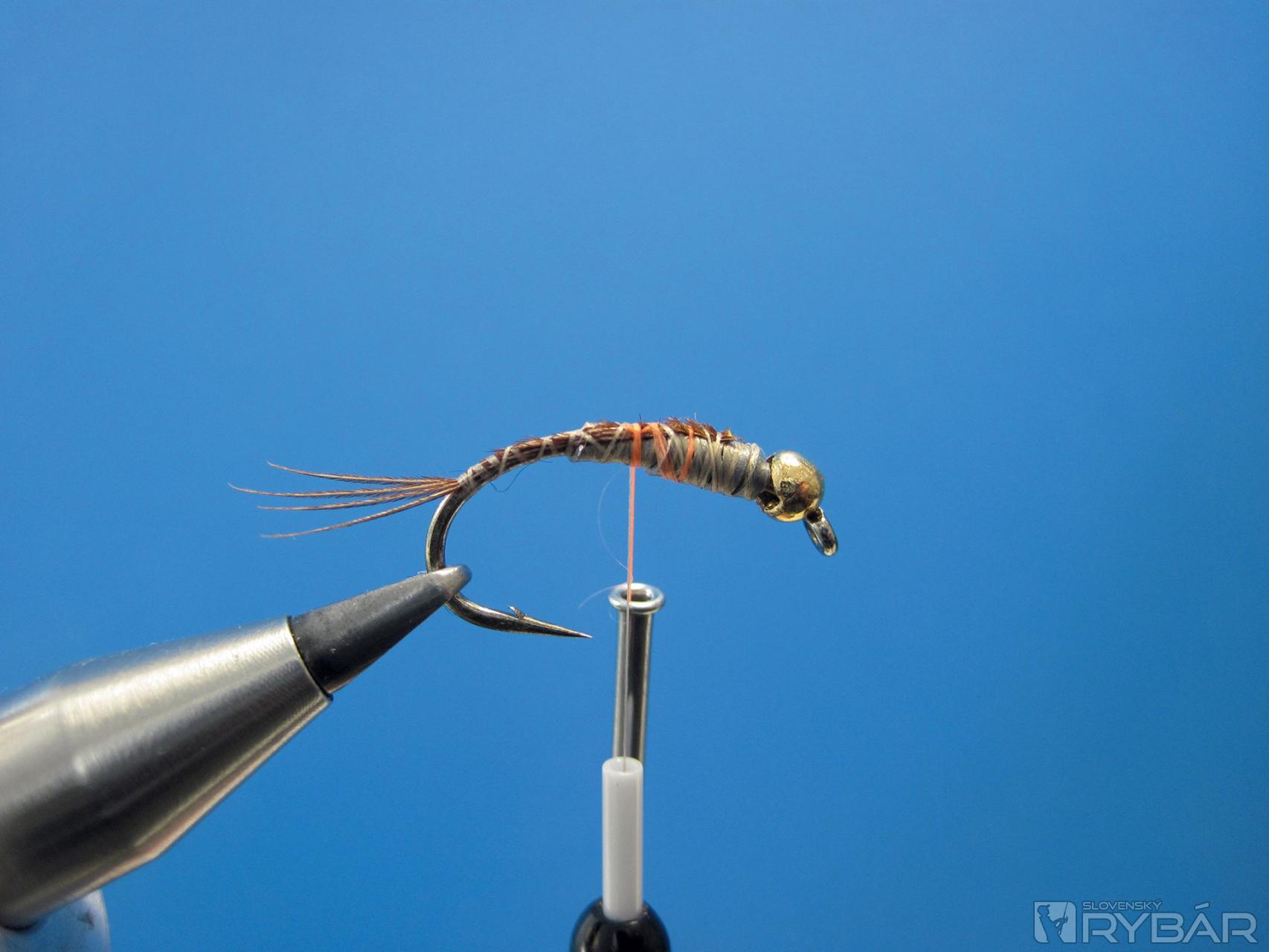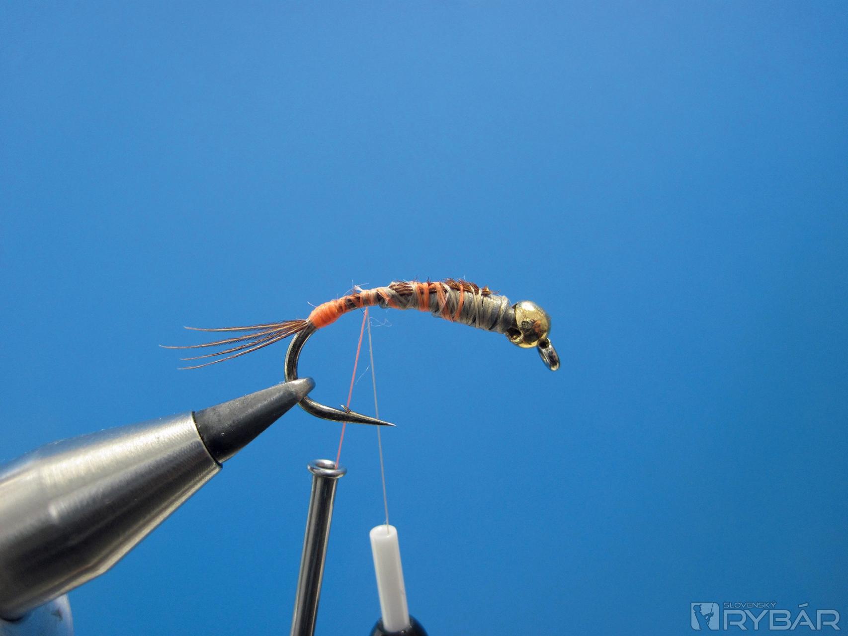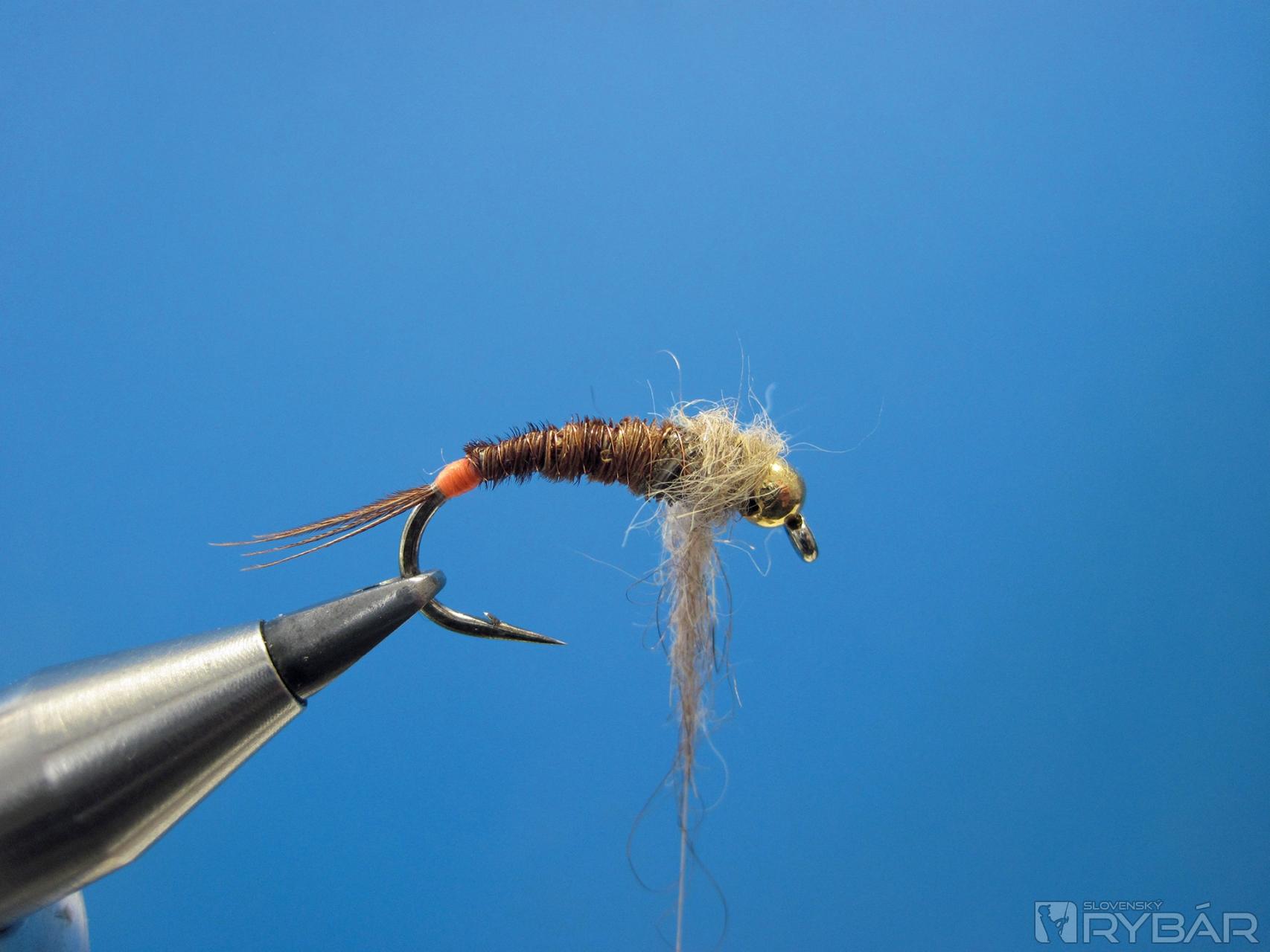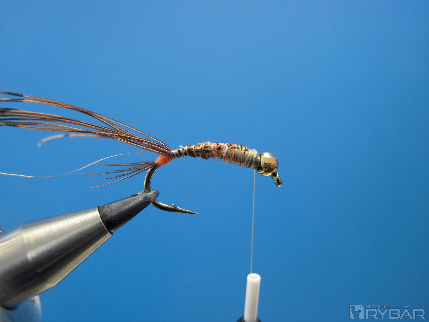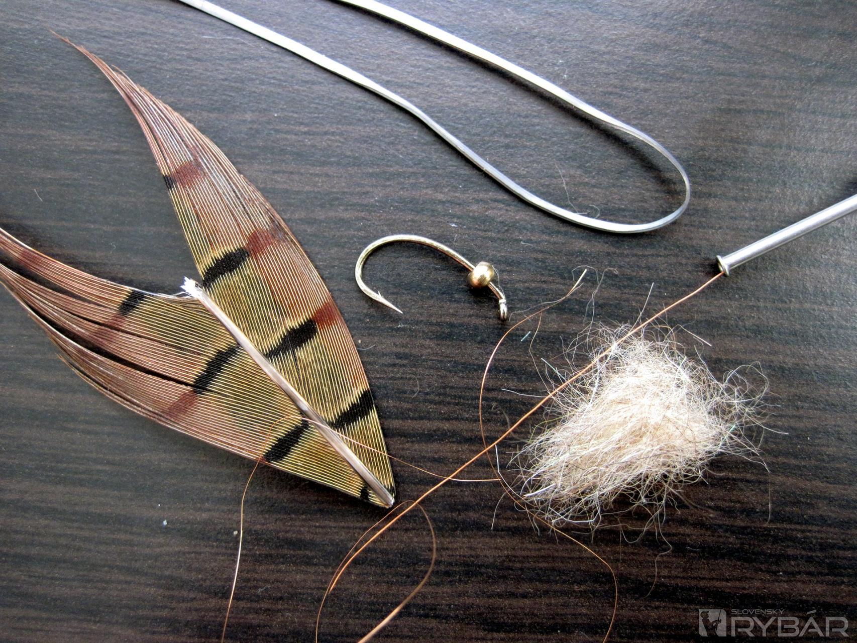 Viazacie materiály: krivákový háčik č. 8, olovený pásik, oranžová viazacia niť, pero z chvosta bažanta, hrubý prírodný dabing, medený drôtik