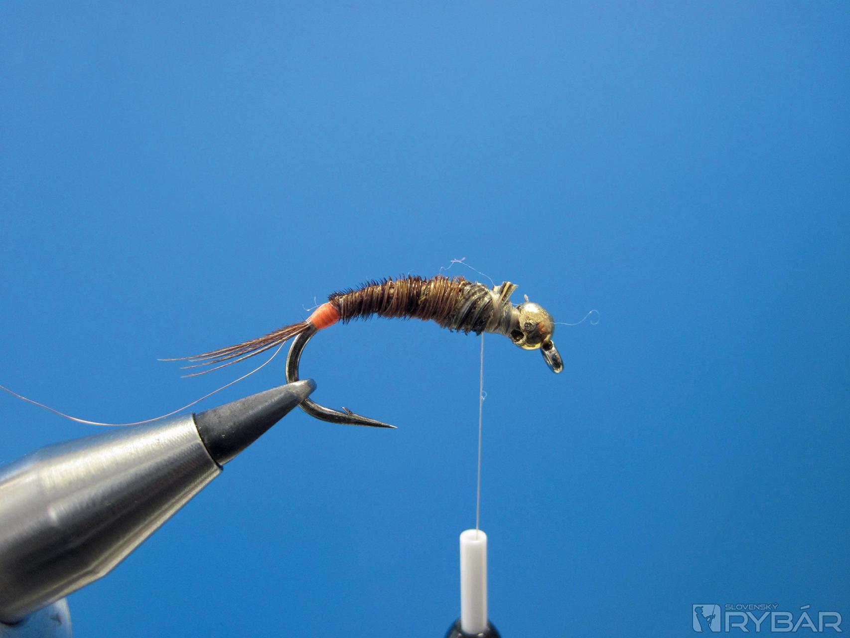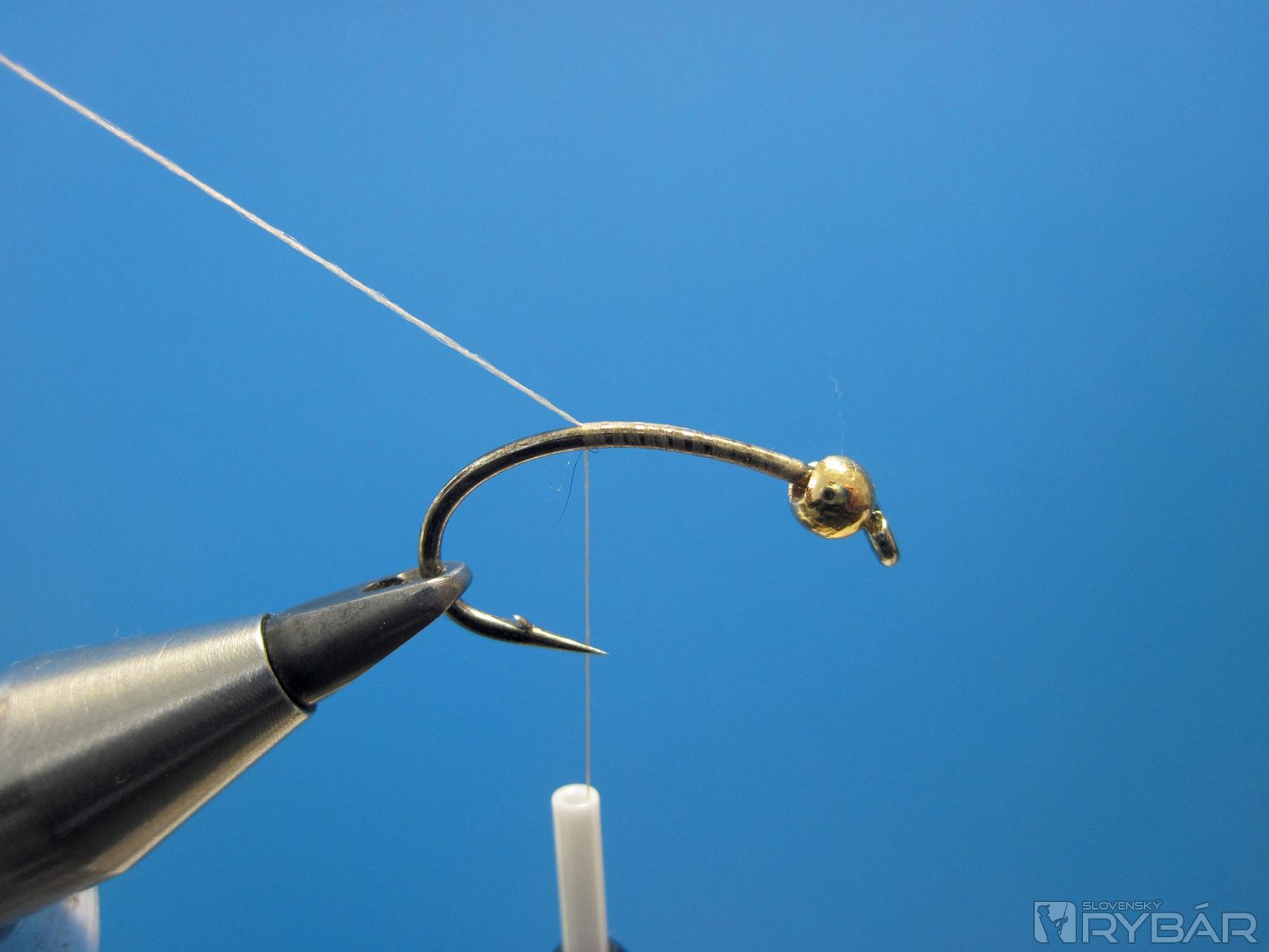 Niťou vyviažeme zadoček mušky a opäť nite prehodíme.