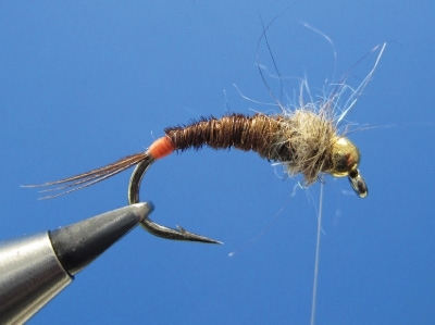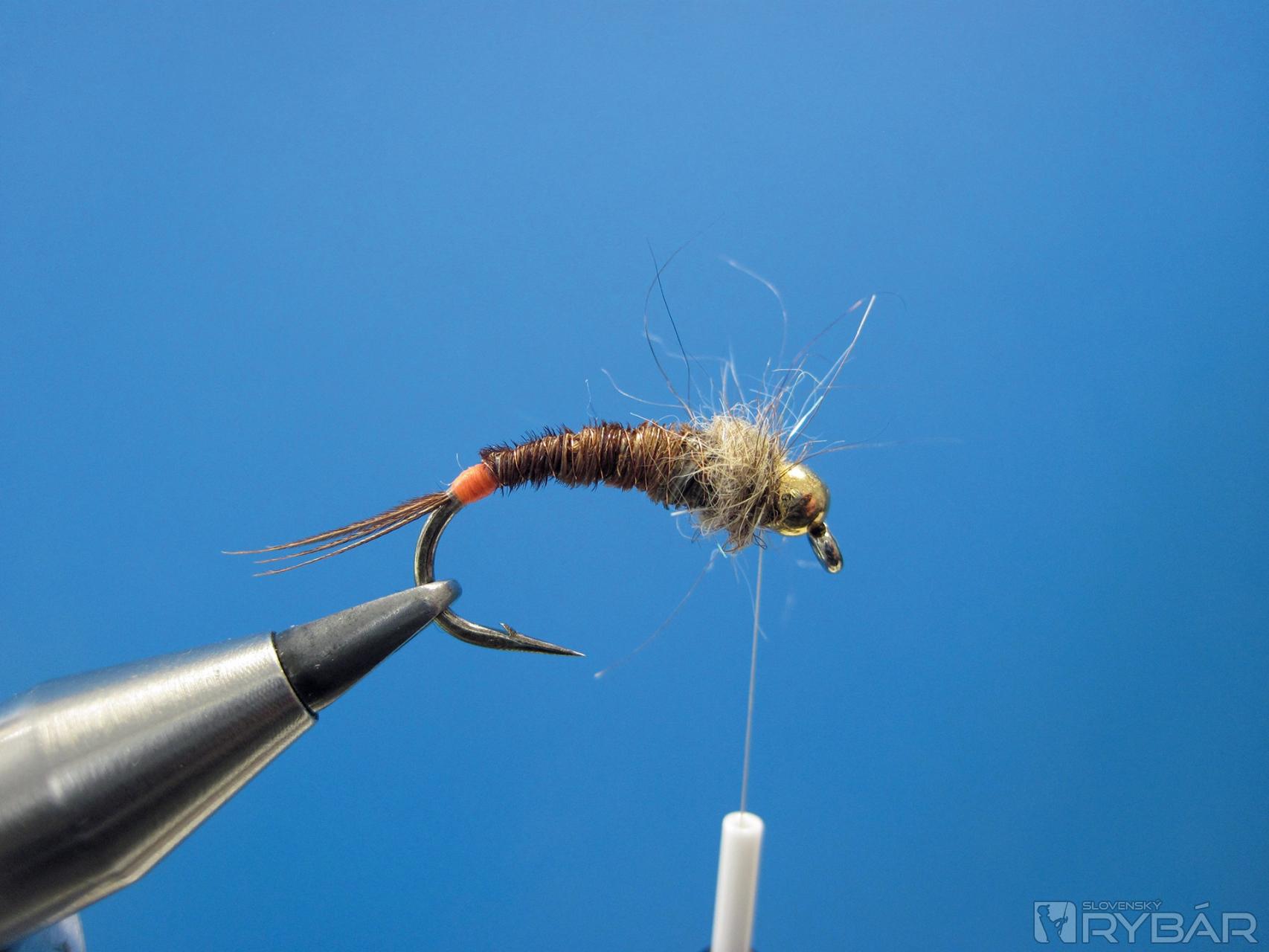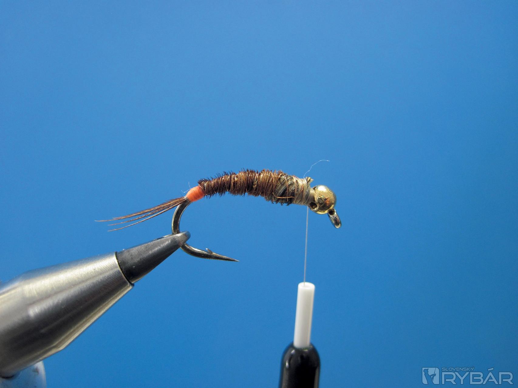 Účelom mušky, ktorú si dnes ukážeme, je predovšetkým dostať ju čo najrýchlejšie na dno. Spravidla používam prírodné vzory v odtieňoch hnedej, olivovej alebo zelenej. Tieto vzory doplním atraktorom, ktorý na tmavom dne na mušku rybu upozorní. Ak sa rozhodnem pre hnedé odtiene, používam najradšej pre výrobu štetov a telíčka prírodné chvostové perá bažanta. Ostatné farby viažem z telíčkovej nite alebo dabingu, ak sa rozhodnete viazať telíčko z nite, je nanajvýš dôležité mať pripravený rovný a pravidelný základ telíčka z olova. Niť dokonale okopíruje tvar telíčka.