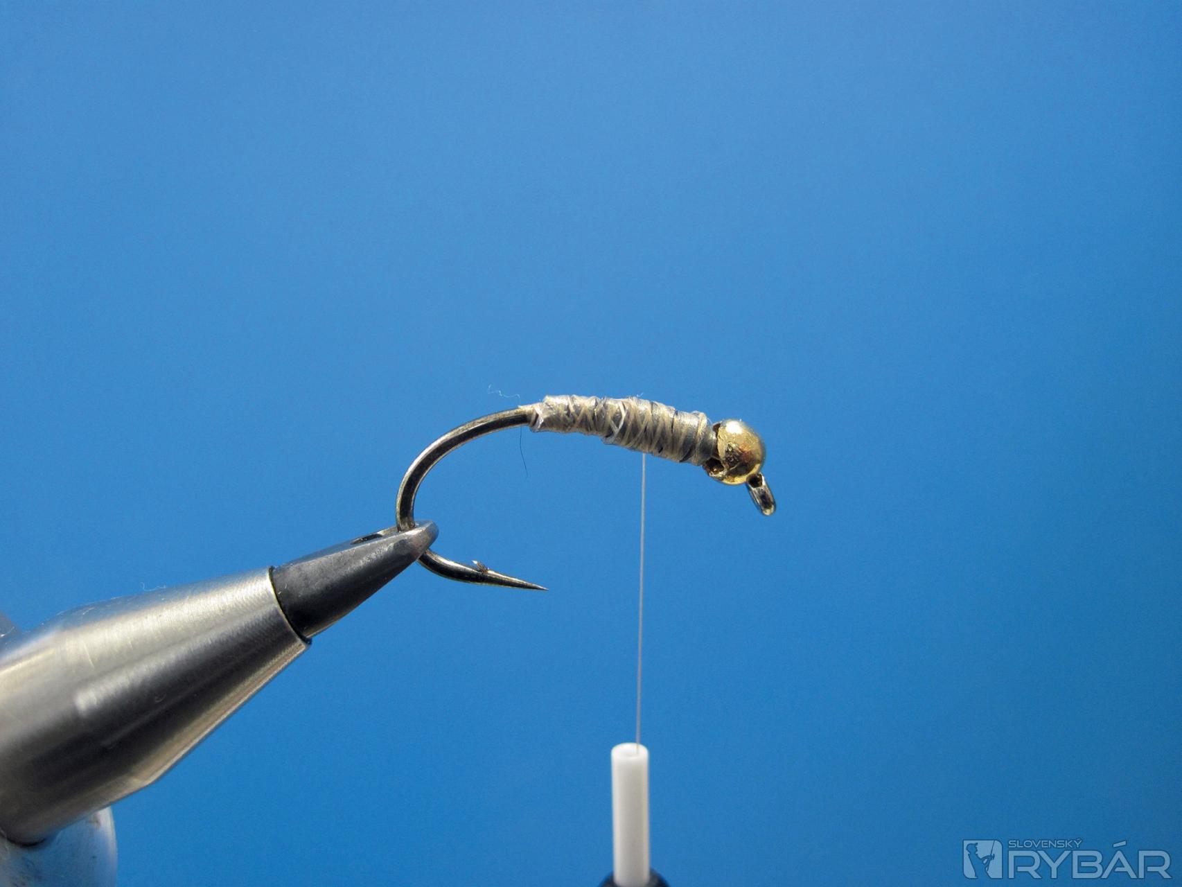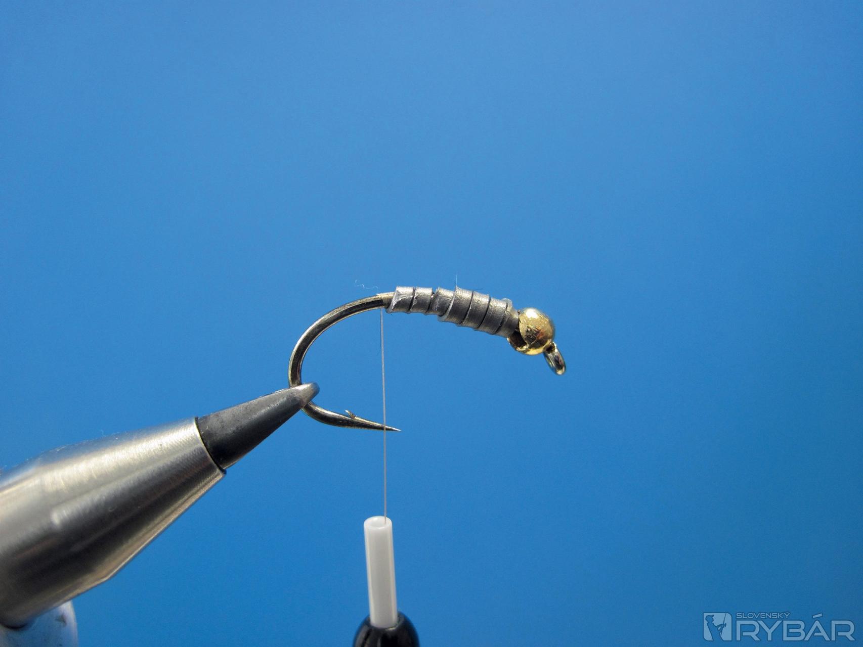 Telíčka týchto záťažových nýmf podkladám jednou alebo viacerými vrstvami oloveného drôtika alebo pásika. Ak sa dostanete v muškárskej predajni k olovenému pásiku, neváhajte po ňom siahnuť a nakúpte si rovno viac balení. Olovený pásik má oproti drôtiku tú výhodu, že sa dá dobre vrstviť a taktiež s ním môžete veľmi ľahko a pohodlne vytvarovať základ telíčka nymfy. Čo sa dá s okrúhlym priemerom drôtika pomerne ťažko.