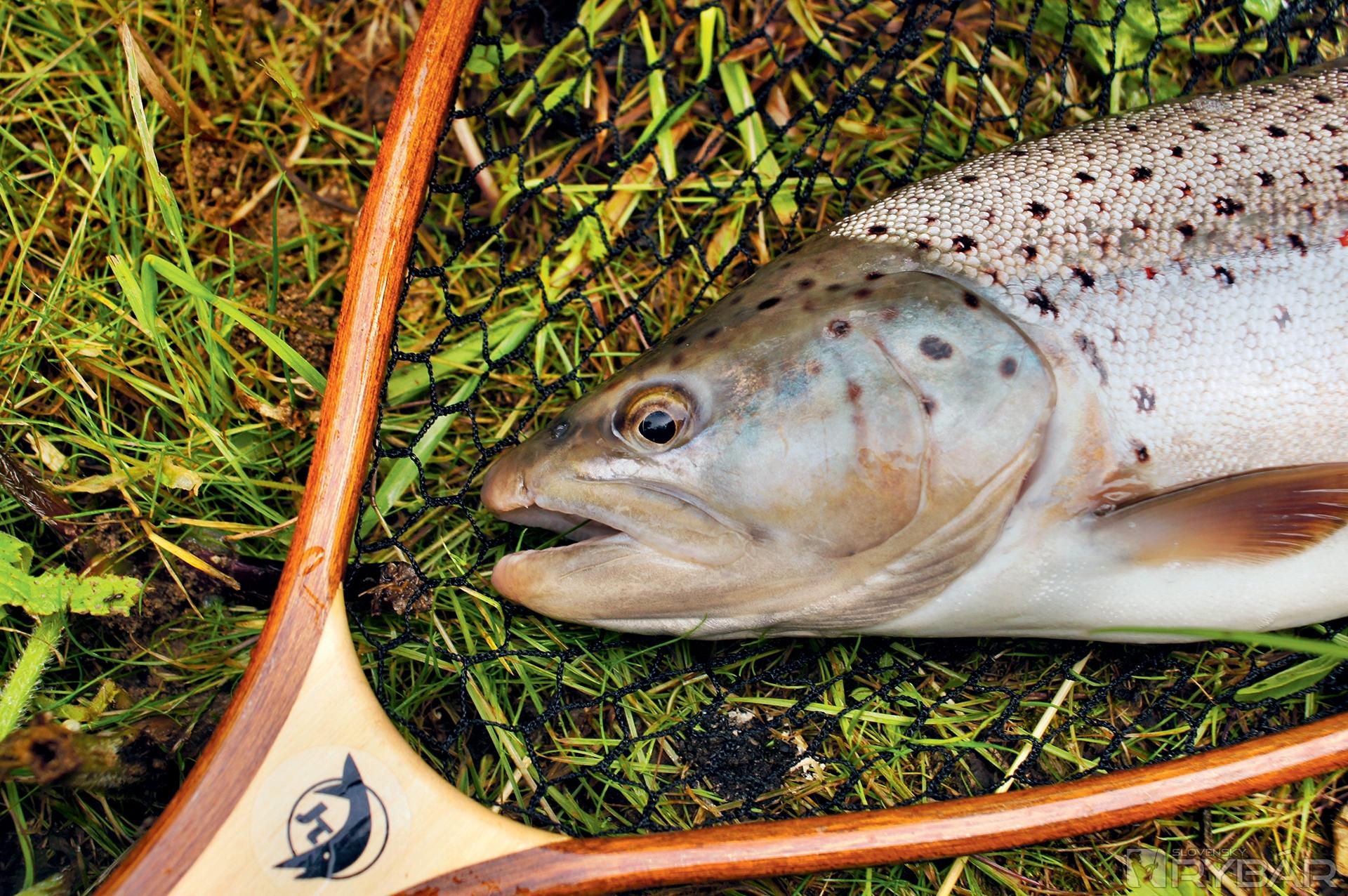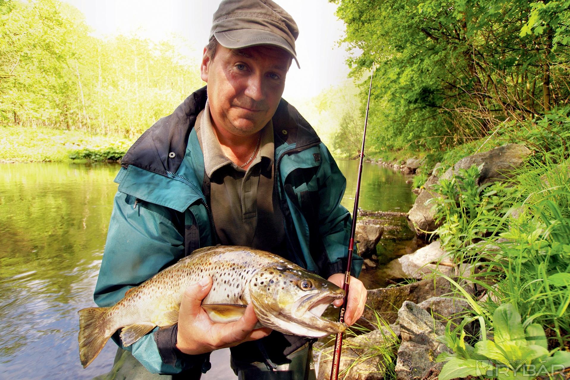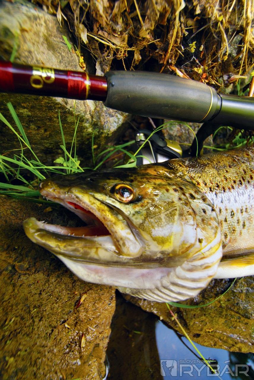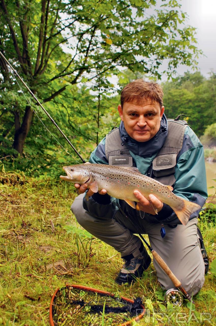 Na malú chvíľu zazriem aj chvostovú plutvu. „Radku! Človeče, to je pstruh?!“ Vykríknem pridusene. Môj hlas však zaniká v hrmení rozdivočenej vody. Napriek tomu však kamarát niečo tuší a volá: „To bude asi veľký jalec. Čo by tu nad splavom robil pstruh?!“ Ryba sa stále snaží unikať od nás. Náhle sa otáča a rozbieha veľkou rýchlosťou po prúde, priamo ku splavu. Až kúsok pred ním sa ryba zľakne a vyskočí. V tesnej blízkosti pred nami sa roztriešti bahnitý prúd rieky a z jeho stredu náhle vyletí pekný pstruh potočný. Je vo výbornej kondícii. Pri ďalšom výskoku mu ide už v ústrety raketový podberák. Je dobojované! Krásna ryba sa na brehu skoro nezdrží. Tri fotky na pamiatku a bezmála polmetrový pstruh sa vracia zase späť do rieky.