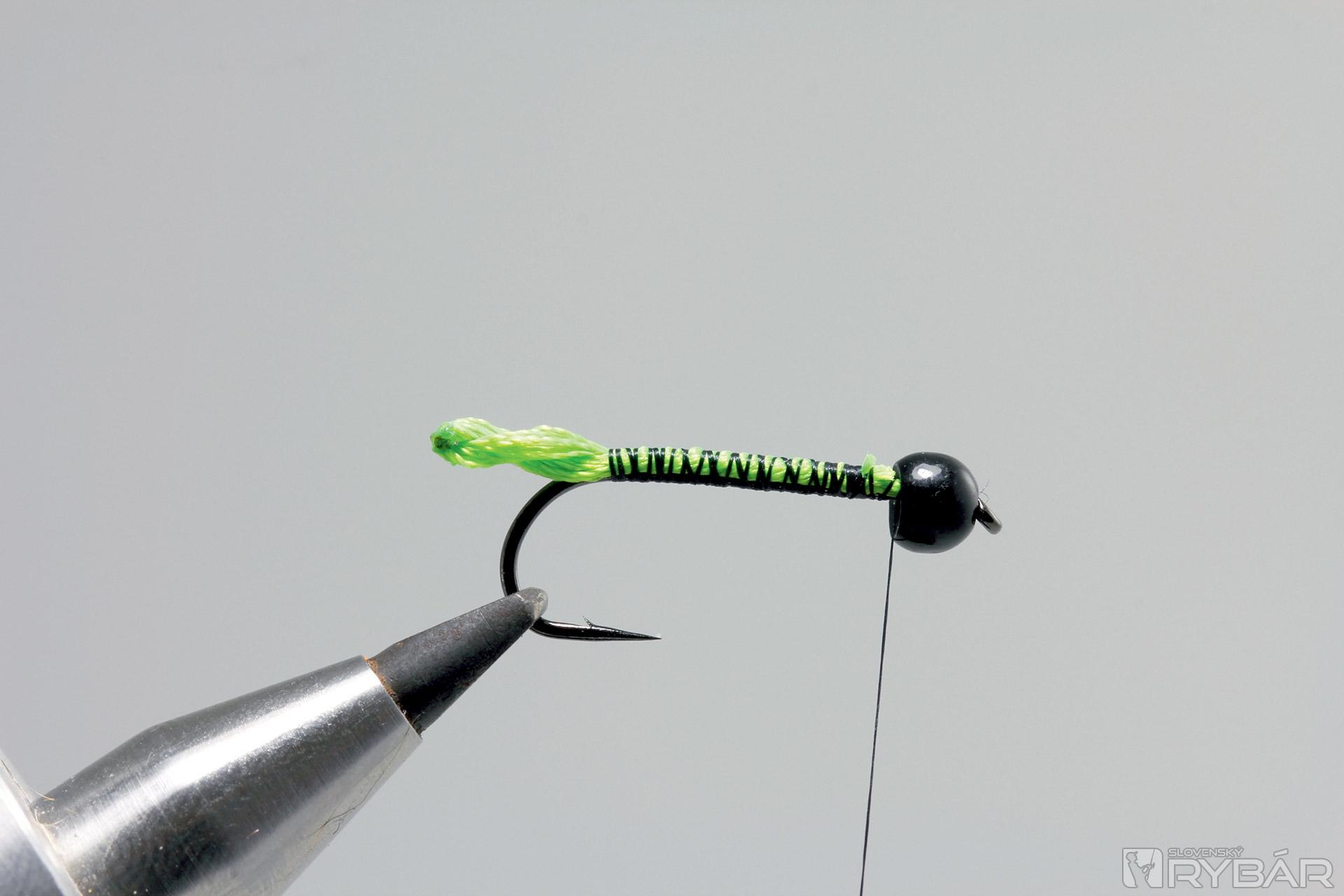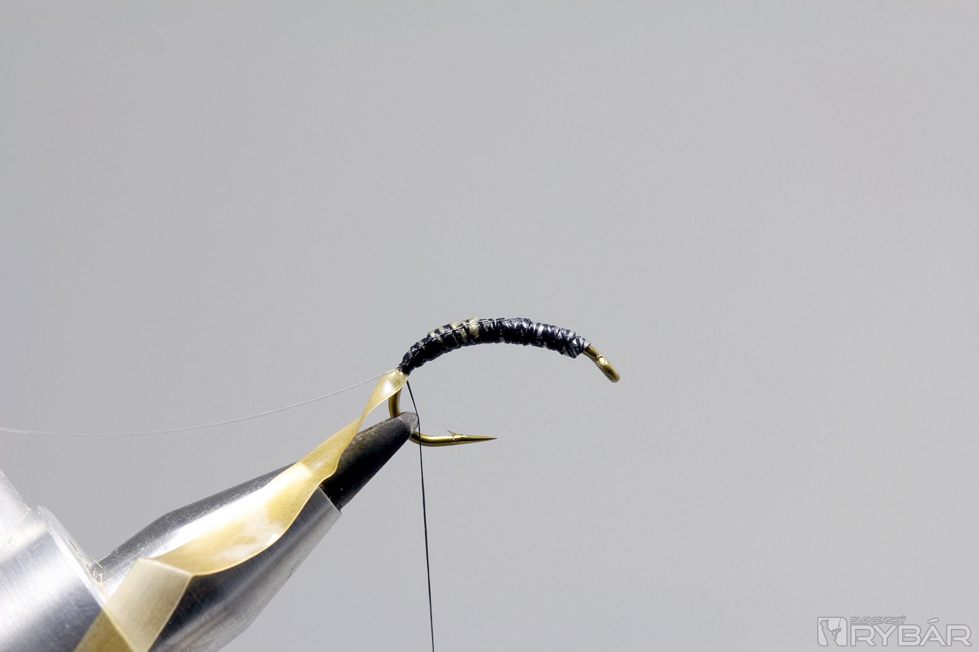 1. Háčik upneme do zveráčika, ovinieme ho oloveným drôtikom a naviažeme chrbátikovú fóliu a vlasec na krúžkovanie.