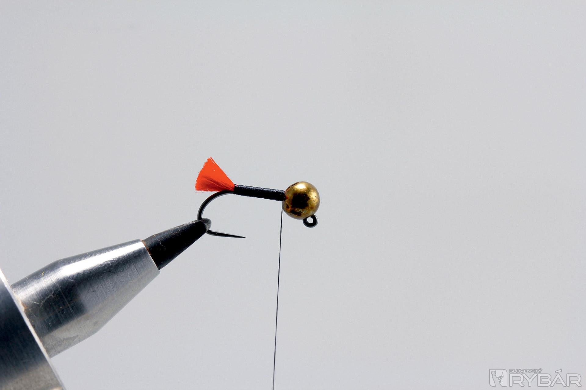1. Háčik s guľôčkou upneme do zveráčika, omotáme oloveným pásikom a naviažeme štety.
