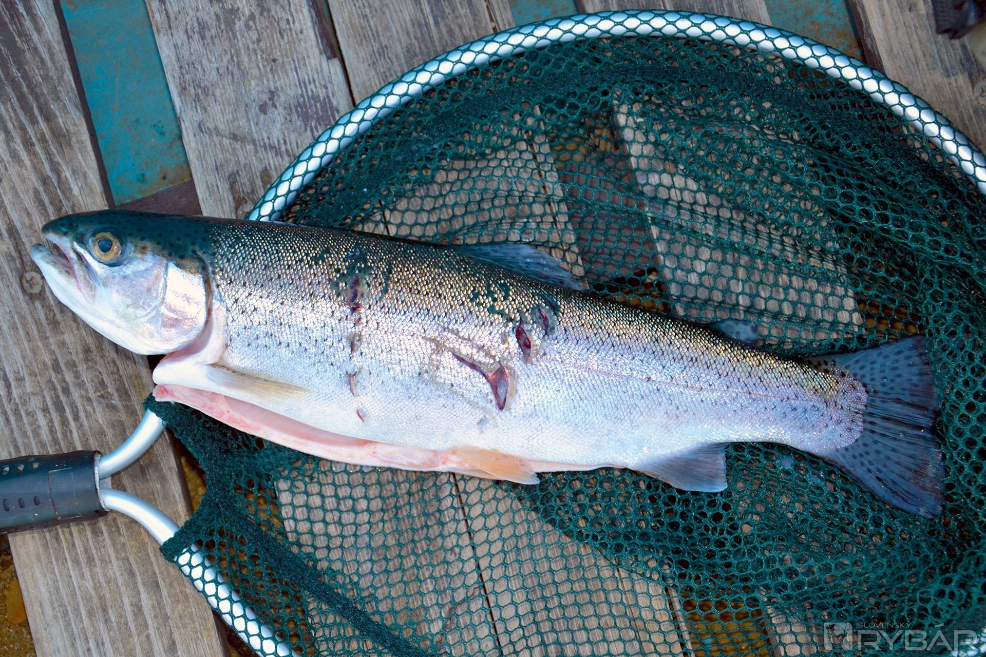 Tento typ rotačky je potrebné sťahovať o niečo rýchlejšie. Pstruhy však nemajú problém nástrahu dostihnúť. Po niekoľkých hodoch dostávam záber a zdolávam pstruha dúhového s dĺžkou okolo 45 cm. Potom sa chvíľu nič nedeje, preväzujem hauzra. Blízko brehu mi ho atakuje pekný potočák, úspešne ho zdolávam. Do skončenia dennej doby lovu zostáva len pár minút, skúsim znova slovlikovku a okamžite ju berie ďalší pstruh potočný. Následne sa ryby rozbehnú cestárovi, no my už balíme. Po skúsenostiach s trojháčikmi bez protihrotov, z ktorých mi padali menšie ryby, konštatujem, že pri väčších salmonidoch prekvapujúco držia. Asi je to dané tým, že väčšia ryba má už hrubšiu výstelku úst ako menšia. Ešte dodám, že kolegovia pri tejto krátkej rybačke „vyhoreli“.