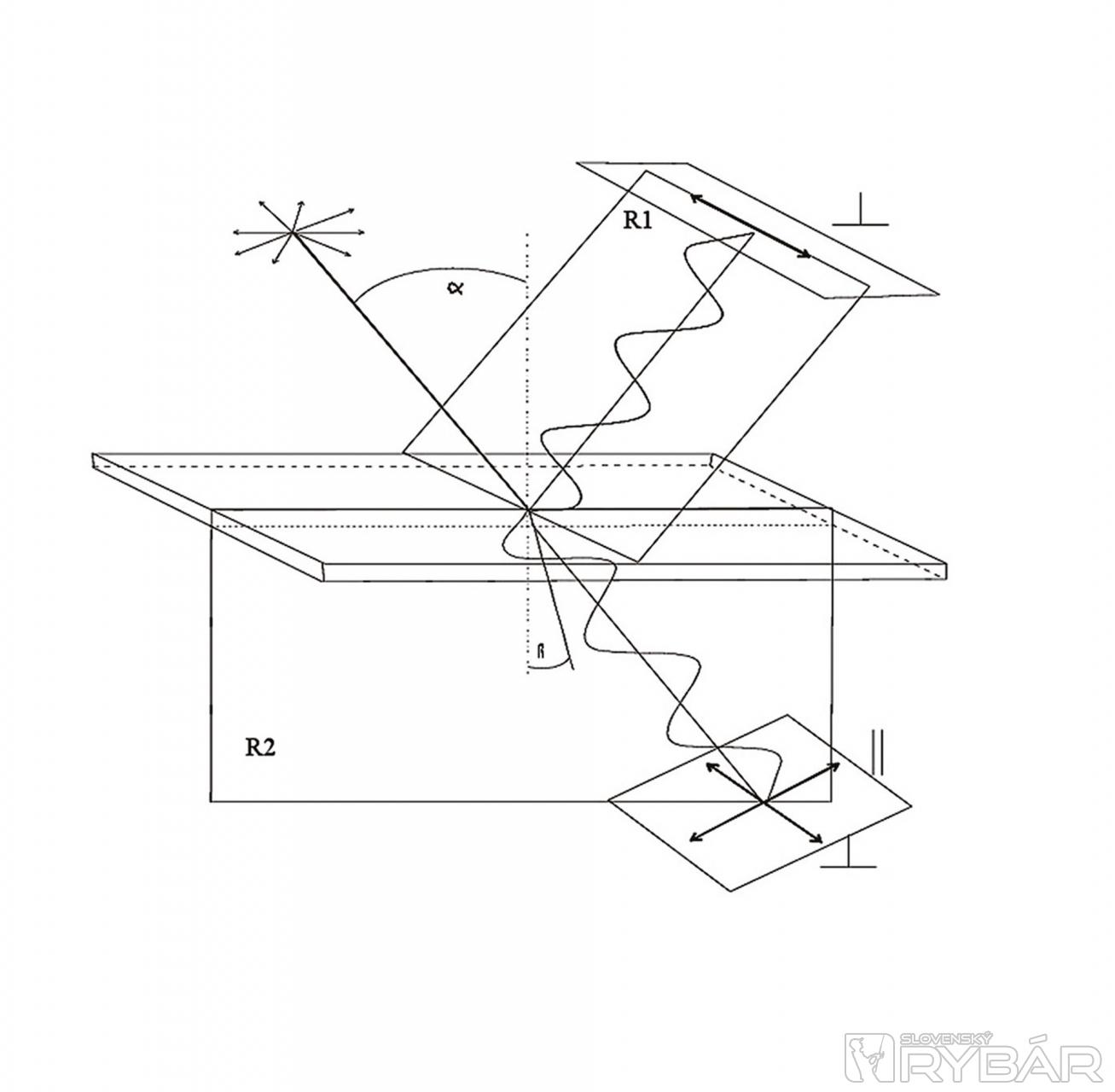 Určite nechcem nikoho nudiť vysvetľovaním fyzikálnych princípov polarizácie. Myslím, že bude postačujúce povedať nasledovné: Svetlo, ktoré pochádza zo slnka, je nepolarizované a kmitá rôznymi smermi. Pri dopade na hladinu vody sa polarizuje. Jednoducho povedané, časť svetla sa šíri vodou a časť sa odrazí. V podstatne väčšej miere sa odráža časť svetla, ktorá kmitá kolmo na rovinu dopadu (R2 na obrázku) t.j. v rovine R1, pohltená časť kmitá v rovine R2. A teraz polopatisticky: svetlo, ktoré sa odrazí a je kolmé na rovinu dopadu, je pre nás to „zlé“ svetlo, sú to tie nami videné odlesky, ktoré nám zabraňujú vidieť pod hladinu. Pohltené svetlo, naopak, osvetľuje vodný stĺpec a umožňuje nám vidieť všetky tie monster ryby, ktoré sa pod hladinou ukrývajú. Veľmi krásny a jednoduchý príklad je hádzanie žabiek alebo koníčkov. Ak hodíme placatú skalu vodorovne s hladinou vody, skala sa nám odrazí. Ak hodíme skalu kolmo na hladinu, hneď sa nám ponorí. A na podobnom princípe funguje aj svetlo. Úlohou polarizačných okuliarov je odstrániť odrazené polarizované svetlo, ktoré nás oslňuje a prekáža pri pohľade pod hladinu. Na to slúži polarizačný filter. Je podobný latkovému plotu, ktorý je zvislo orientovaný, čiže vodorovné polarizované „odleskové“ svetlo zadrží a to dobré svetlo, ktoré je zvislo orientované, prepustí. Preto je dôležité, aby bola fólia v polarizačných okuliaroch v správnom smere, inak by sme videli len odrazy.