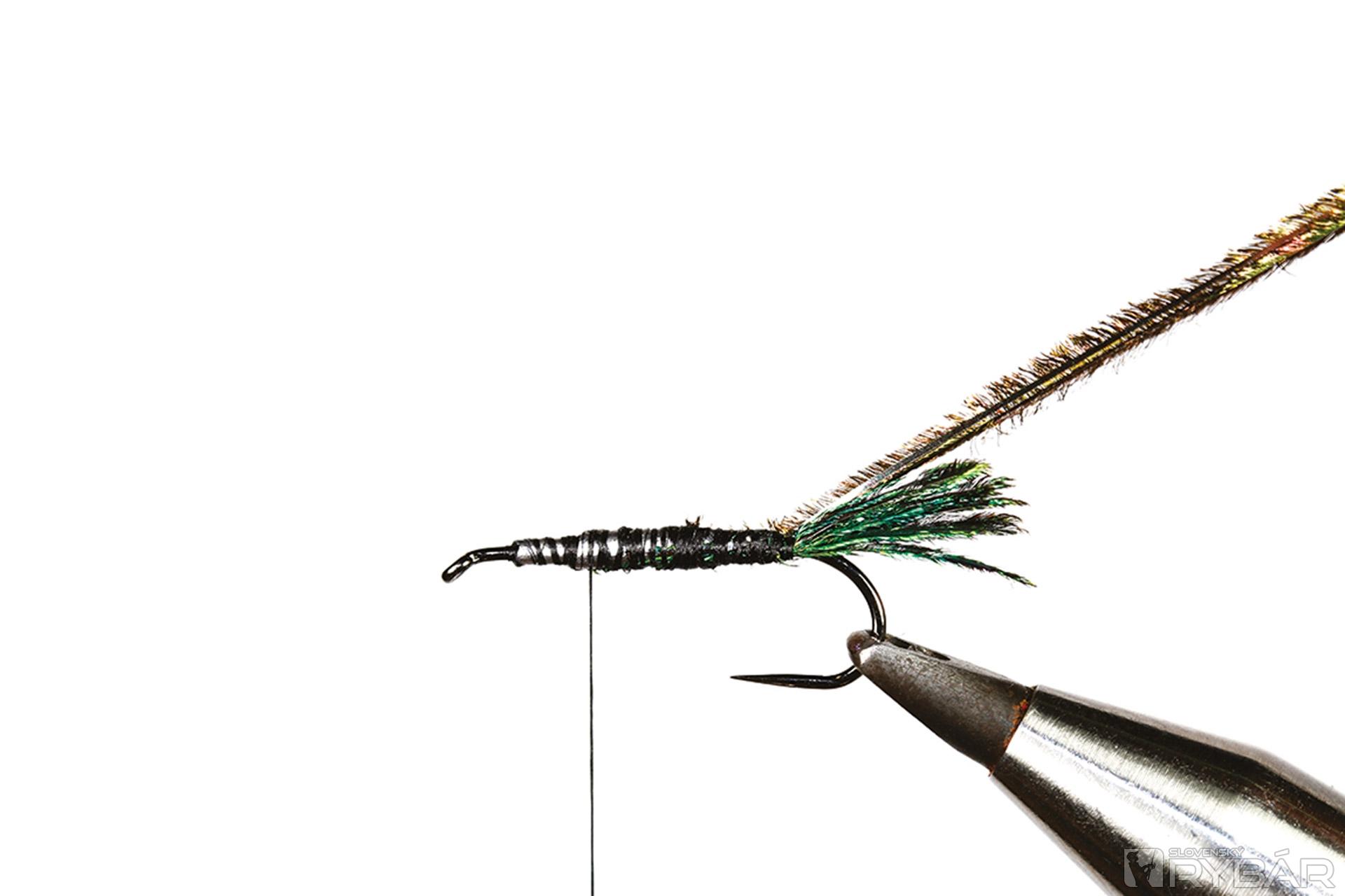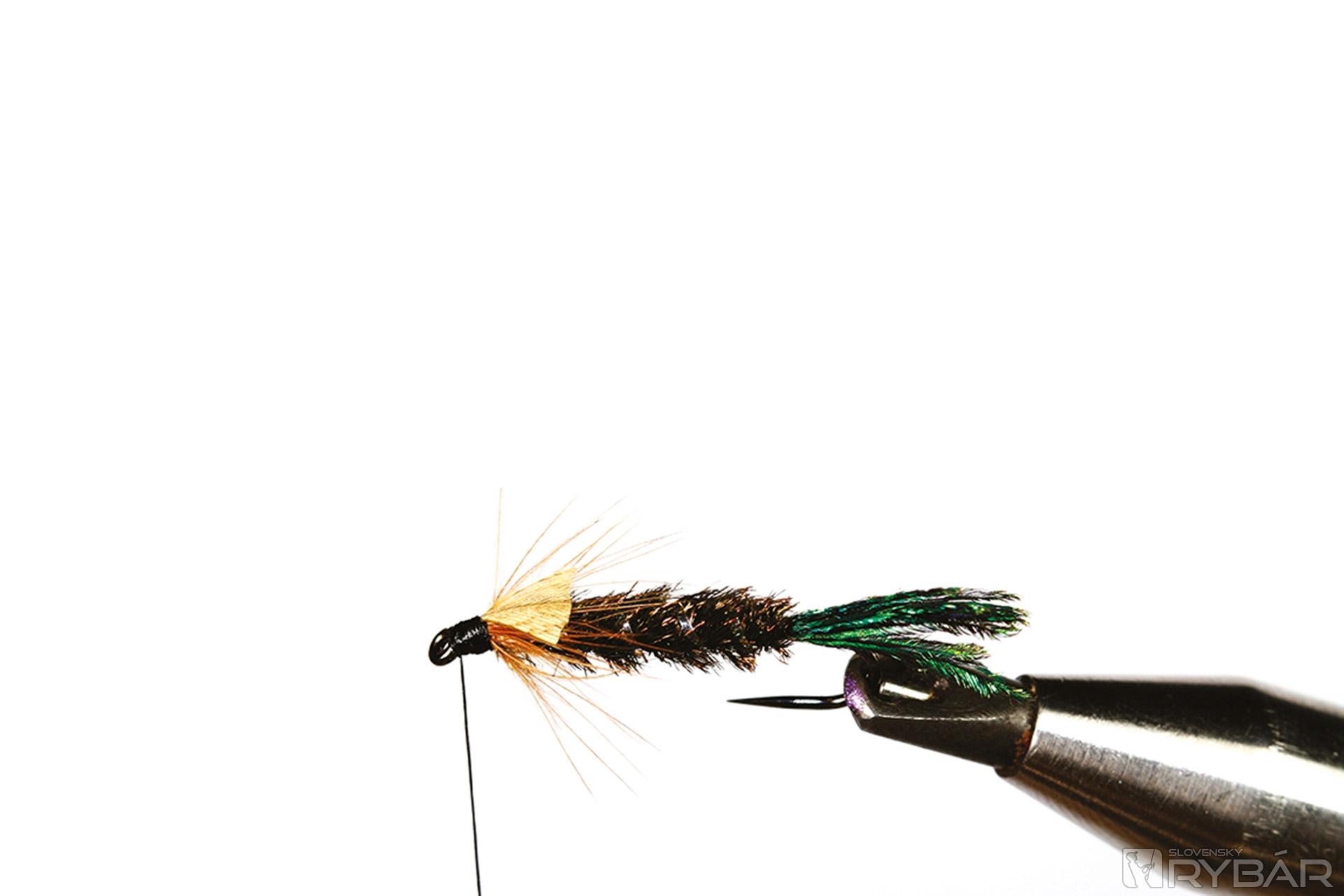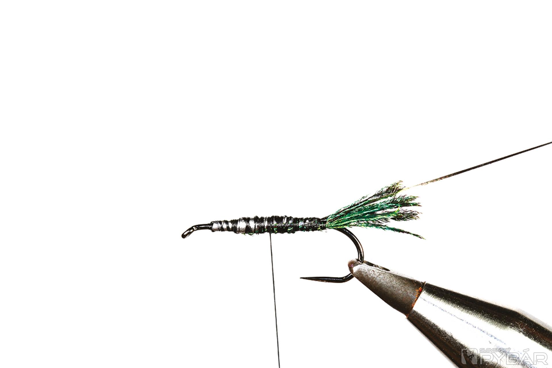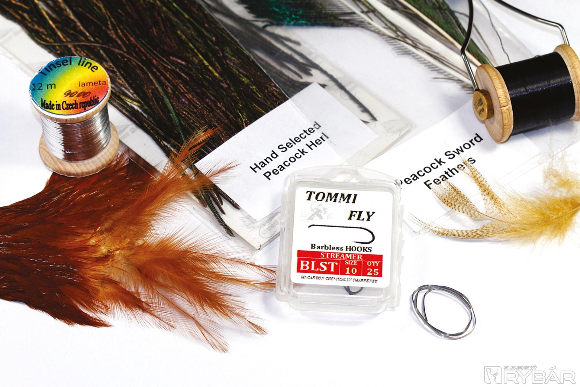 väčší háčik s predĺženým ramienkom, čierna viazacia niť, ploché olovo, pár lúčov z „meča“ páva, perie z chvostového pera páva, strieborná lametka, pierko z hrdzavej sliepky, pero káčera.