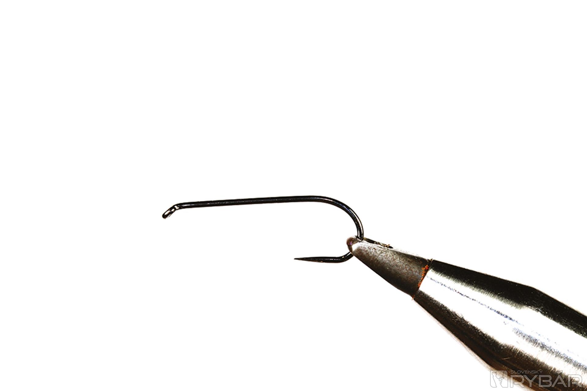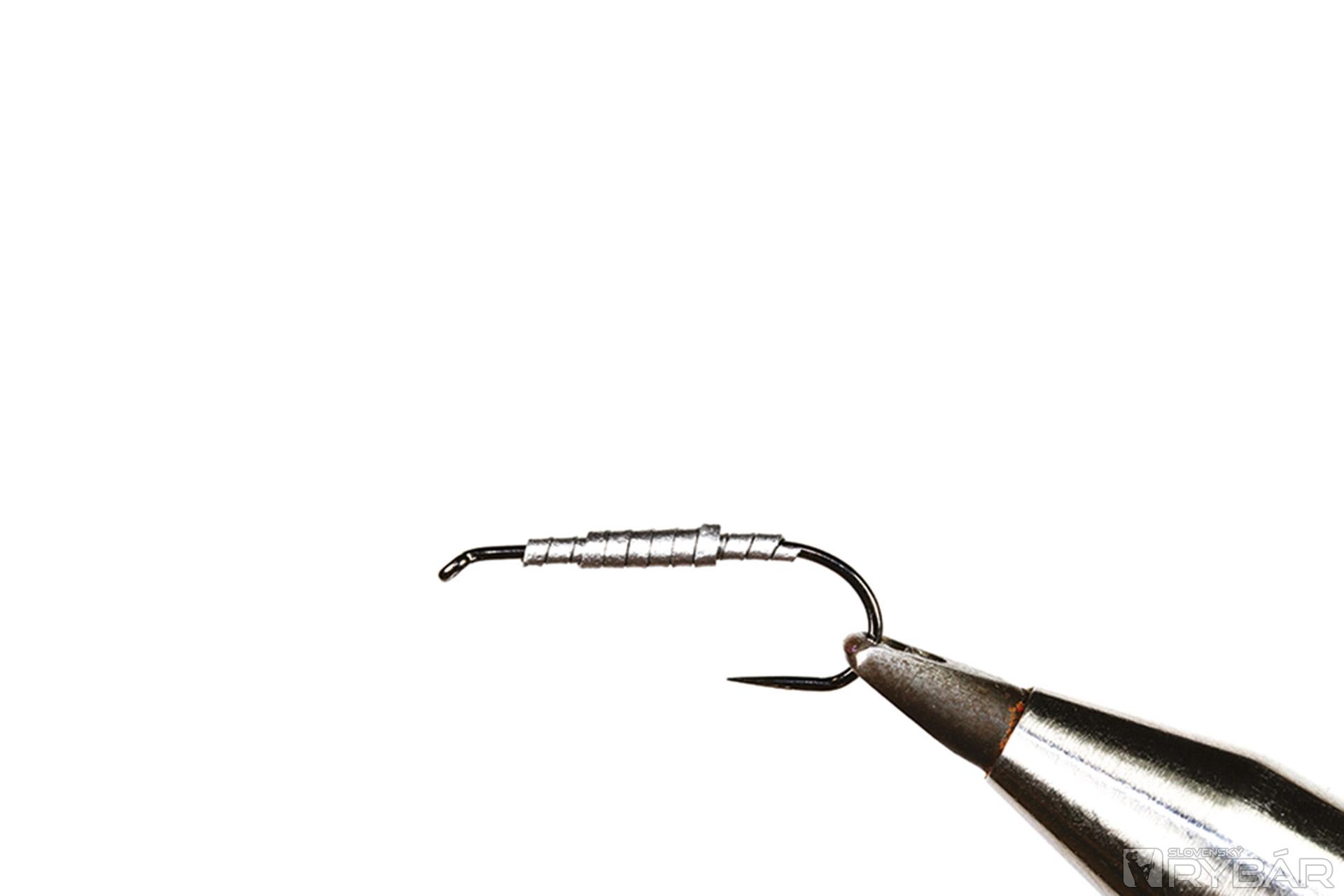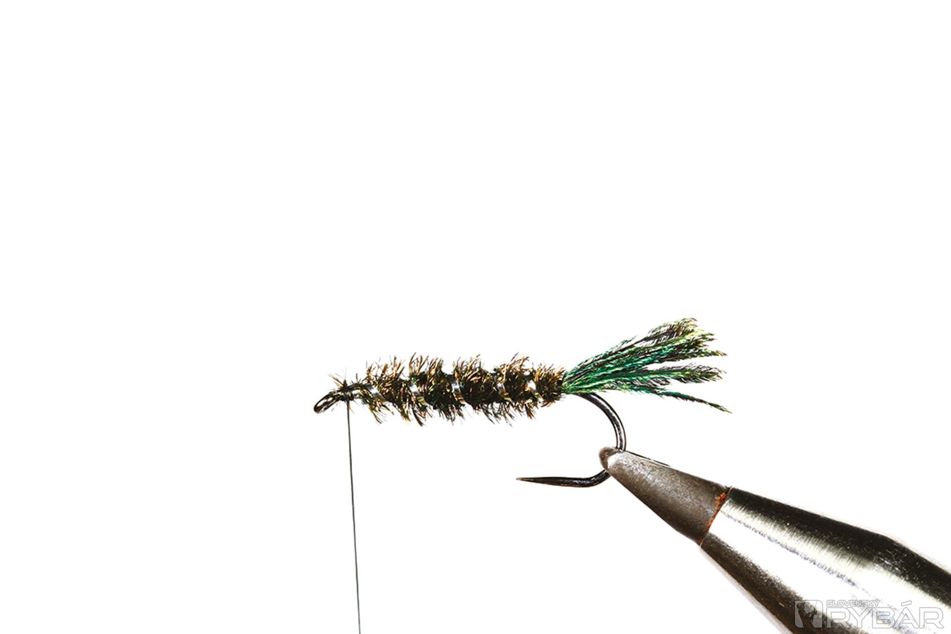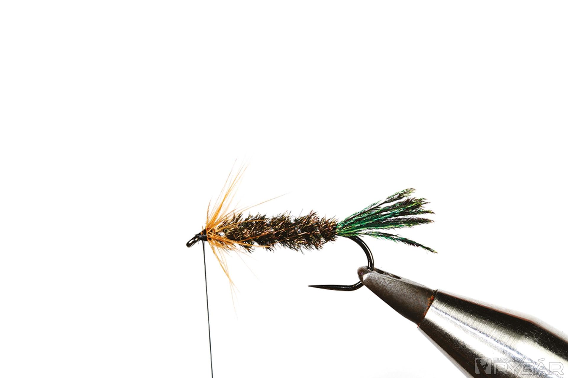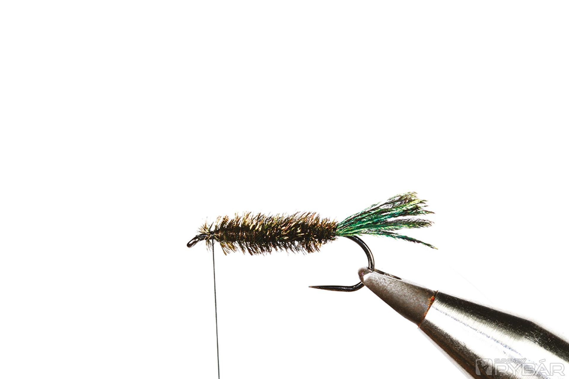 väčší háčik s predĺženým ramienkom, čierna viazacia niť, ploché olovo, pár lúčov z „meča“ páva, perie z chvostového pera páva, strieborná lametka, pierko z hrdzavej sliepky, pero káčera.