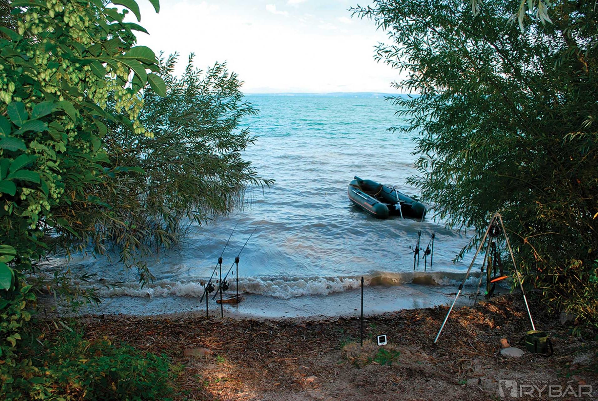 Vráťme sa však k výprave. Na severnom brehu Balatonu je povolené zavážať do vzdialenosti 350 m. Kaprári sa tejto vzdialenosti držia a každý sa snaží vyvážať až na túto hranicu. V mojom prípade to však neznamená, že taktiež budem chytať na takúto diaľku. Nakoľko viacej dní fúkal silný severovýchodný vietor, predpokladal som, že teoreticky by sa mohli tie kapry zdržiavať aj niekde bližšie. Preto som si bójky umiestil na vzdialenosť 150 – 240 m, kde hĺba vody dosahovala hranicu 2,7 – 2,9 m. Na podloží som taktiež nenašiel nič extra. Všade 10 – 15 cm bahnový nános. Asi najväčším problémom bolo ukotvenie člnov, nakoľko vietor nám fúkal takmer oproti a obrovské vlny nám člny vyhadzovali rovno na skalnaté pobrežie.