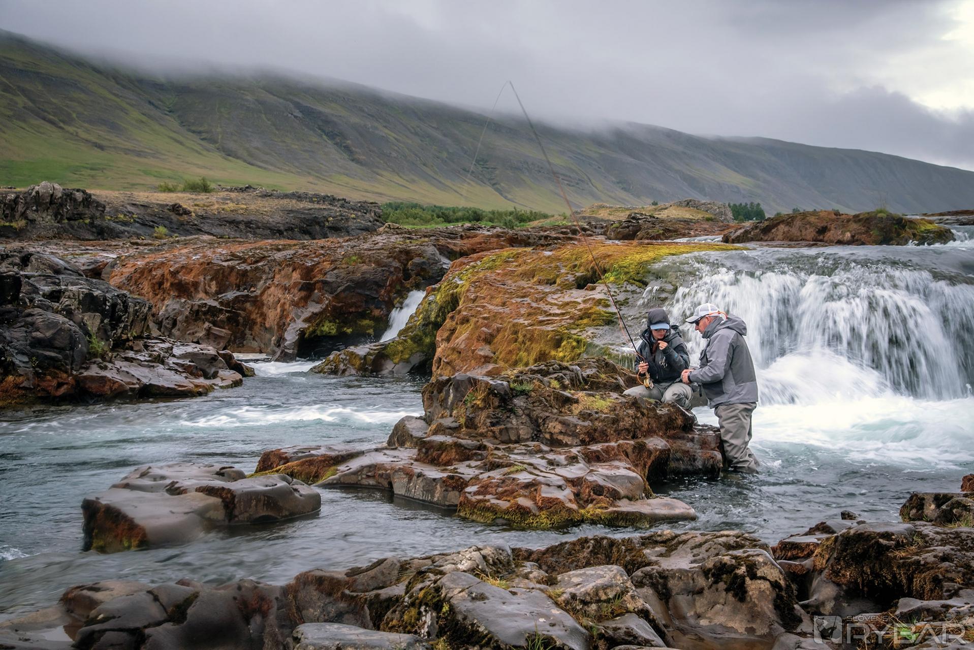 Je to predovšetkým lososia rieka, ale trofejný morský pstruh alebo potočák do 65 cm nie sú výnimkou. O atlantickom lososovi sa hovorí, že je to ryba tisícich nahodení, ale na Islande toto úslovie naozaj neplatí. Nie je problém uloviť aj 20 lososov za deň. Vzhľadom na veľkosť rieky používame iba jednoručné prúty a islandské lososie muchy sú úplne odlišné od tých ostatných, ktoré sa používajú napríklad v Nórsku alebo v Rusku. Najčastejšie sa používajú malé lososie mušky na háčiky veľkosti 16, 18 či 20. Veľkosti mušiek zodpovedá aj nadväzcový materiál (0,18 mm – 0,27 mm). Ak použijete mušku väčšiu, typu Collie Dog či Sunray Shadow, riskujete, že lososy vyplašíte a tie zostanú neaktívne minimálne do konca dňa. Rovnako ako klasické suché muchy typu chrostík, osvedčili sa aj bažantie nymfy alebo orange tagy, ktoré nekompromisne berú aj zafarbené lososy a morské pstruhy, ktoré v rieke bývajú už nejaký ten piatok.