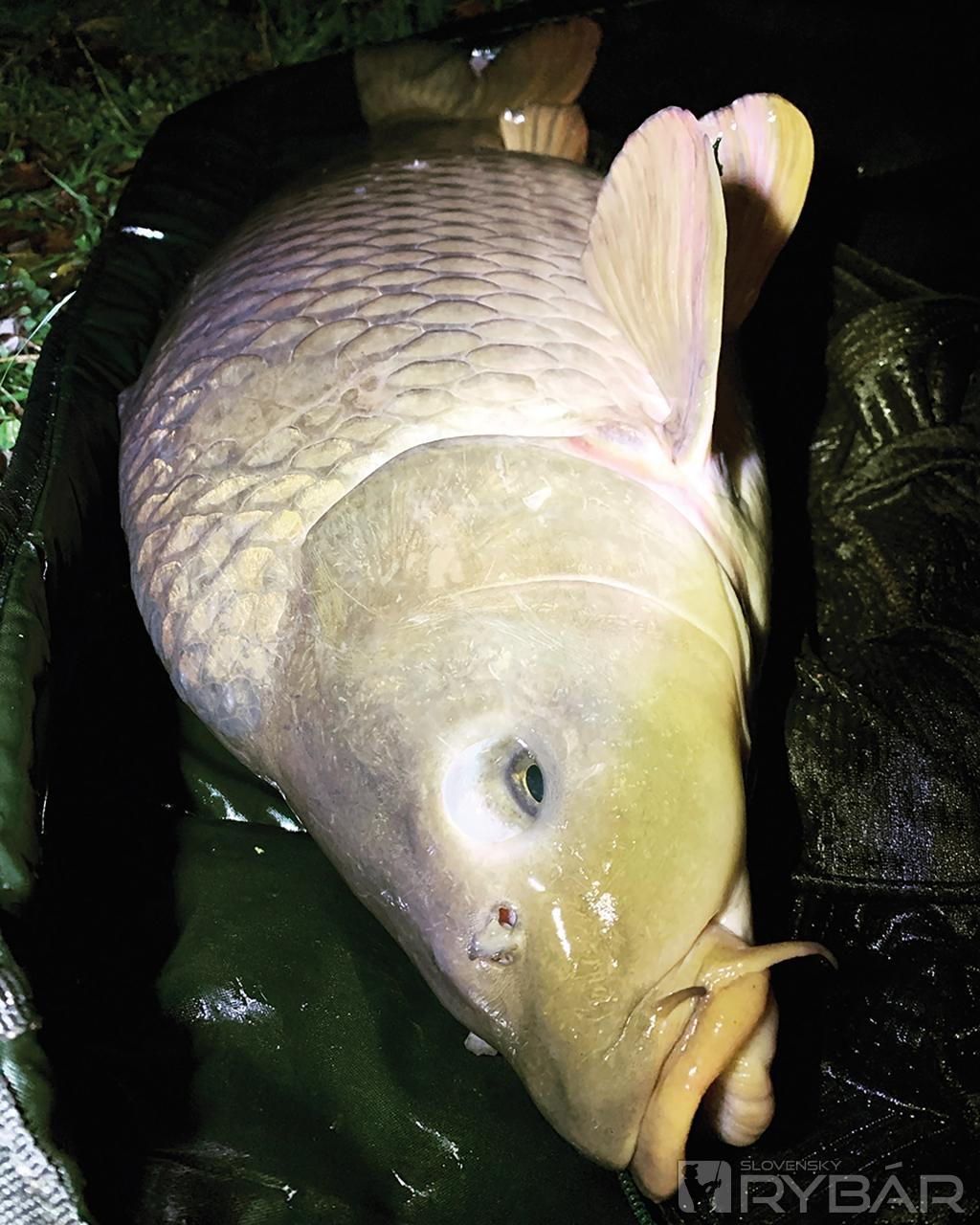 Opäť som nahodil a chvíľu sledoval krásy prírody, ktorá bola navôkol. Všade lietali vtáky, slimáky hľadali útočisko v mojej podložke a podberáku a kúsok ďalej v blízkej zátoke sa vo vode naháňali ondatry. Približne po hodine a pol od prvého záberu sa rozbehla cievka na druhej udici. Tentoraz som si dal väčší pozor na to, aby som rybu skôr otočil smerom k sebe a dúfal, že ju v tomto prípade zdolám. Bol som veľmi prekvapený, aký boj to bol, no v momente, keď už bol kapor v podberáku, vydýchol som si a na brehu bol krásny šupík. Miesto bolo už pomerne vyplašené, preto som sa rozhodol prikŕmiť a nechať ryby na pokoji, nech si dajú dobrú večeru.