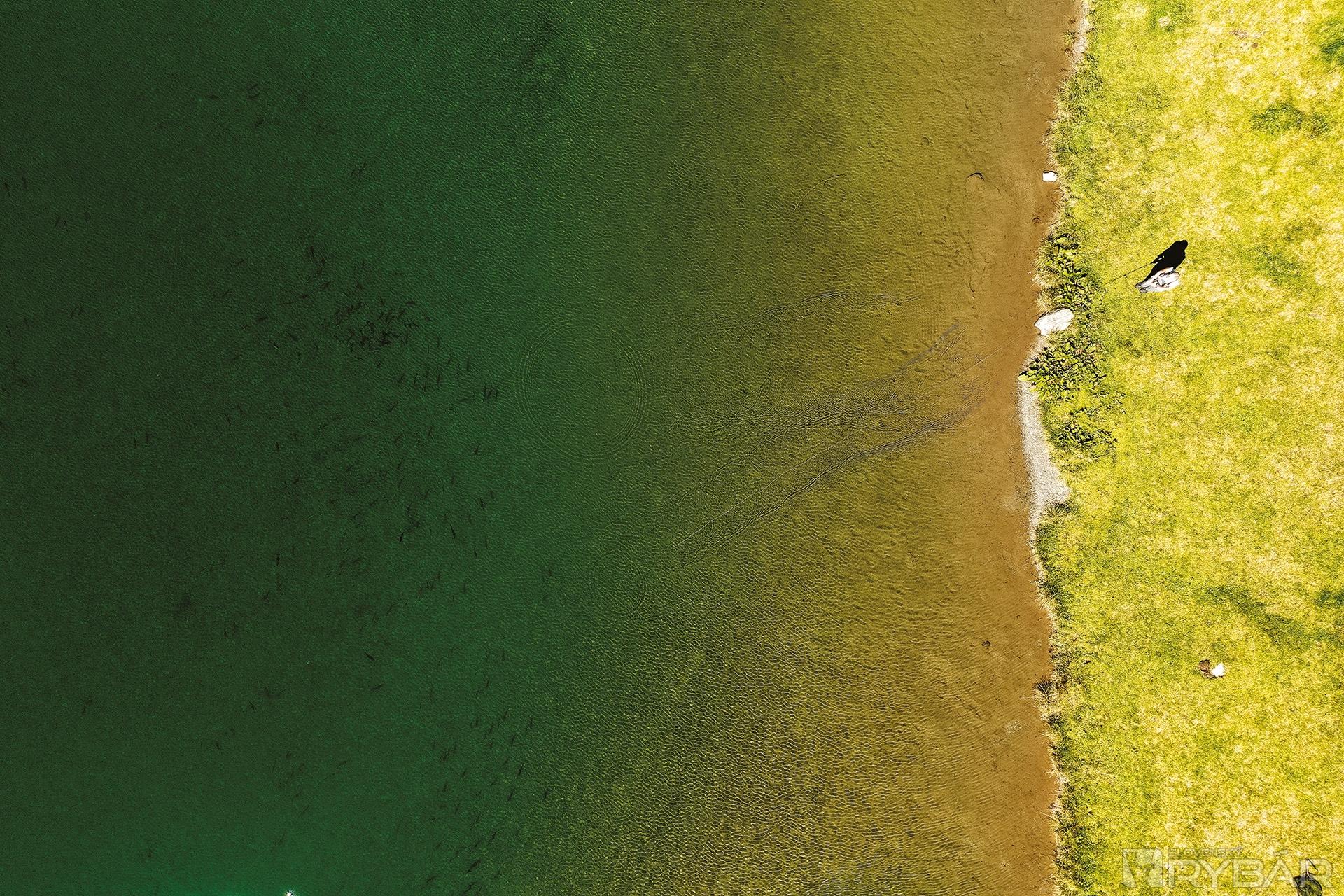 Na ľavej strane jazera je strmý svah porastený stromami, pomedzi ne môžete vidieť množstvo rýb rôznych veľkostí od malých sivoňov až po veľké jazerné pstruhy. Pstruhy jazerné sa vyvinuli zo pstruhov potočných. Je notoricky známe, že je ťažké ich chytiť a väčšinou budete musieť nahodiť dlhú potápajúcu šnúru s ťažšími strímrami a ťahať ich až do plytčiny. Bolo mi povedané, že jesenný rybolov je správny čas na ich lov, lebo začnú migrovať do riek, aby sa rozmnožili, a preto sa hojne kŕmia a sú v tomto ročnom období agresívnejšie.