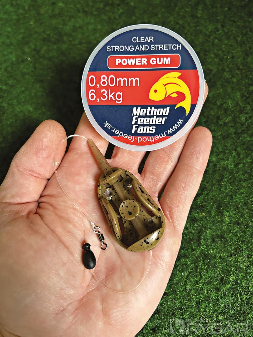 Montáž power gumy je jednoduchá a zvládne ju takmer každý. Na jednom konci jednoduchým bezuzlovým spojom pripevníme obratlík alebo spojku quick change, vďaka ktorej budeme mať zjednodušenú výmenu nadväzcov. Gumu prevlečieme cez krmítko. Na druhom konci rovnakým spôsobom uviažeme obratlík. Alternatívou k tejto montáži je aj kratšia guma vložená iba do trubičky krmítka, navrchu zakončená obratlíkom.