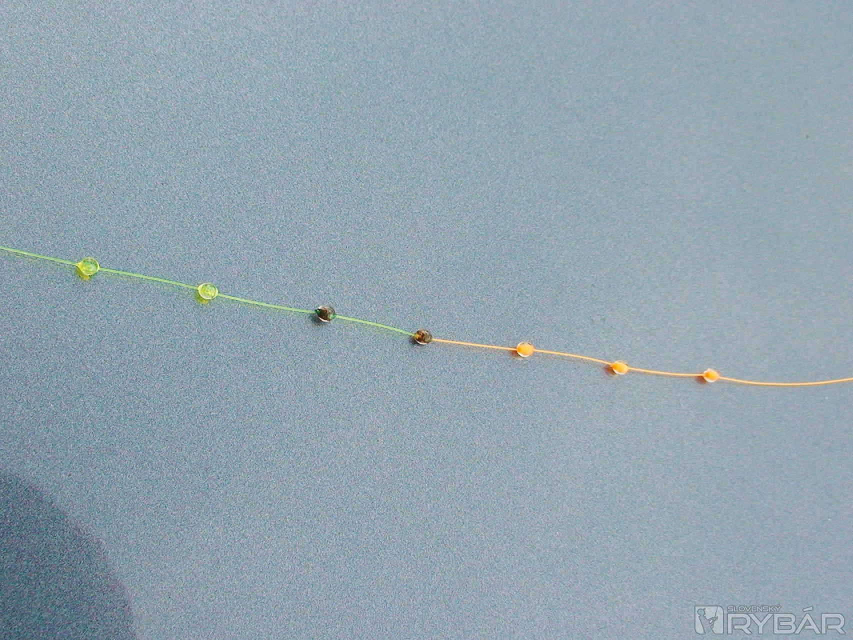 Na indikáciu záberu mi slúži farebný silon s 5-6 uzlíkmi (celkovo 5-10 cm), ktoré robia čiastočne hmotnosť, ale ich aj lepšie vidím. Na spojenie tohto indikátora so silonom môžeme použiť titánové mikrokrúžky, alebo len pružný uzol. Koniec indikátora (ten k muškám) je lepšie ukončiť mikrokrúžkom, lebo ďalej potrebujem napojiť tenký fluorocarbon (podľa potreby priemer od 0,09 do 0,15 mm).